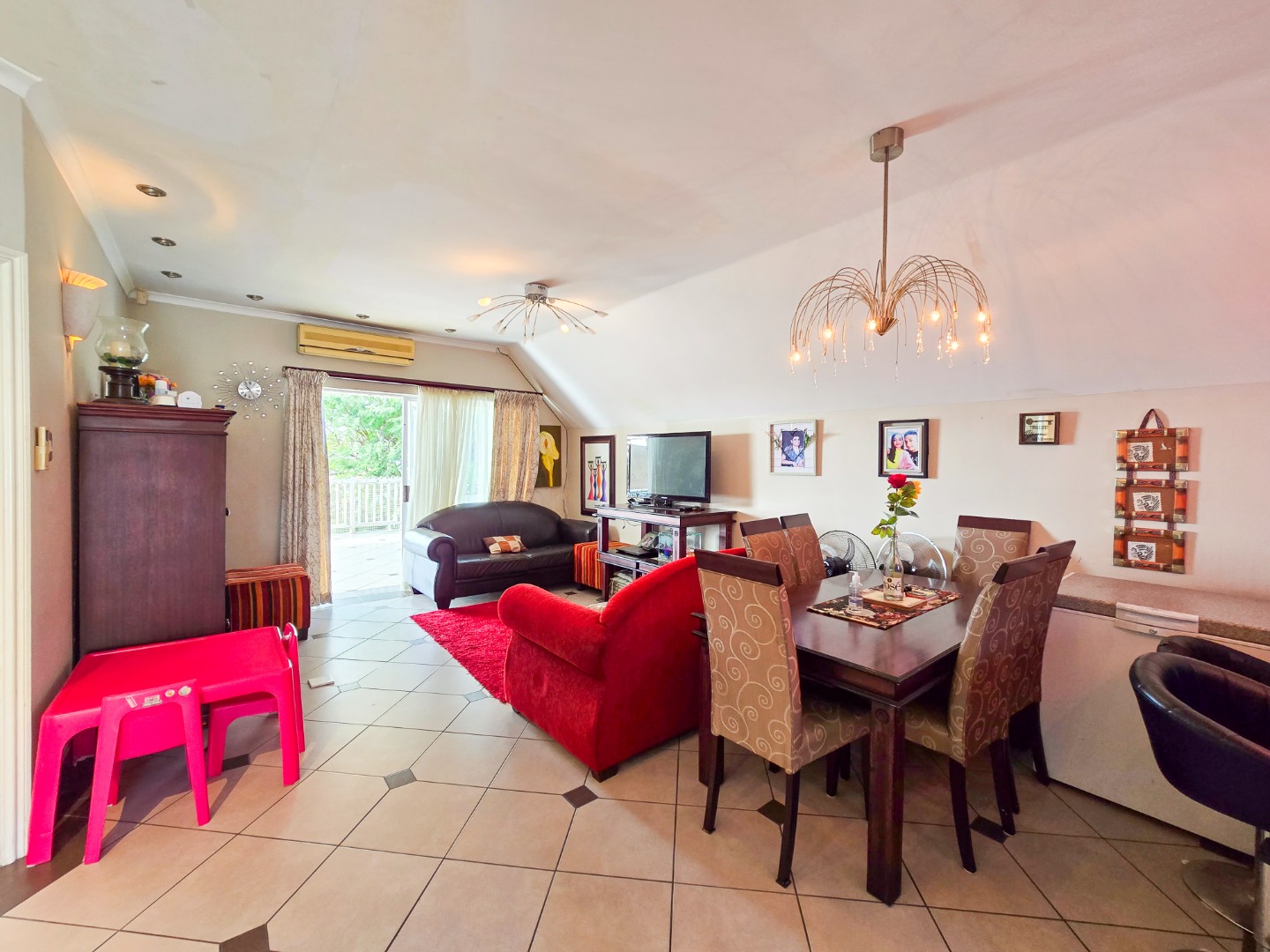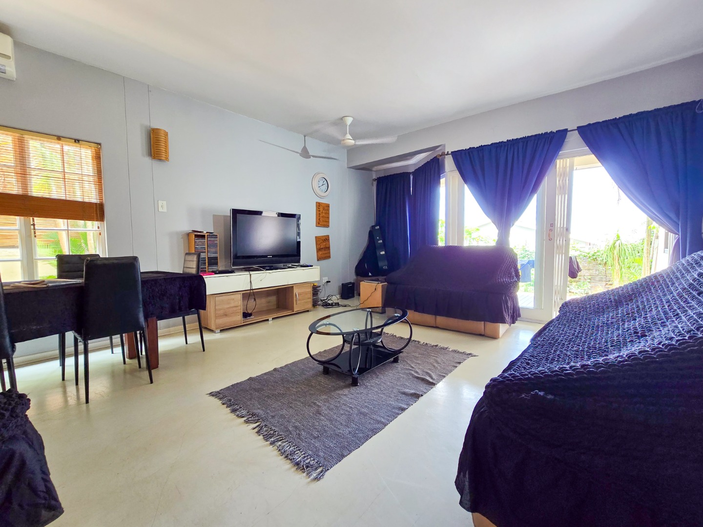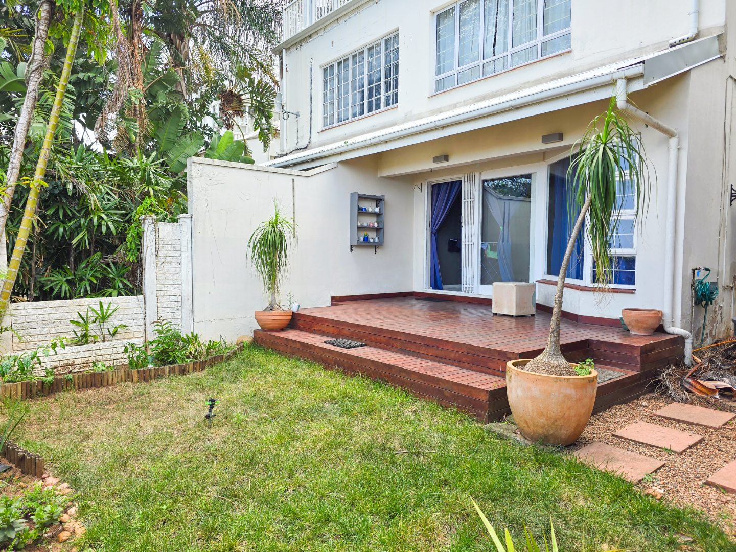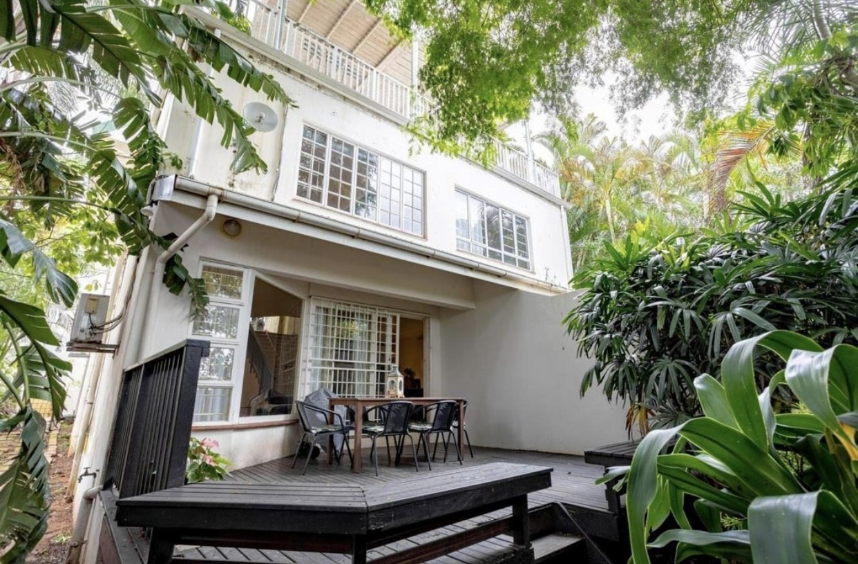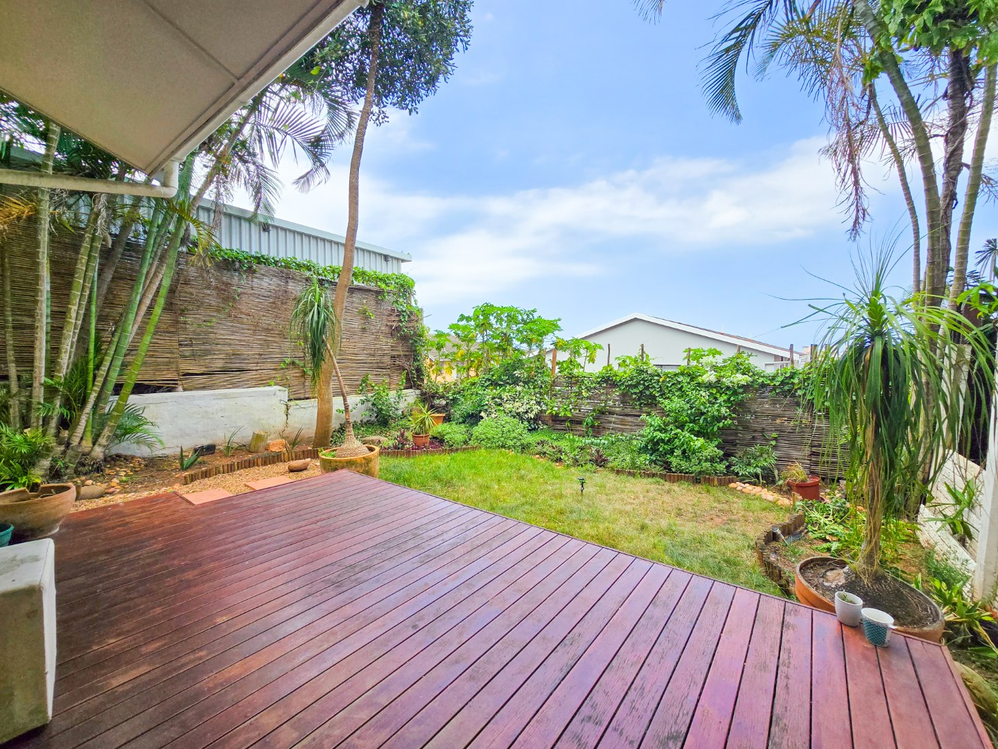 The third unit is neat and well maintained, offering two bedrooms and two bathrooms. It features a spacious lounge and dining area, along with a fitted kitchen that includes built-in cupboards and tiled floors. The lounge opens onto a beautiful outdoor area with a wooden deck, surrounded by greenery. The unit also comes with two parking spaces.