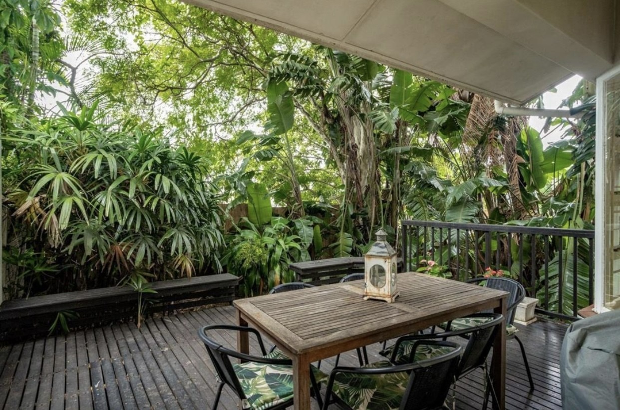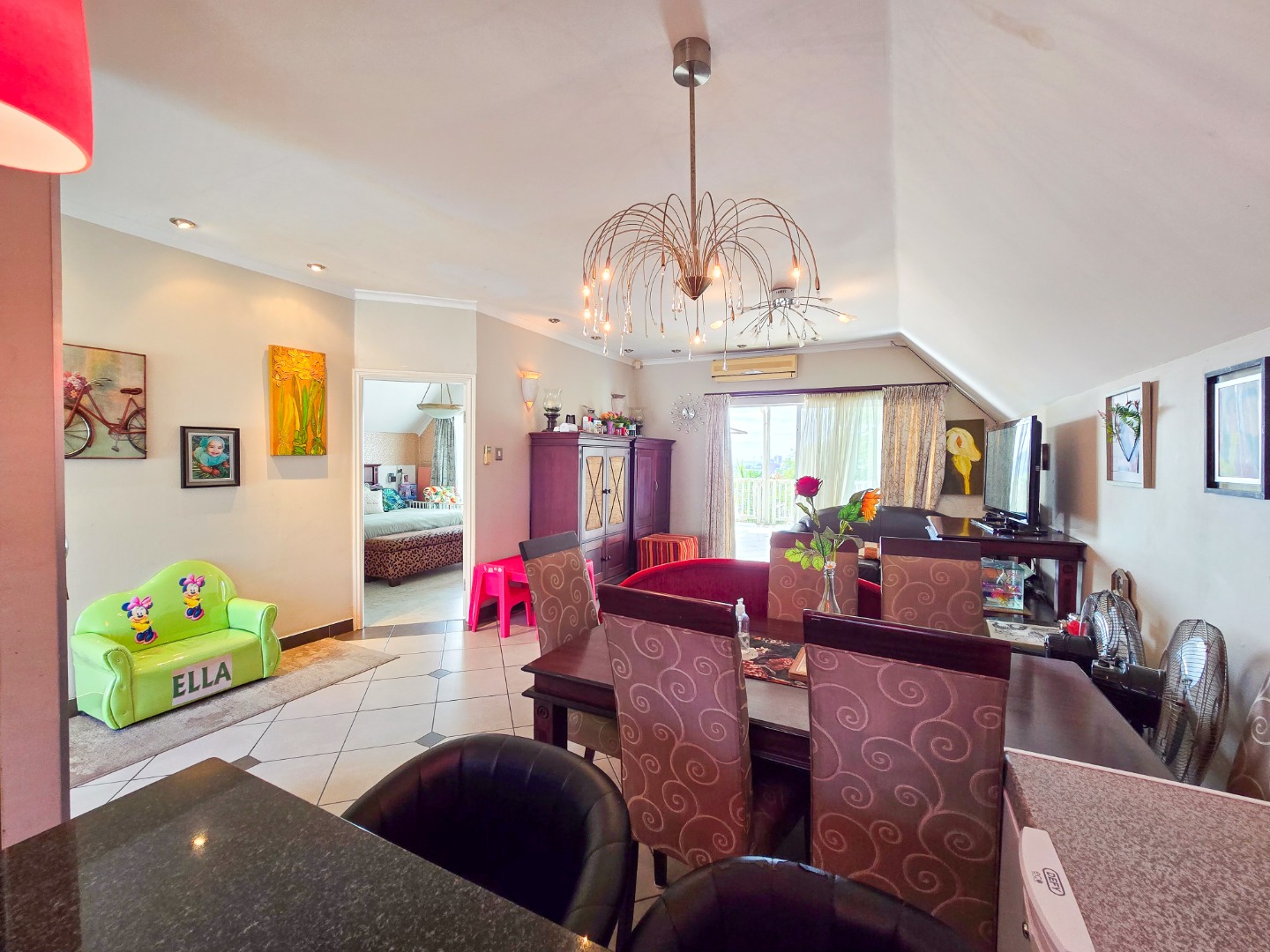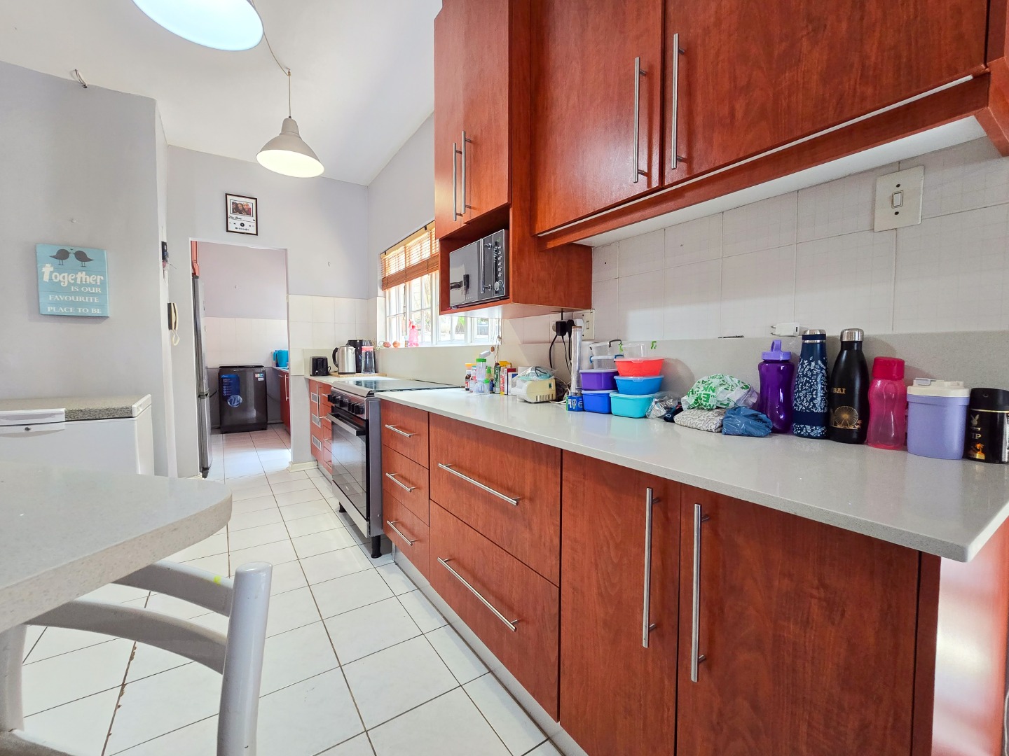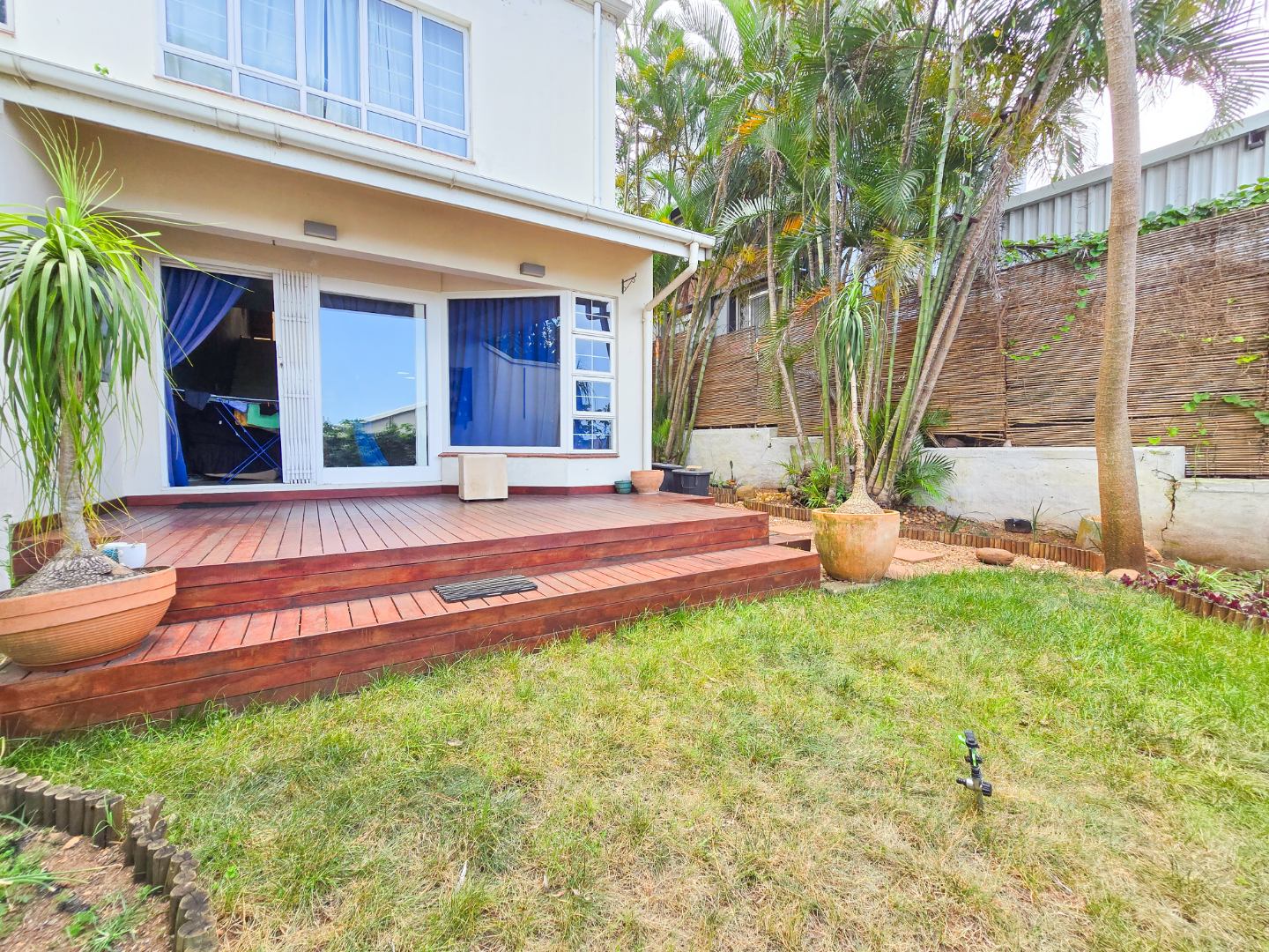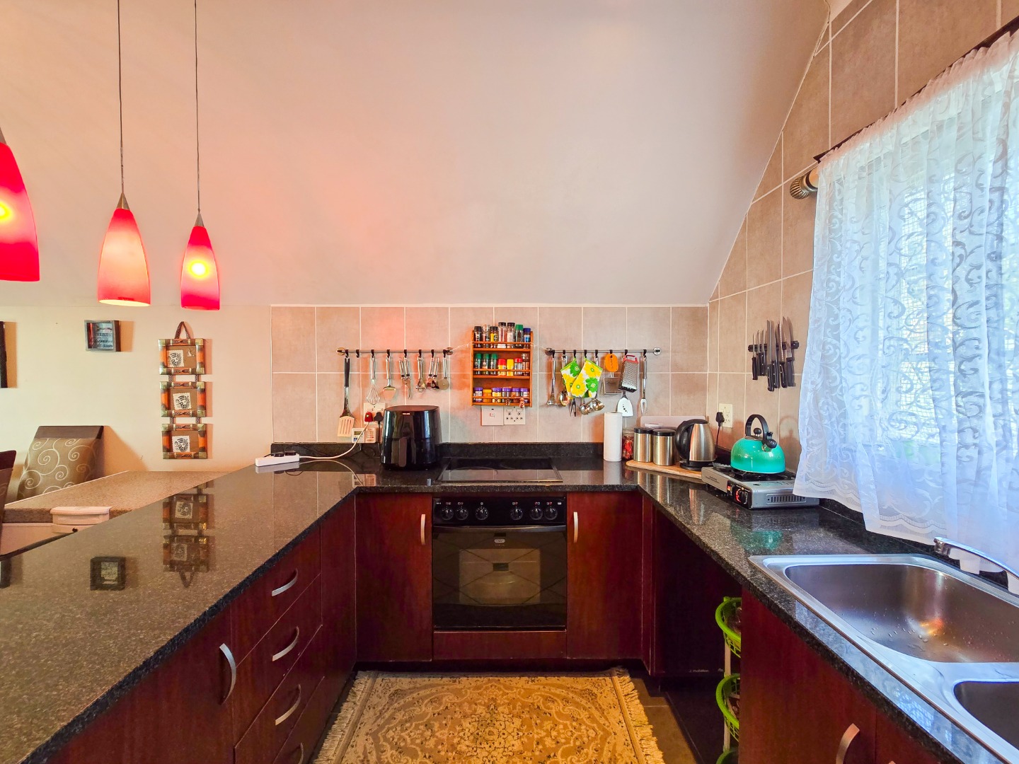 The third unit is neat and well maintained, offering two bedrooms and two bathrooms. It features a spacious lounge and dining area, along with a fitted kitchen that includes built-in cupboards and tiled floors. The lounge opens onto a beautiful outdoor area with a wooden deck, surrounded by greenery. The unit also comes with two parking spaces.