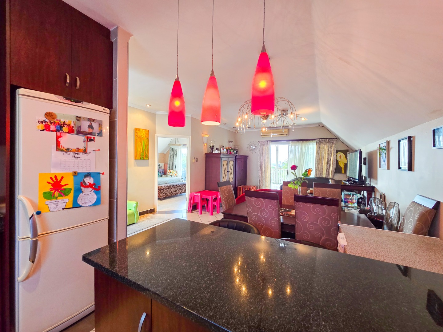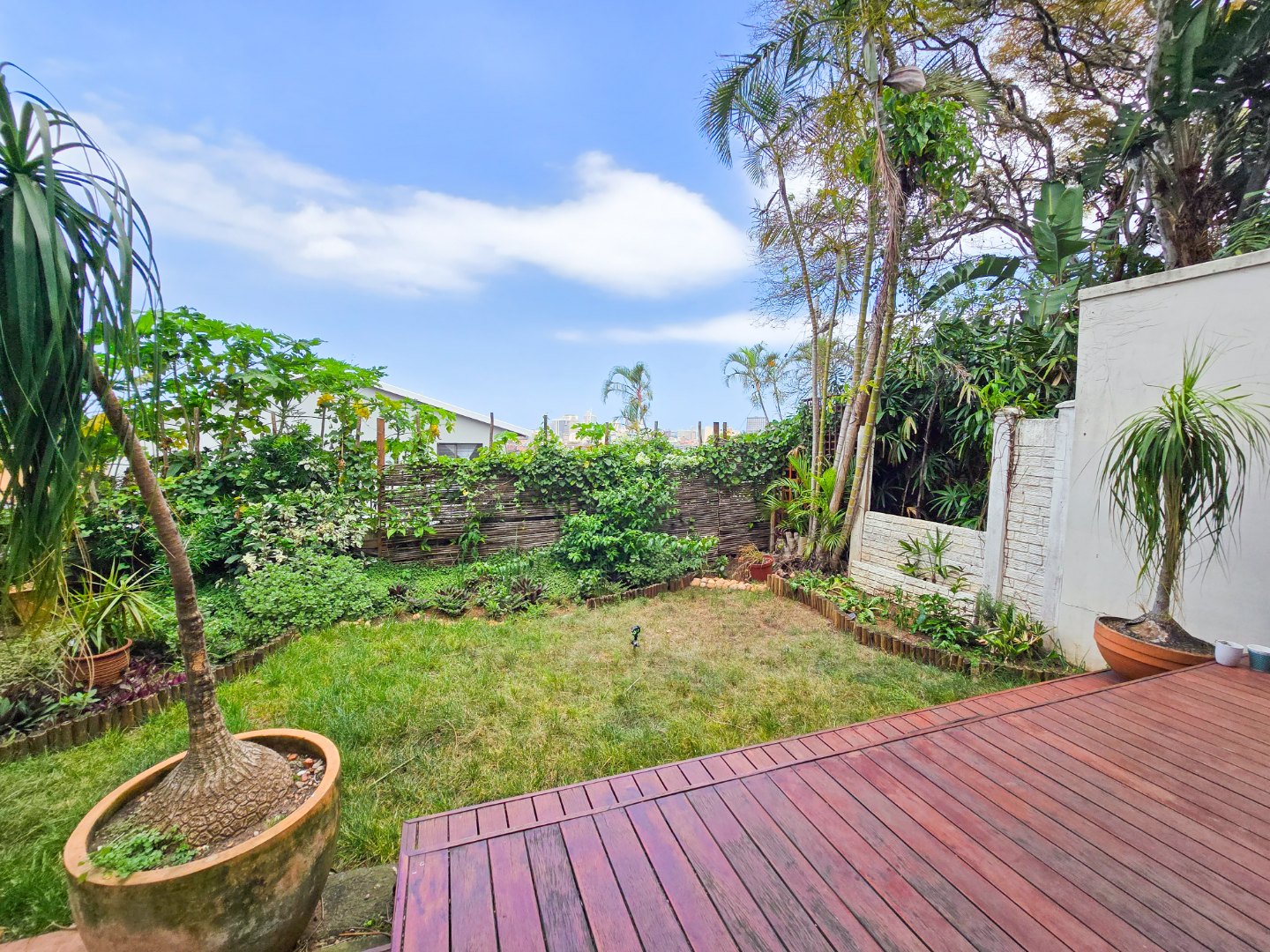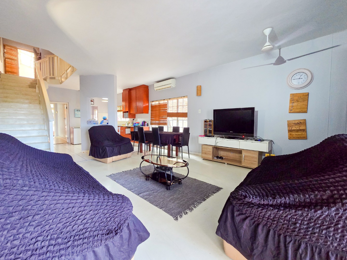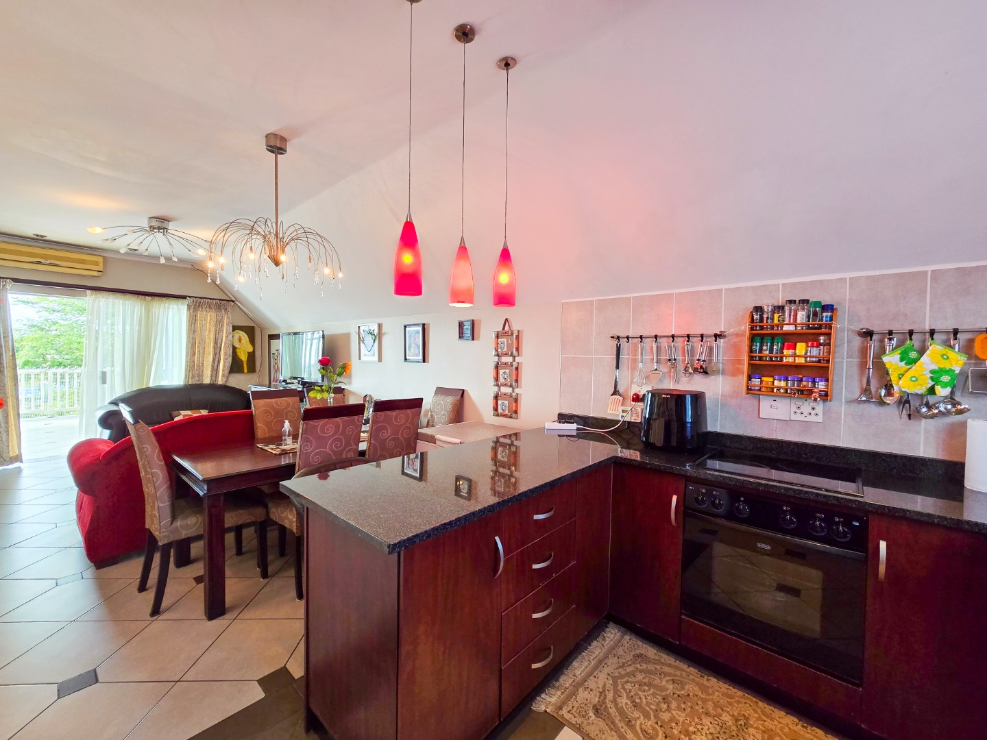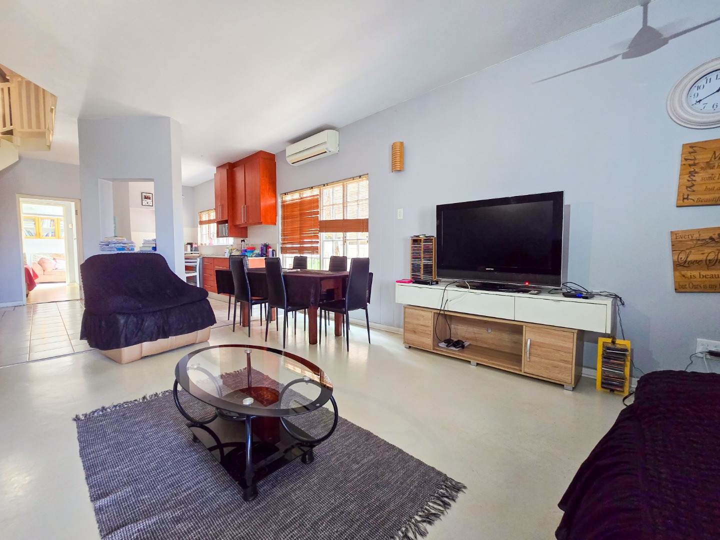 The third unit is neat and well maintained, offering two bedrooms and two bathrooms. It features a spacious lounge and dining area, along with a fitted kitchen that includes built-in cupboards and tiled floors. The lounge opens onto a beautiful outdoor area with a wooden deck, surrounded by greenery. The unit also comes with two parking spaces.