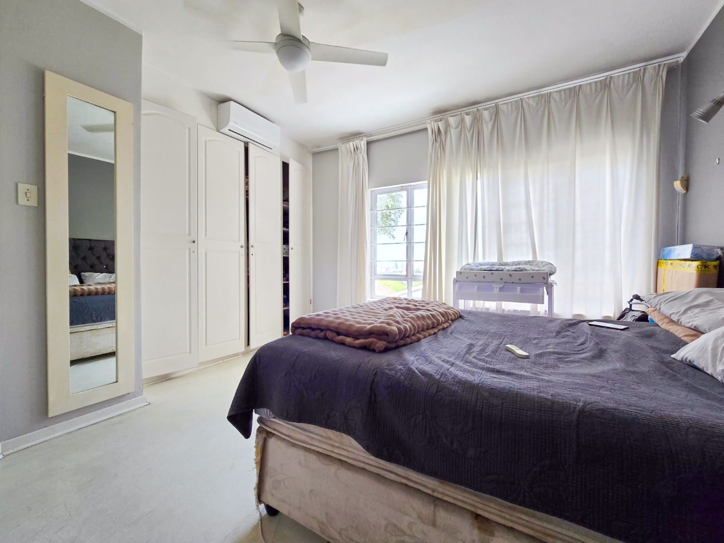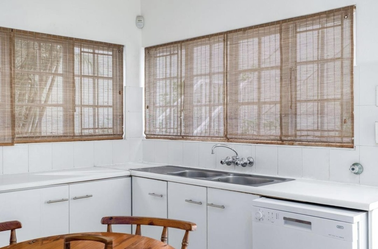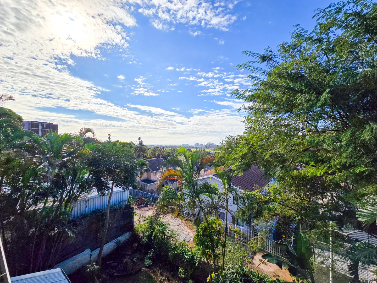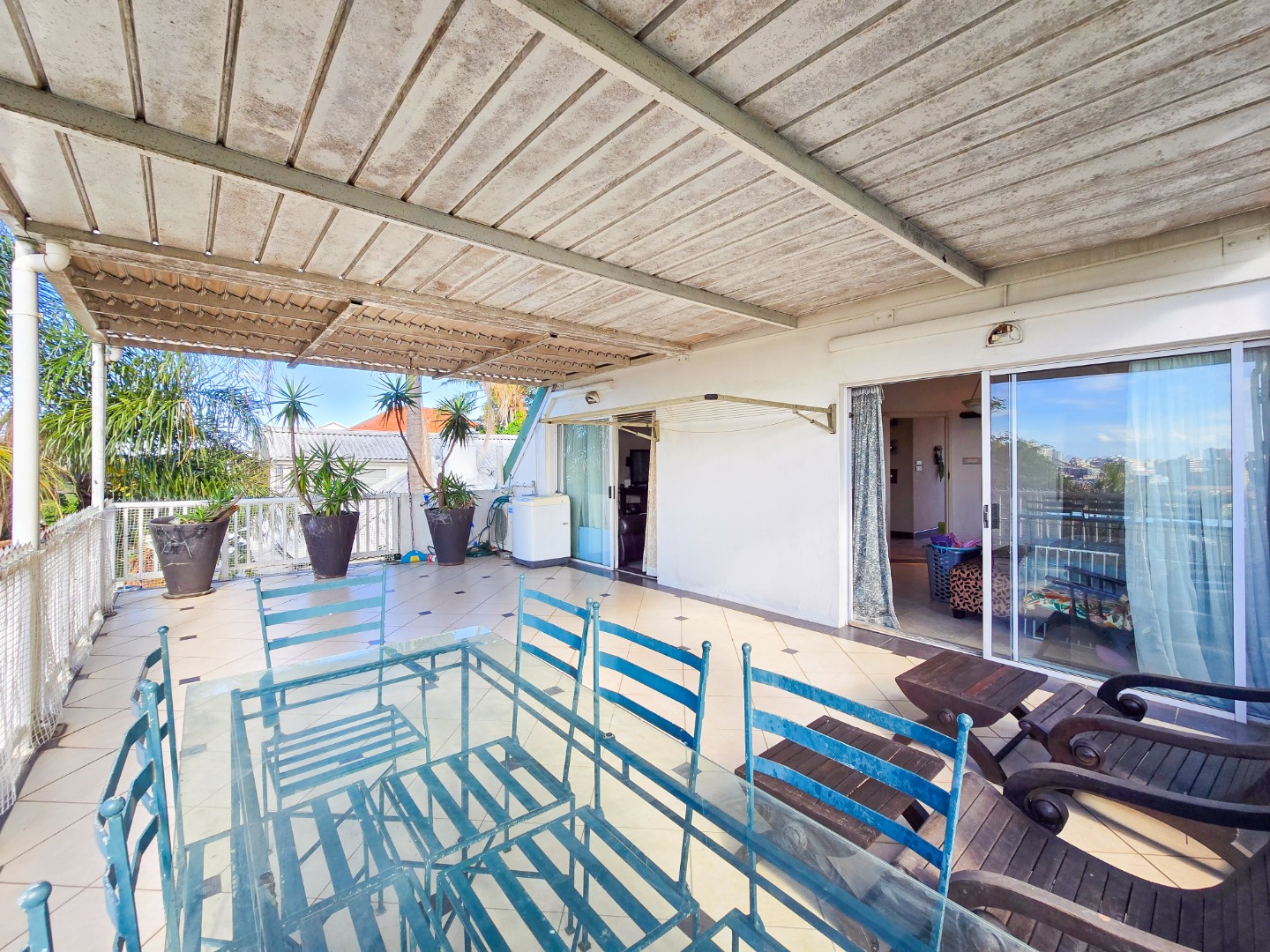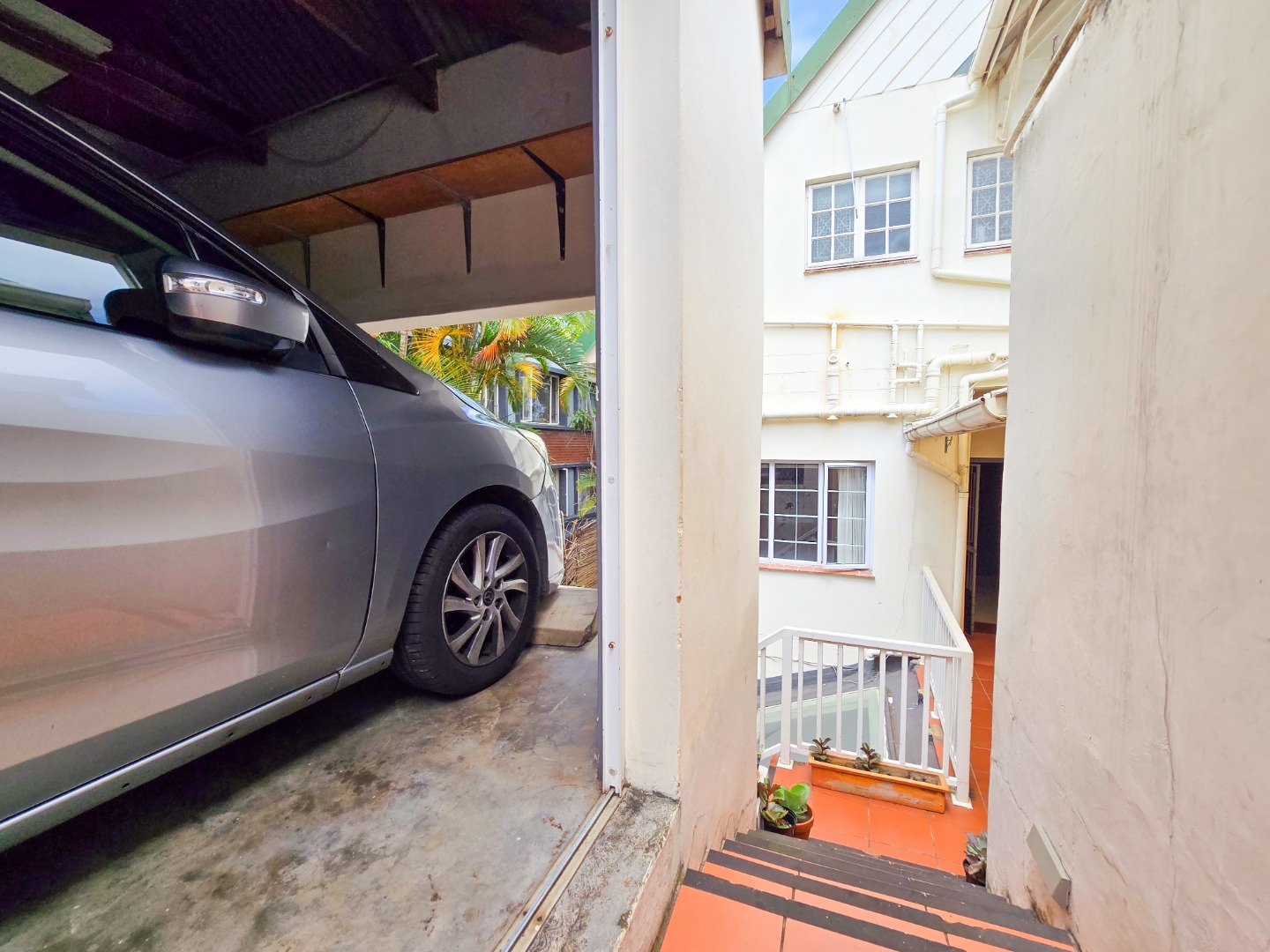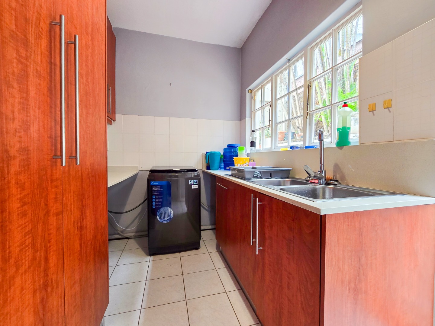 The third unit is neat and well maintained, offering two bedrooms and two bathrooms. It features a spacious lounge and dining area, along with a fitted kitchen that includes built-in cupboards and tiled floors. The lounge opens onto a beautiful outdoor area with a wooden deck, surrounded by greenery. The unit also comes with two parking spaces.