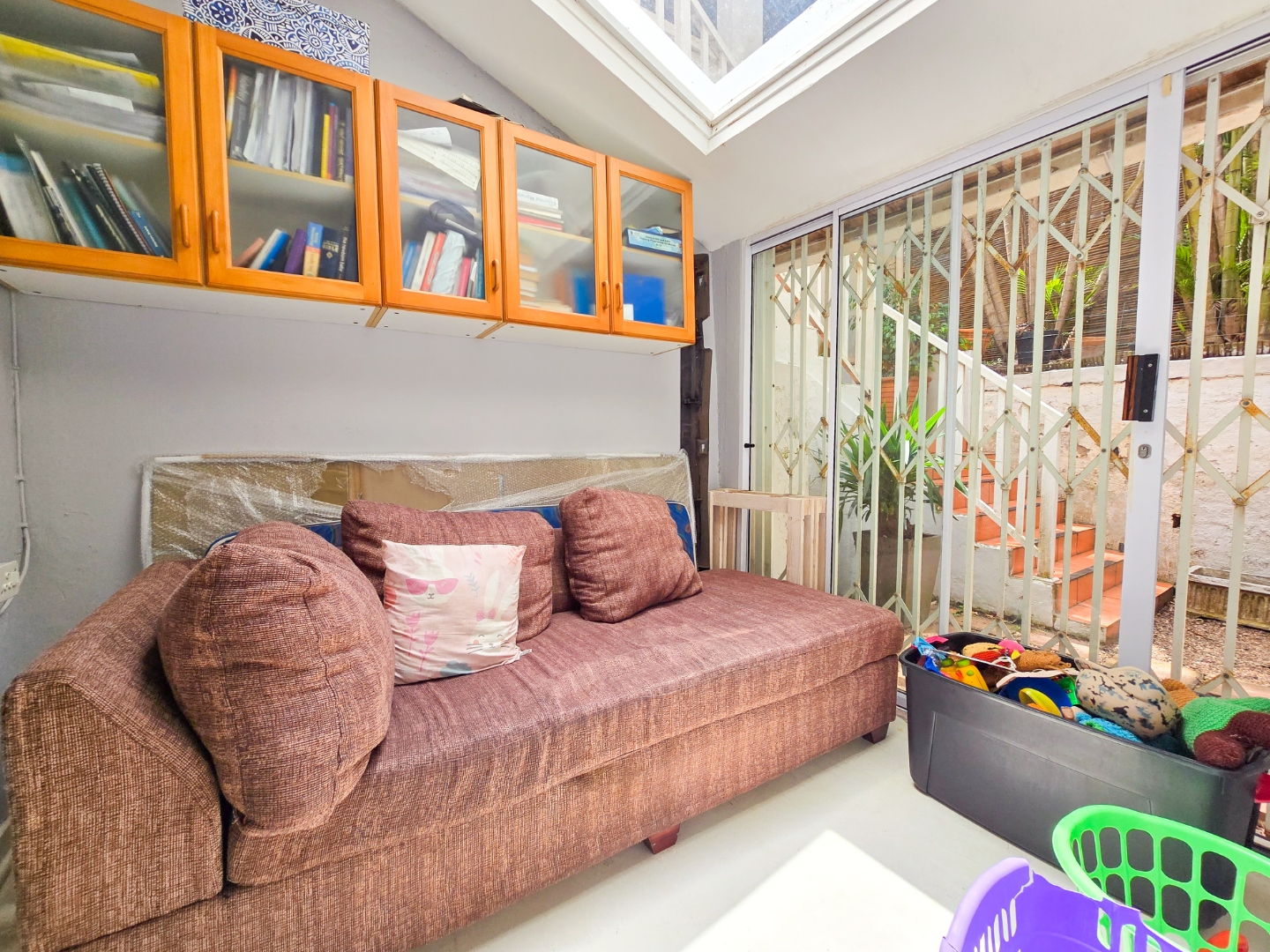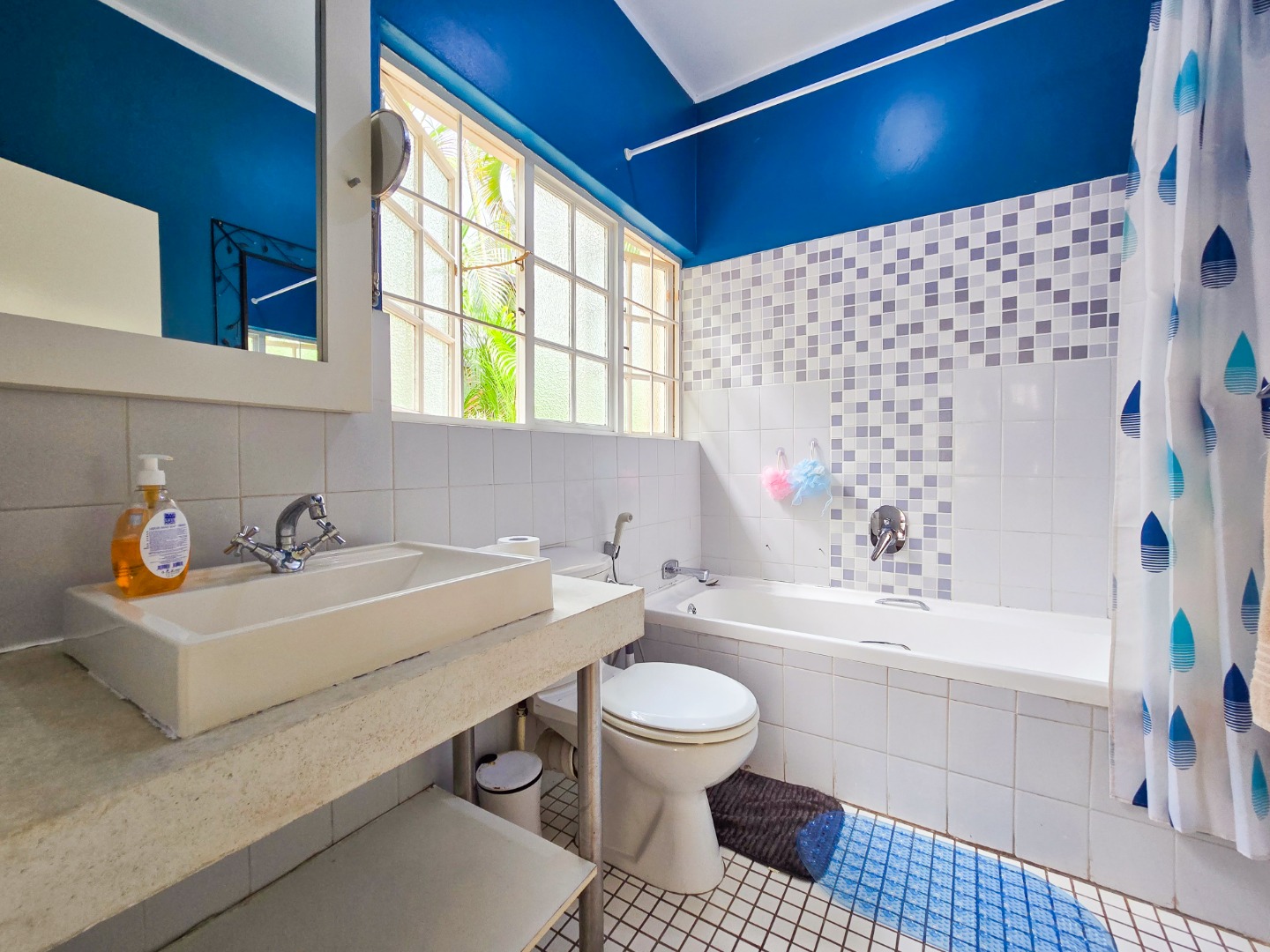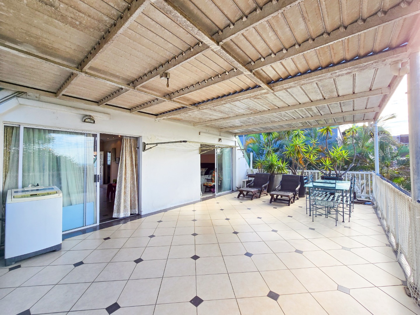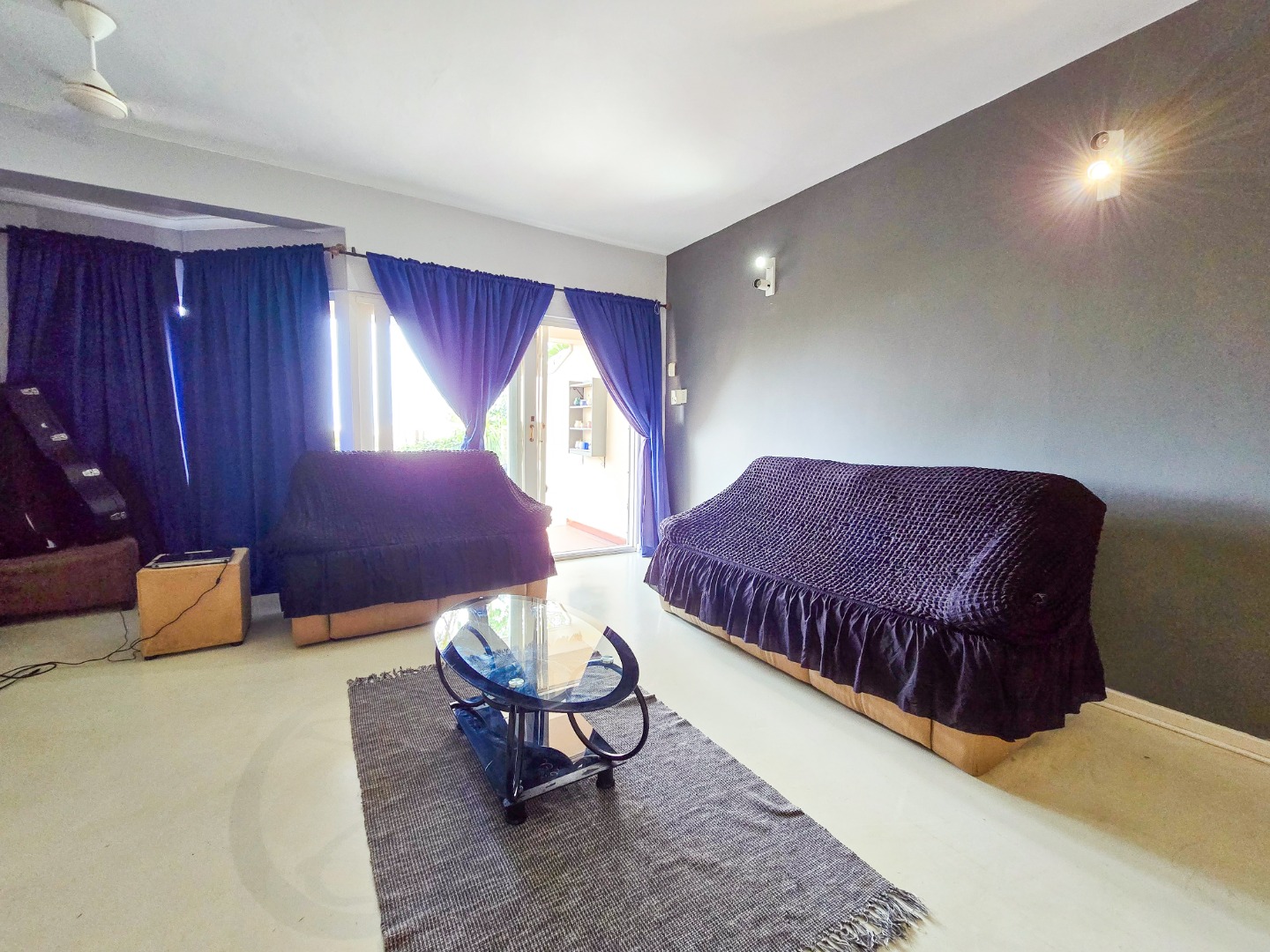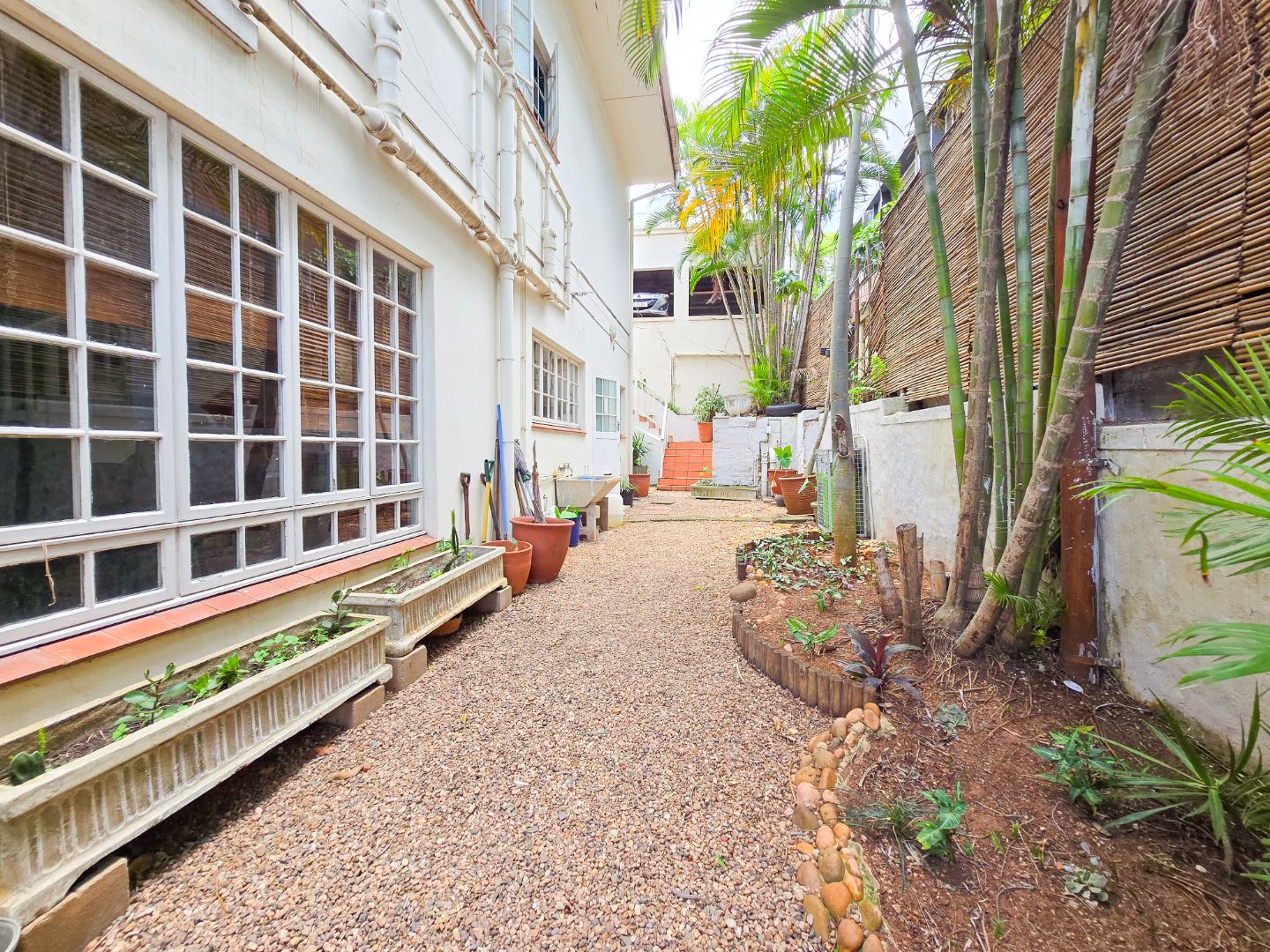 The third unit is neat and well maintained, offering two bedrooms and two bathrooms. It features a spacious lounge and dining area, along with a fitted kitchen that includes built-in cupboards and tiled floors. The lounge opens onto a beautiful outdoor area with a wooden deck, surrounded by greenery. The unit also comes with two parking spaces.