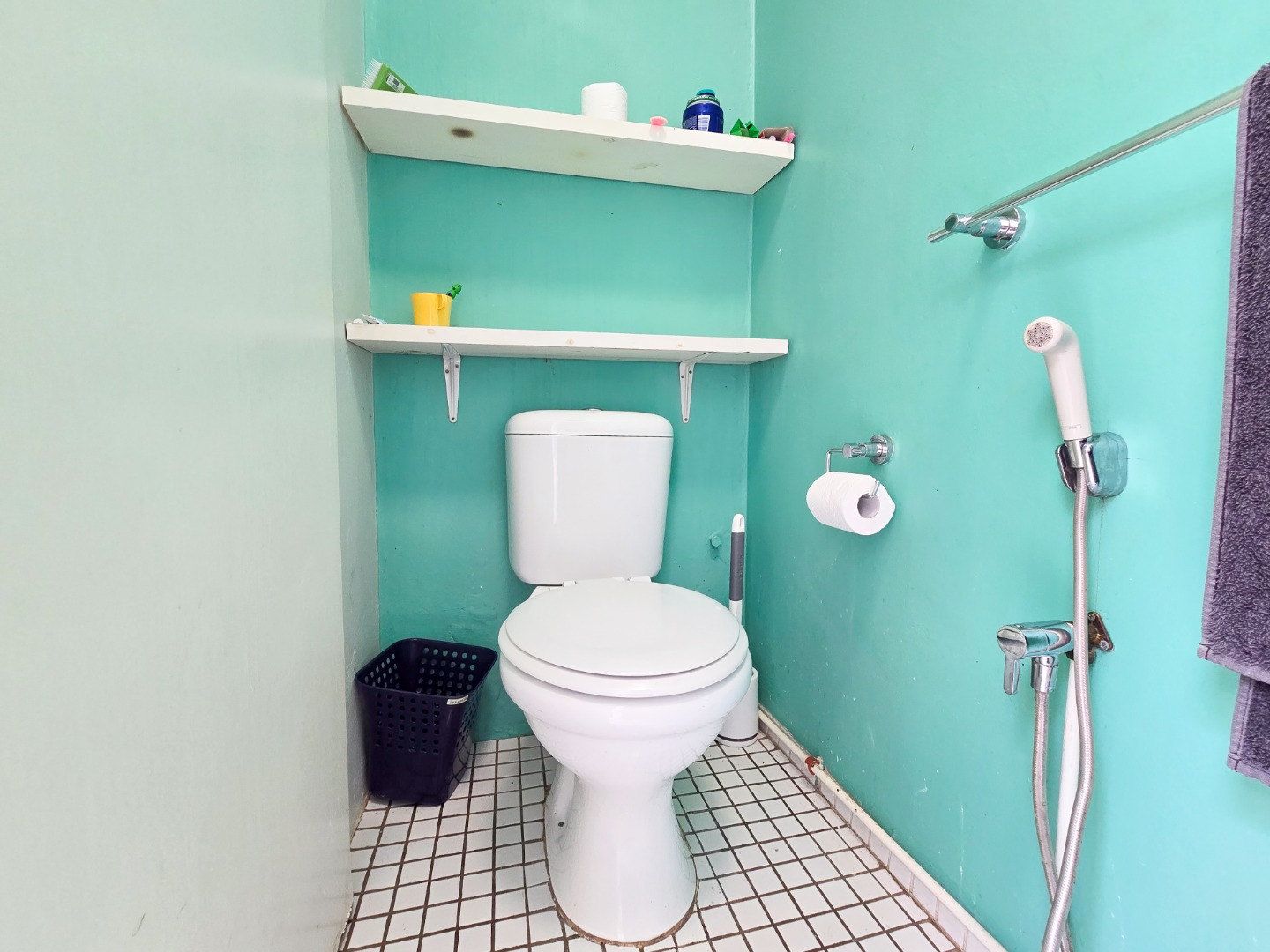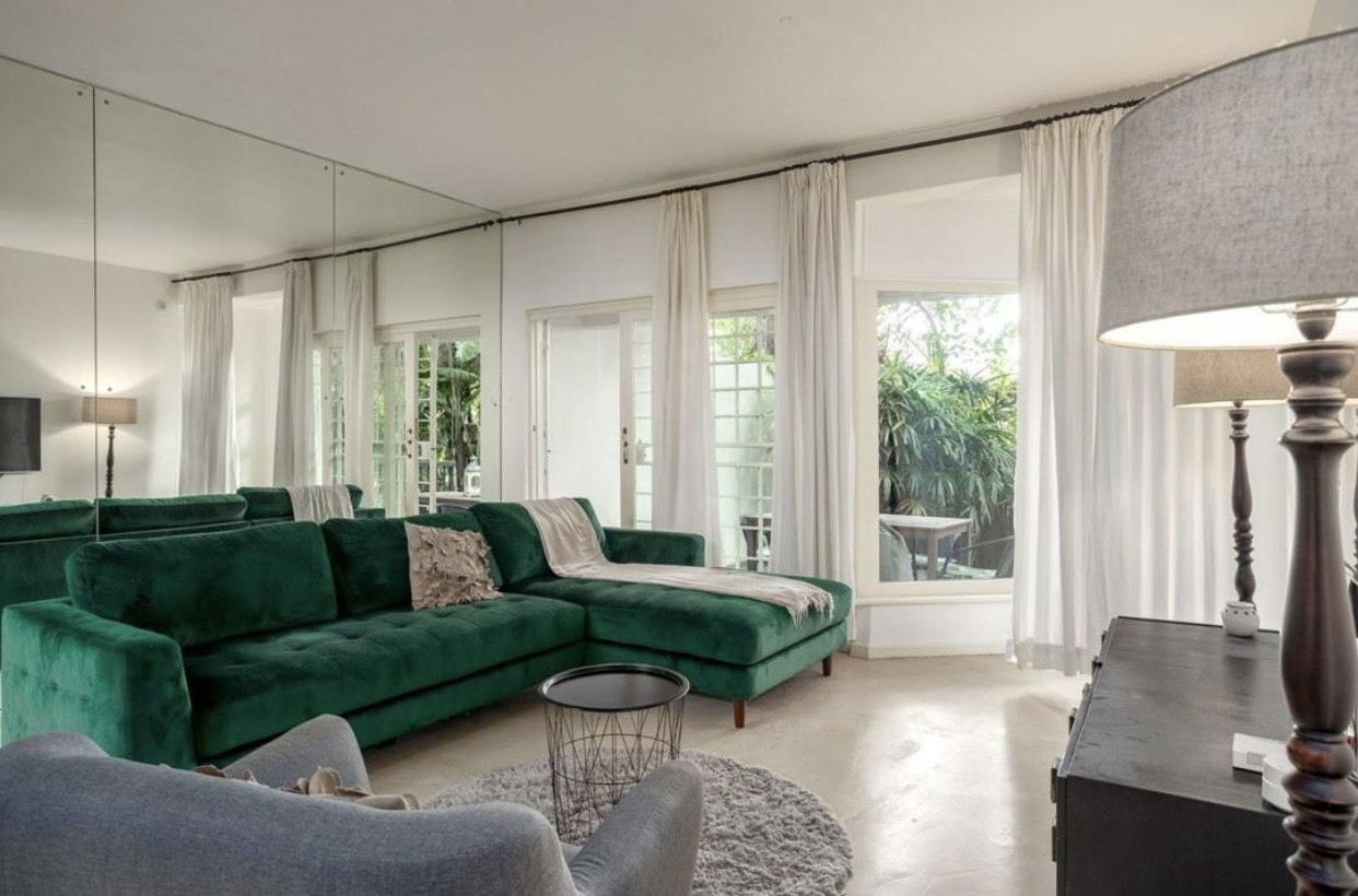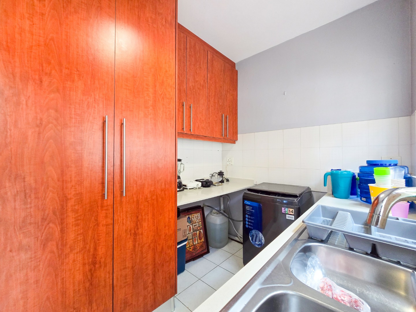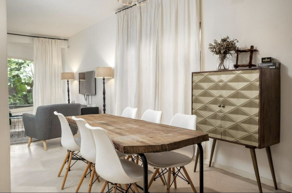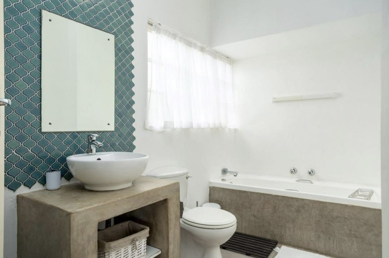 The third unit is neat and well maintained, offering two bedrooms and two bathrooms. It features a spacious lounge and dining area, along with a fitted kitchen that includes built-in cupboards and tiled floors. The lounge opens onto a beautiful outdoor area with a wooden deck, surrounded by greenery. The unit also comes with two parking spaces.