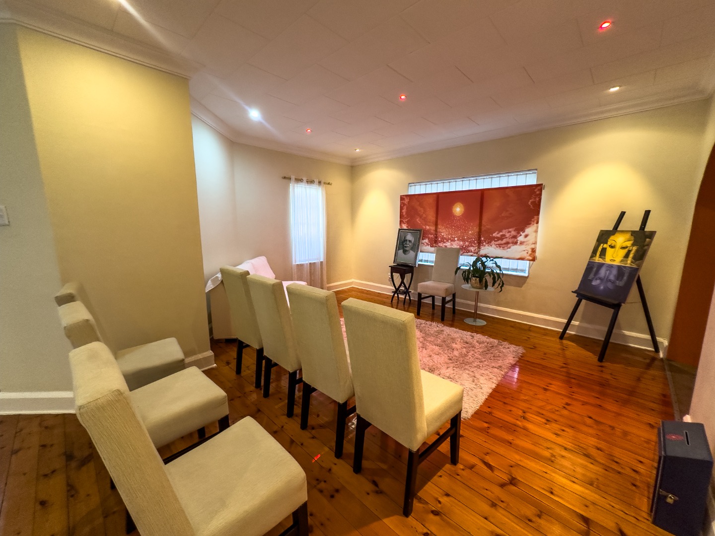 - Living Areas: Open-plan living and dining room with wooden flooring, air conditioning, blinds, and a feature staircase. Entrance hall with elegant flow into entertainment and living areas