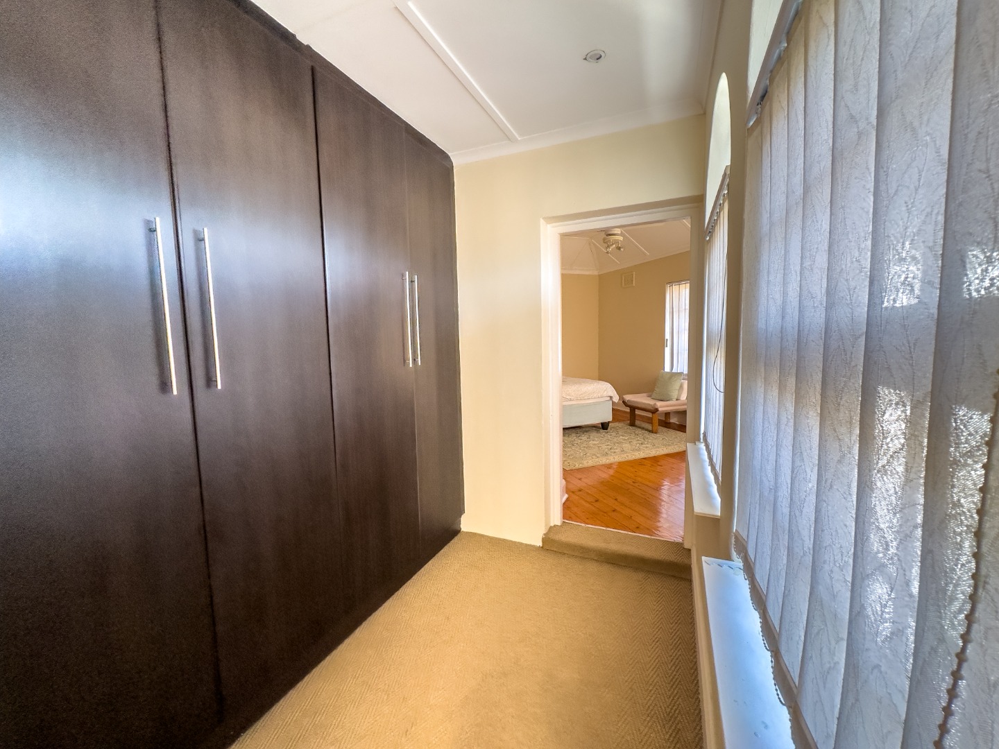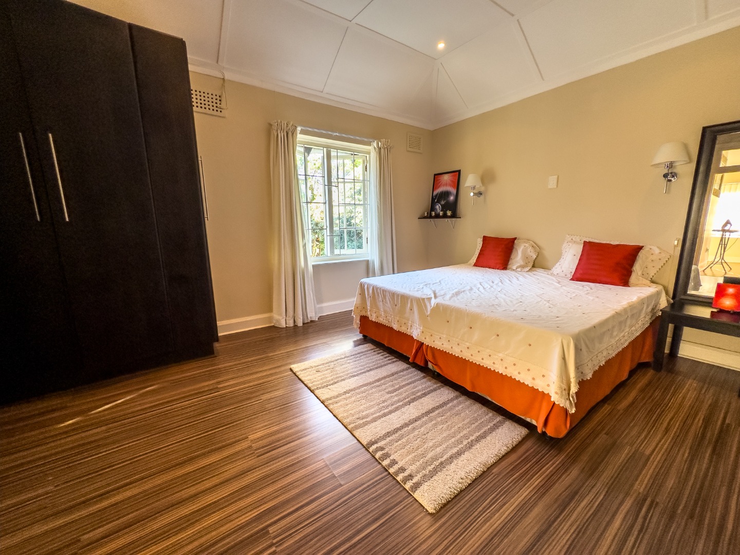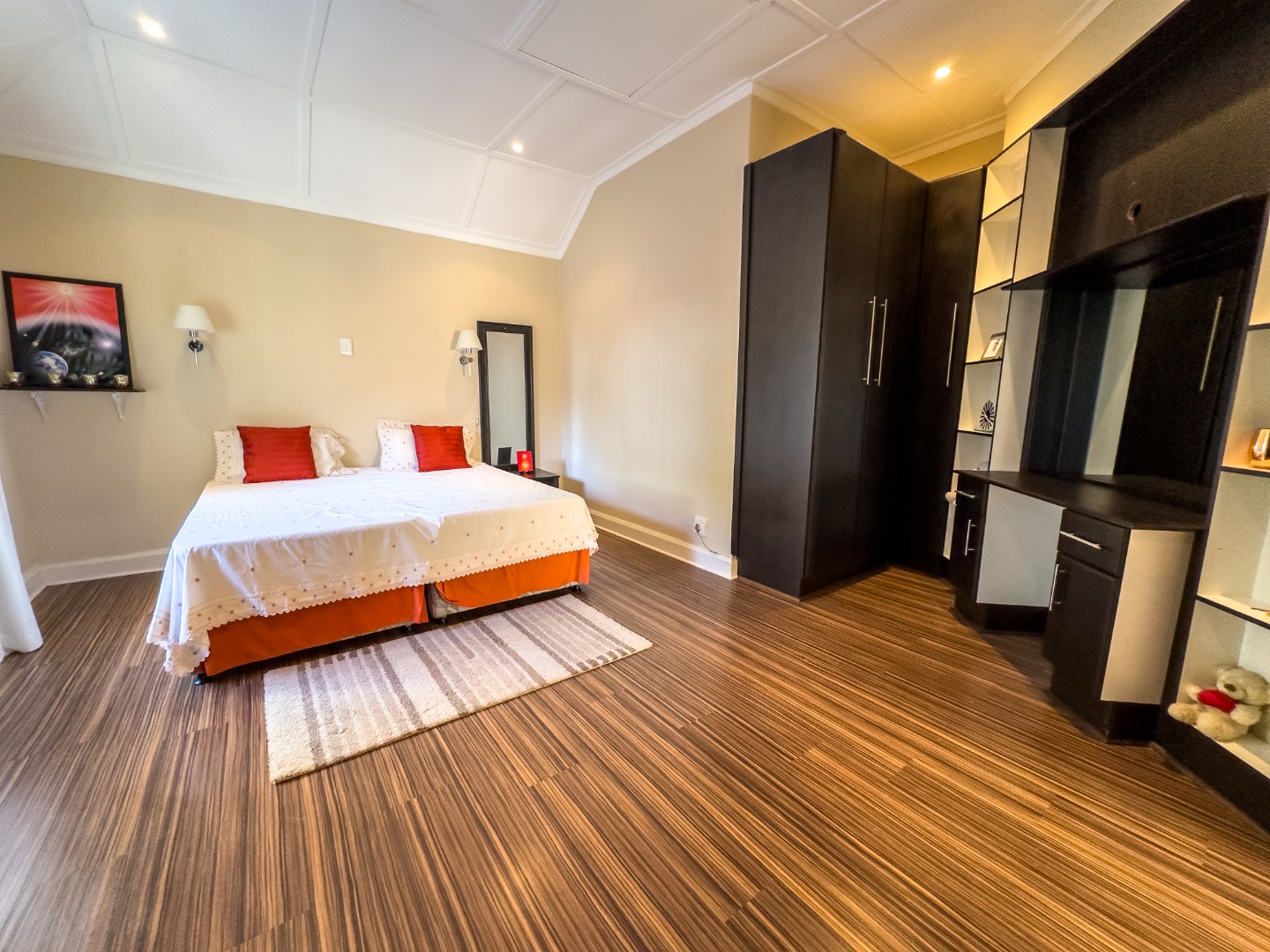 - Bedrooms: Main bedroom: En-suite, walk-in closet, laminated wood flooring, curtain rails, built-in cupboards. Second bedroom: En-suite with full bathroom, wooden floors, built-in cupboards