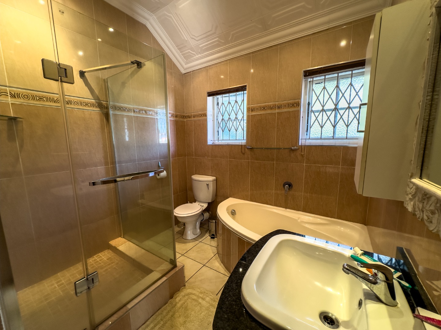 - Bathrooms: Bathroom 1: Shower, basin, toilet, tiled floors. Bathroom 2: Bath, shower, basin, toilet, tiled floors