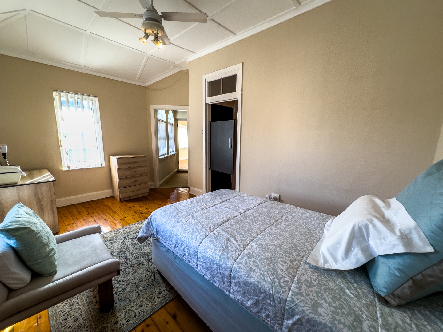 - Kitchen: Modern Caesarstone finishes, tiled floors, eye-level oven, hob, extractor fan. Blinds, breakfast nook, dishwasher connection, ample storage