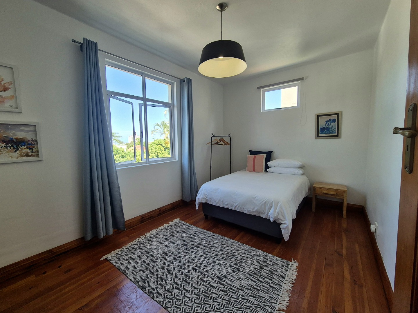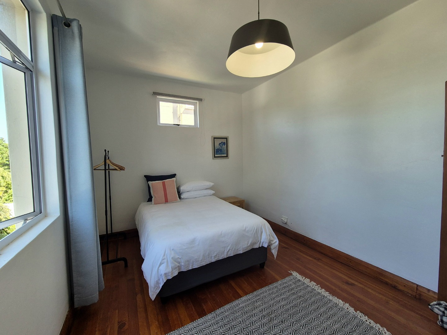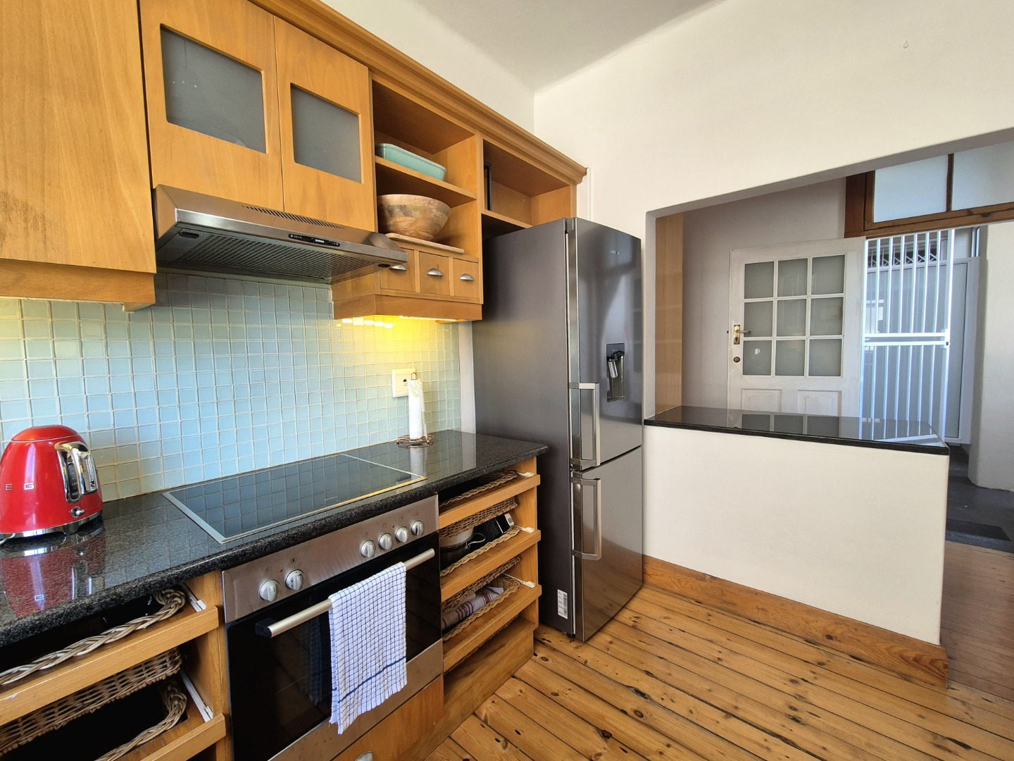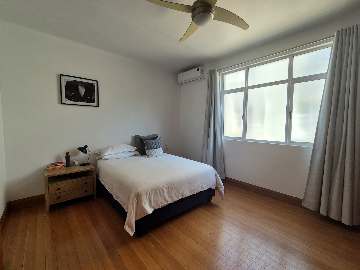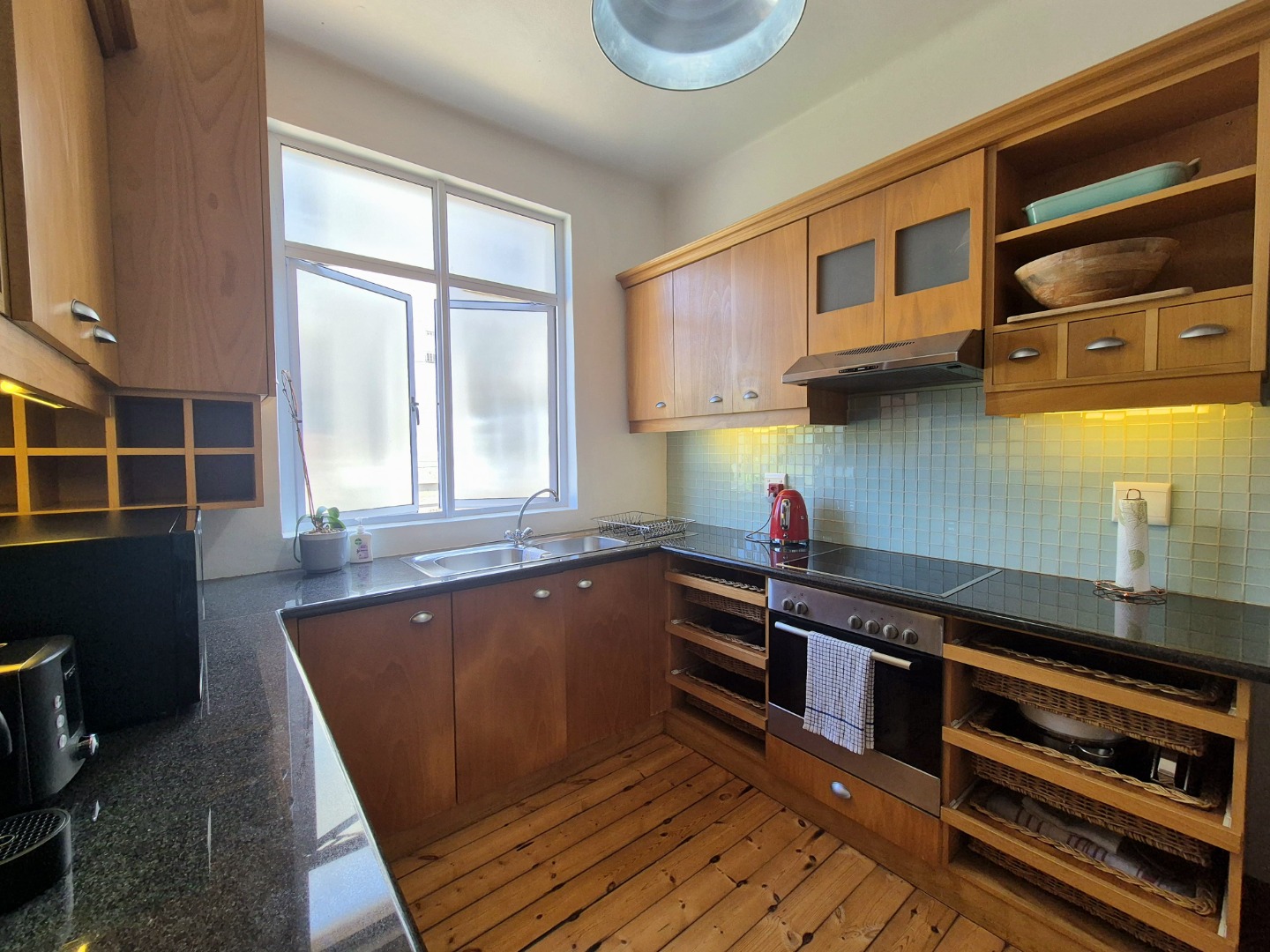 The bedrooms are large and provides plenty of cupboard space. The wooden floors are in excellent condition throughout. Open plan lounge and dining room. Neat fully fitted kitchen with a double bowl sink, built in stove, oven and extractor. Modern renovated family bathroom with toilet, basin and shower. The main bedroom is huge with plenty of cupboard space. There are aluminium windows throughout the apartment.
