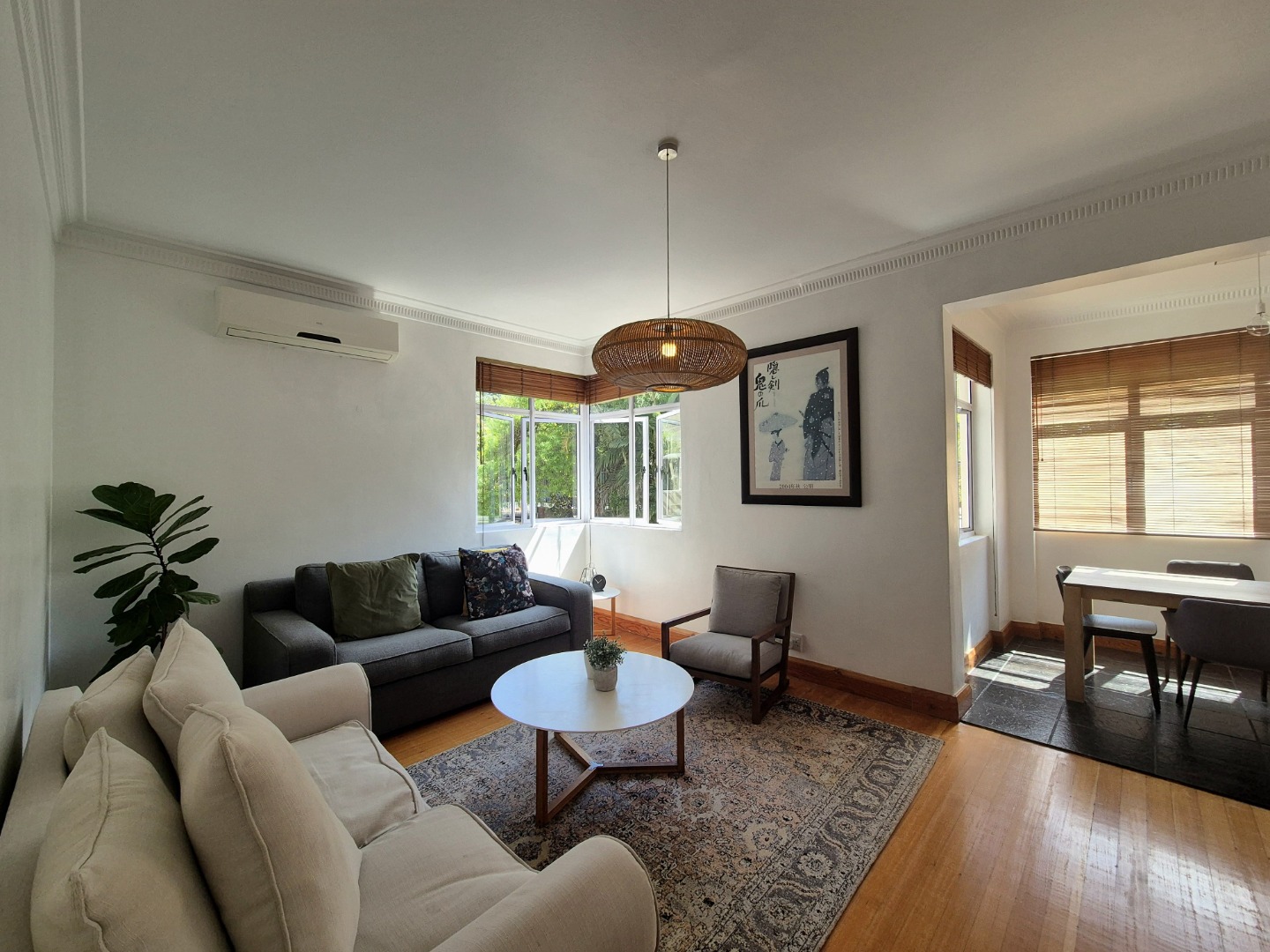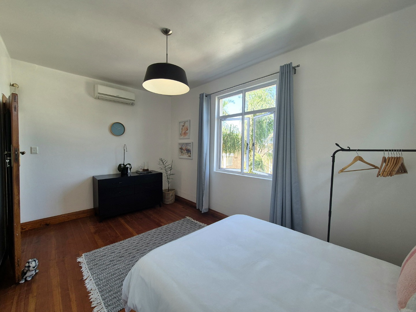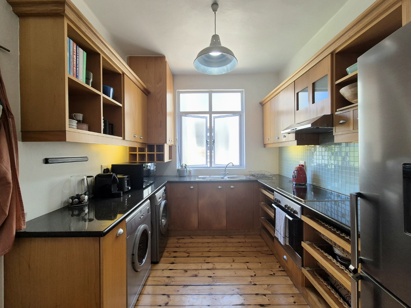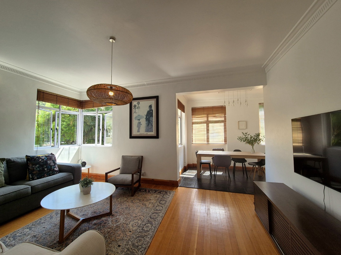 The bedrooms are large and provides plenty of cupboard space. The wooden floors are in excellent condition throughout. Open plan lounge and dining room. Neat fully fitted kitchen with a double bowl sink, built in stove, oven and extractor. Modern renovated family bathroom with toilet, basin and shower. The main bedroom is huge with plenty of cupboard space. There are aluminium windows throughout the apartment.