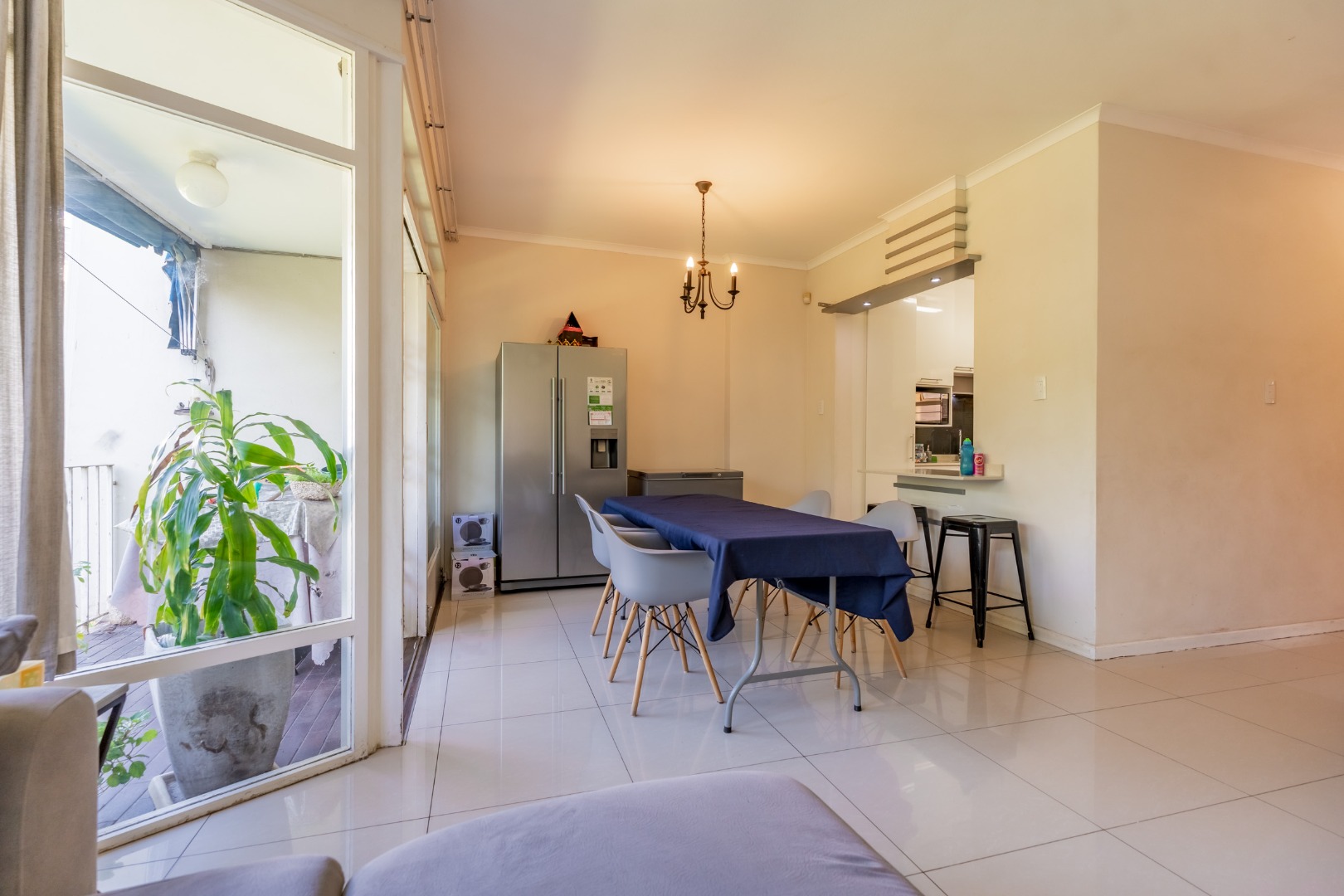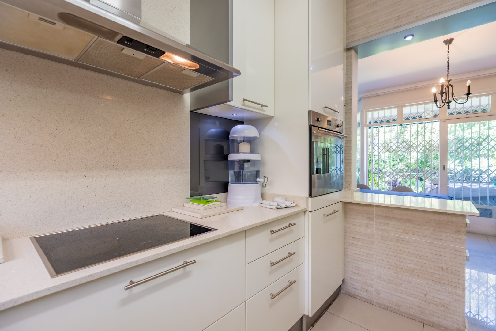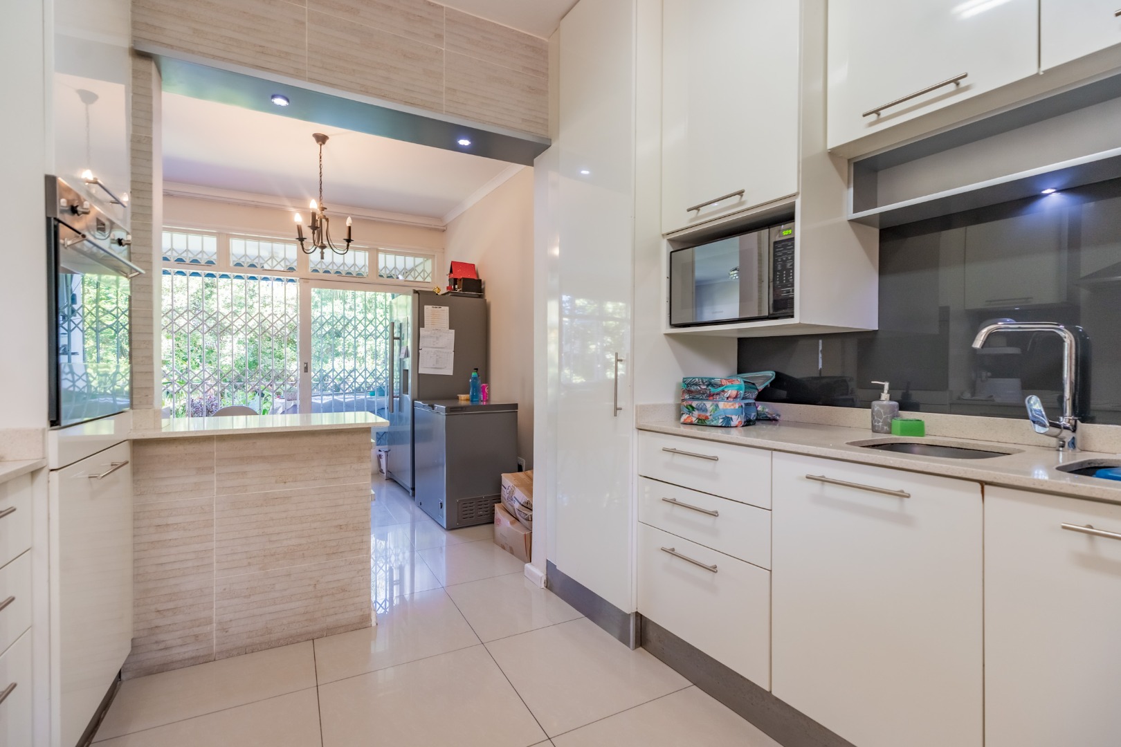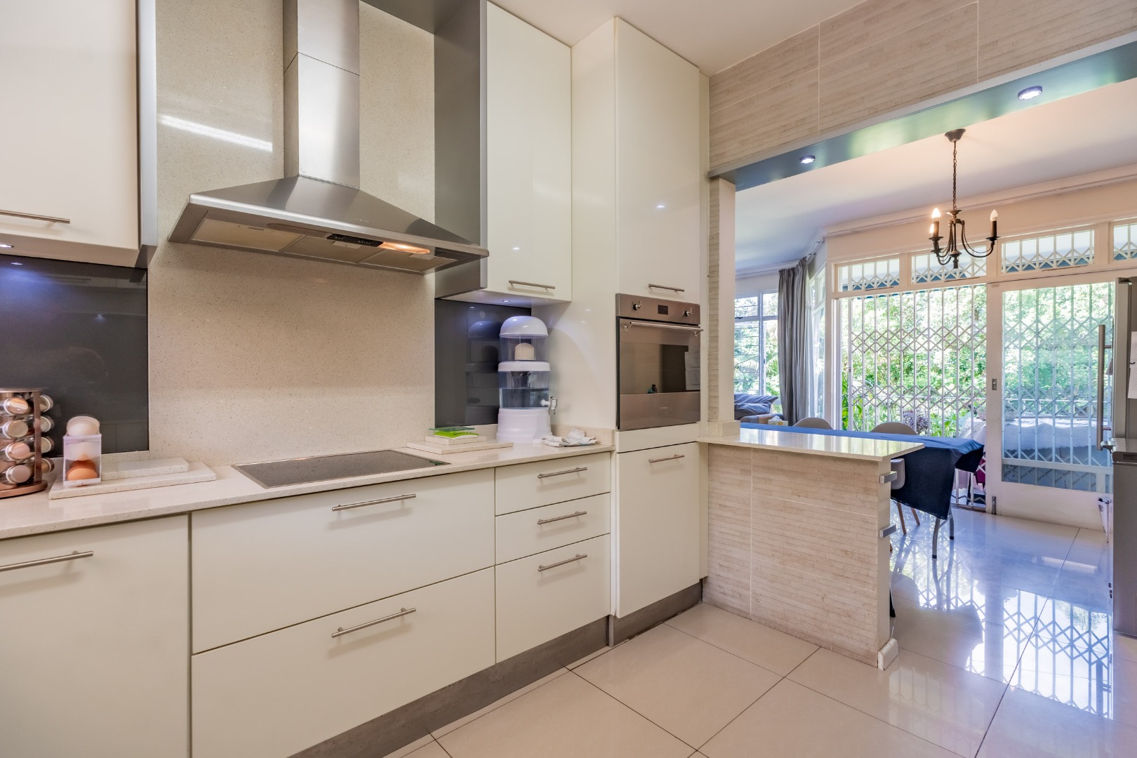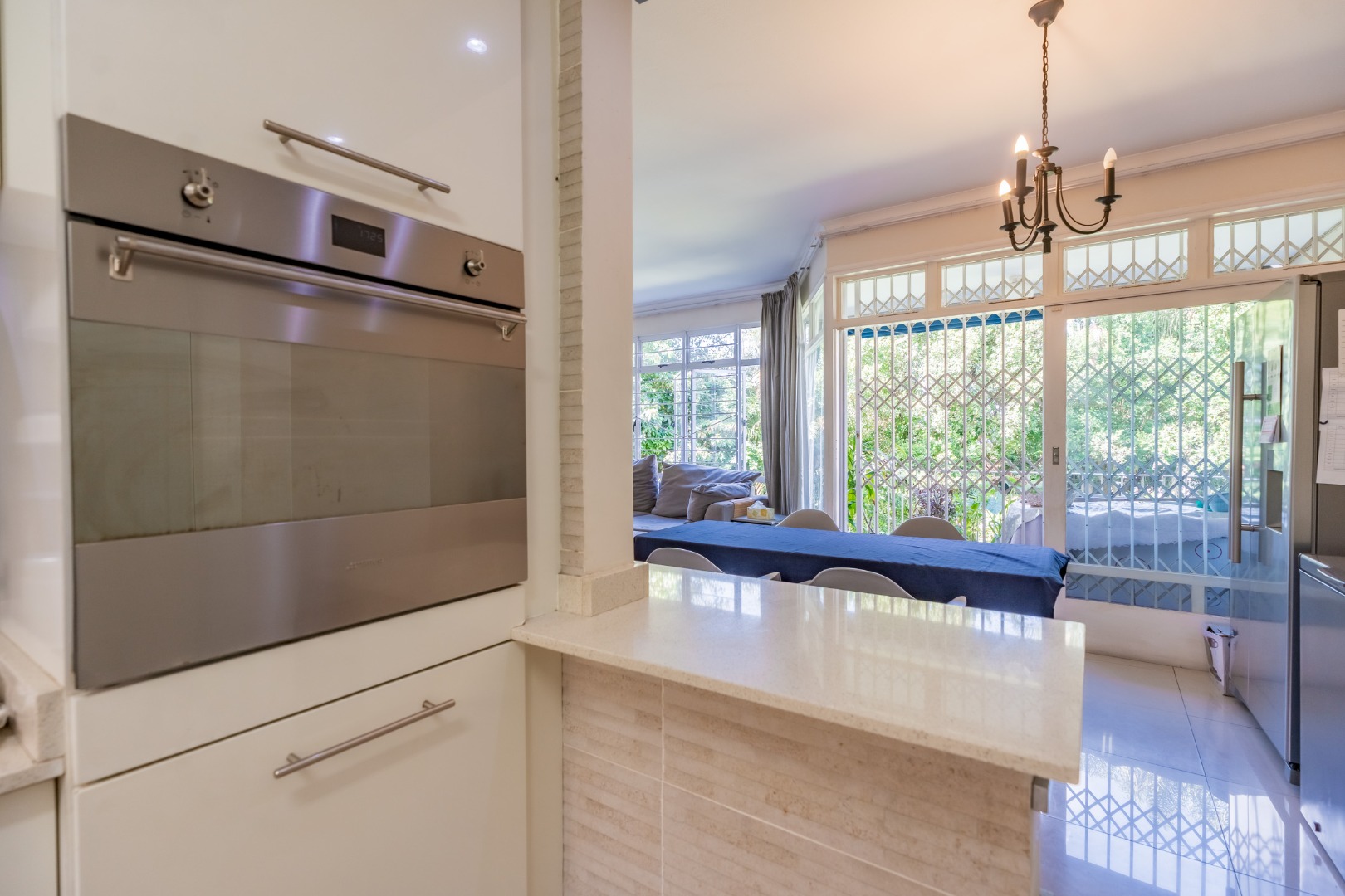 The interior boasts an inviting open-plan living and dining area, bathed in abundant natural light from large windows and glass doors. Modern tiled flooring flows throughout, creating a clean and contemporary feel. The kitchen is well-appointed with a built-in stainless steel oven and a convenient breakfast bar, seamlessly connecting to the main living space.