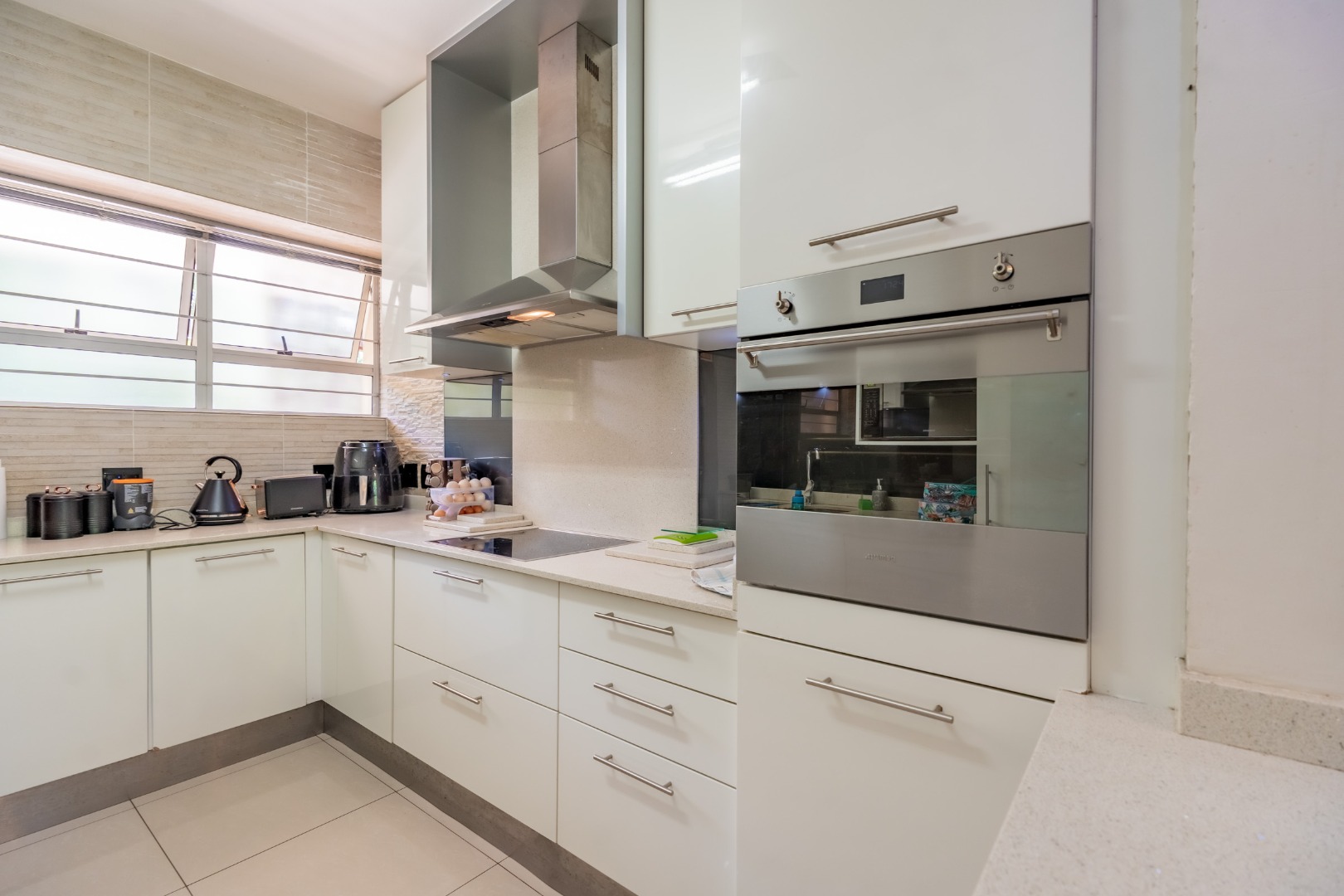 The interior boasts an inviting open-plan living and dining area, bathed in abundant natural light from large windows and glass doors. Modern tiled flooring flows throughout, creating a clean and contemporary feel. The kitchen is well-appointed with a built-in stainless steel oven and a convenient breakfast bar, seamlessly connecting to the main living space.