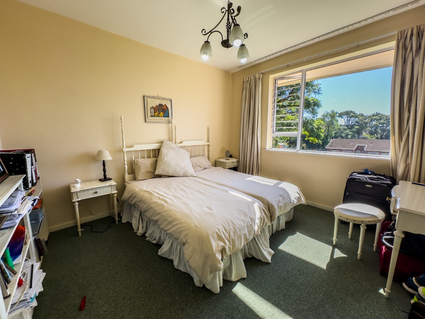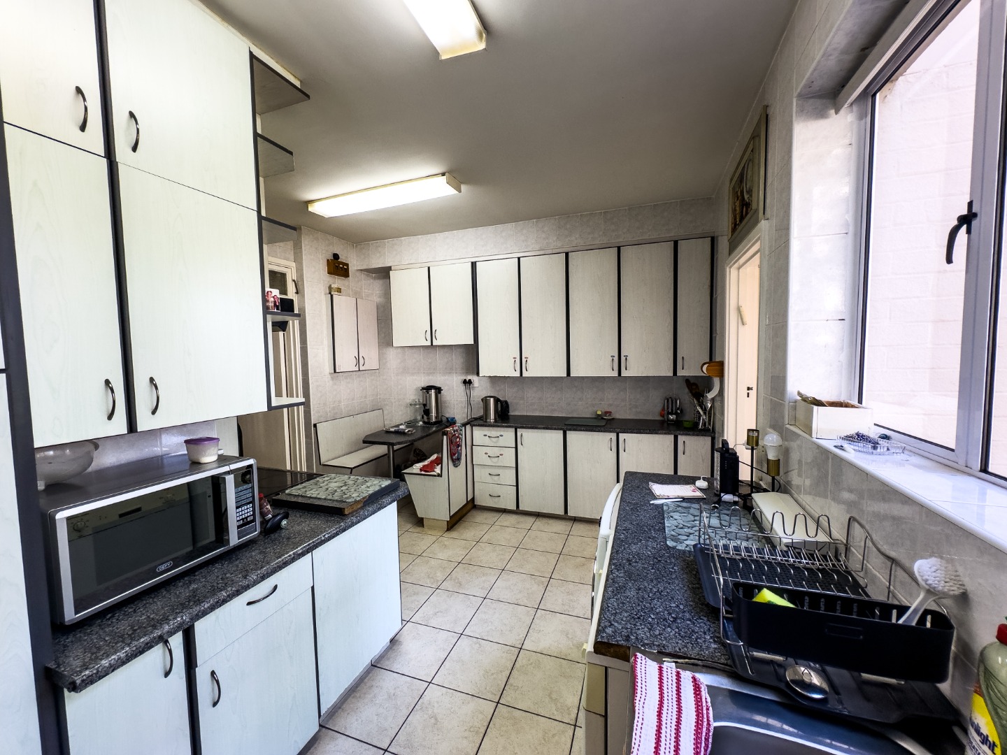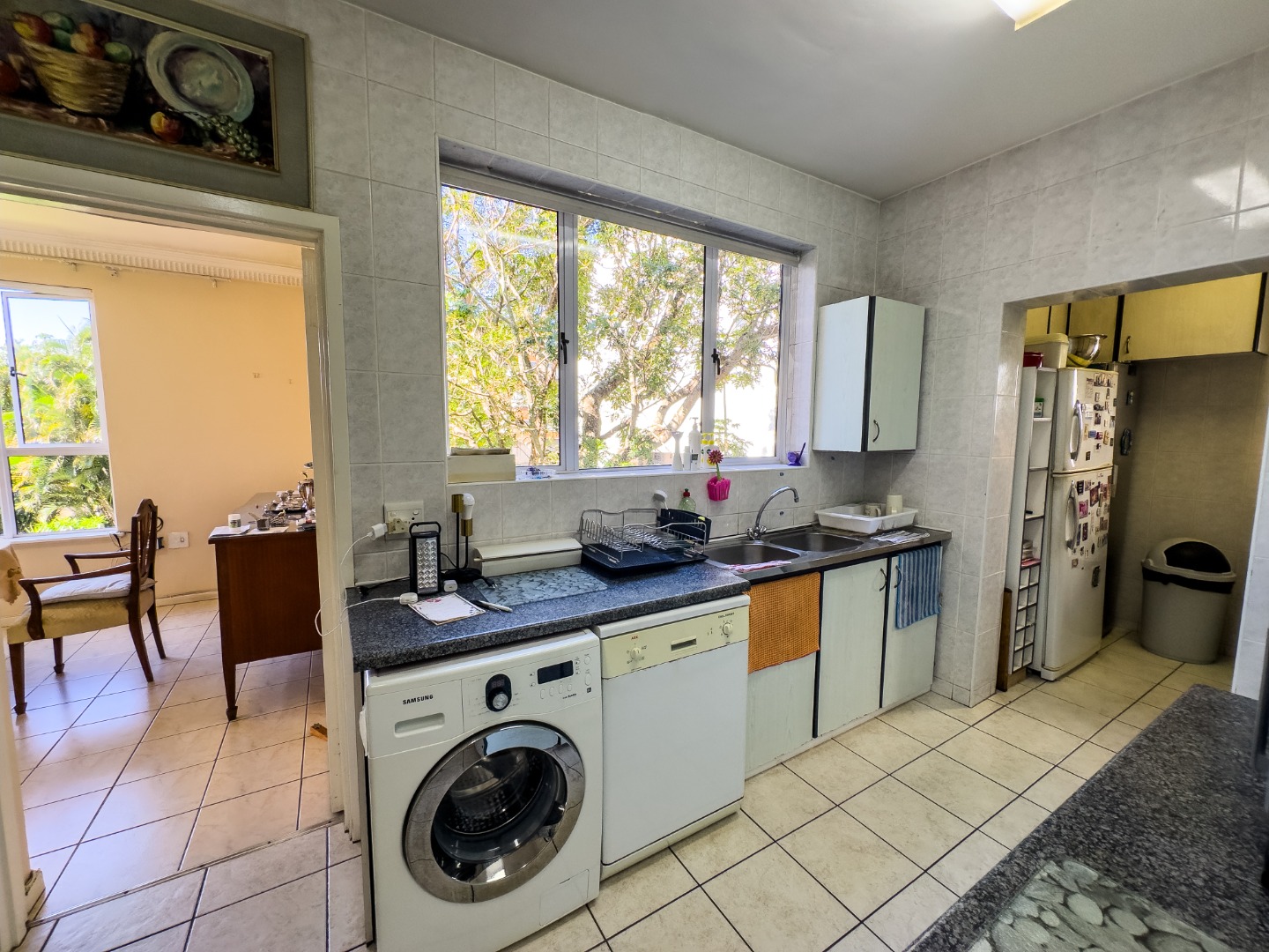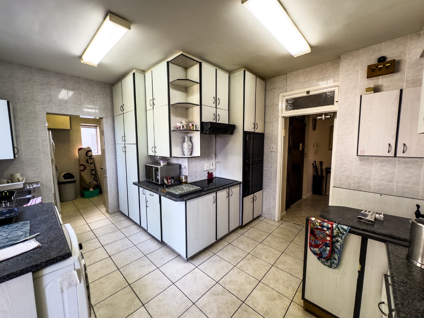 The kitchen is ideal for family living, offering ample built-in storage, granite countertops, a breakfast bar, stovetop, and eye-level oven. A separate scullery with its own back door adds practical convenience. The apartment is fitted with fully ducted air-conditioning throughout.