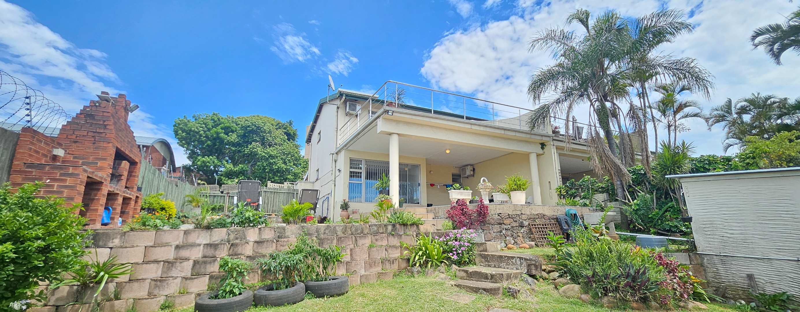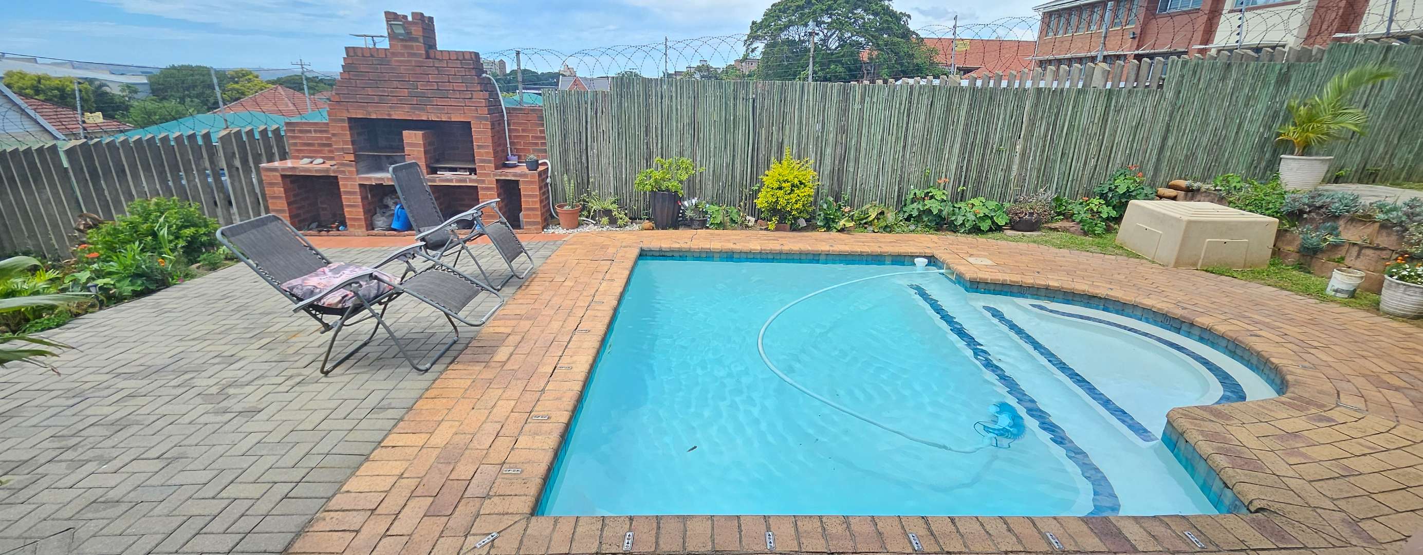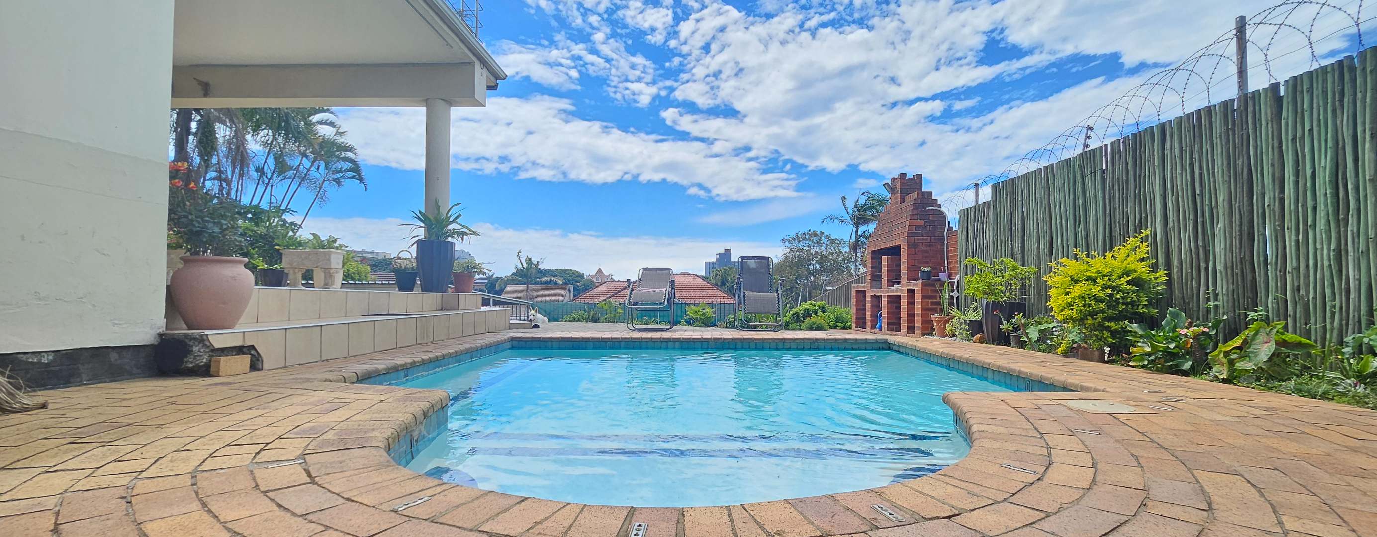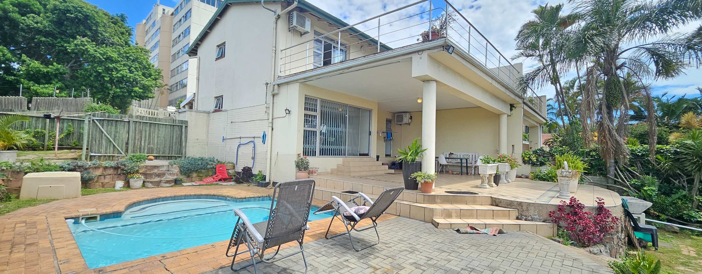 Discover this inviting 3-bedroom residential property for sale in the sought-after suburban area of Musgrave, Durban. Boasting a generous Floor Size of 203.00 sqm on a 446.00 sqm Erf, this home offers a blend of comfortable living and vibrant outdoor spaces. The multi-level design, complemented by a lush, tiered tropical garden with mature palm trees, creates an appealing kerb presence and a private oasis. Step inside to find an open-plan layout that seamlessly connects the living areas. The property features one lounge, a dedicated dining room, and a functional kitchen equipped with ample wooden cabinetry and black countertops. Natural light fills the spaces, enhancing the welcoming atmosphere. With three well-proportioned bedrooms and two bathrooms, including one ensuite, this home provides comfortable accommodation for families. The outdoor areas are a true highlight, designed for relaxation and entertaining. Enjoy a private swimming pool, perfect for Durban's warm climate, alongside a built-in brick braai area for al fresco dining. Extensive paved patios and a spacious upper balcony offer multiple vantage points to take in the panoramic city and distant sea views. The property also includes two parking spaces and a well-maintained garden. Security is well-addressed with features such as an access gate, security gates, electric fencing, and an intercom system, ensuring peace of mind. Modern conveniences include air conditioning and fibre connectivity, catering to contemporary lifestyle needs. Pets are also welcome, making this an ideal family home. Musgrave is a well-established and desirable suburb in Durban, known for its convenient location and access to amenities. This property offers a fantastic opportunity to own a home with significant outdoor appeal and stunning views in a vibrant community. Key Features: * 3 Bedrooms, 2 Bathrooms (1 Ensuite) * Private Swimming Pool & Built-in Braai * Panoramic City & Sea Views * Lush Tropical Garden & Paved Patios * Spacious Upper Balcony * Open-Plan Living Areas * Air Conditioning & Fibre Connectivity * Secure with Electric Fencing & Access Gate * 2 Parking Spaces * Pet-Friendly