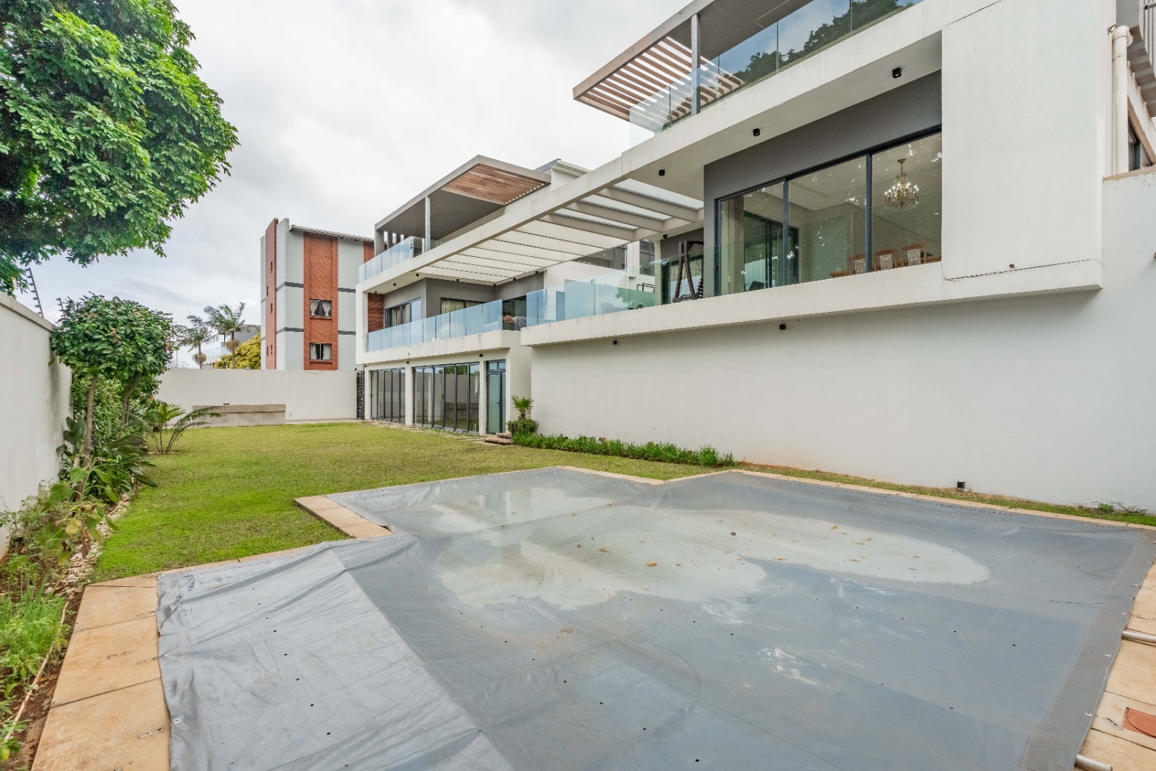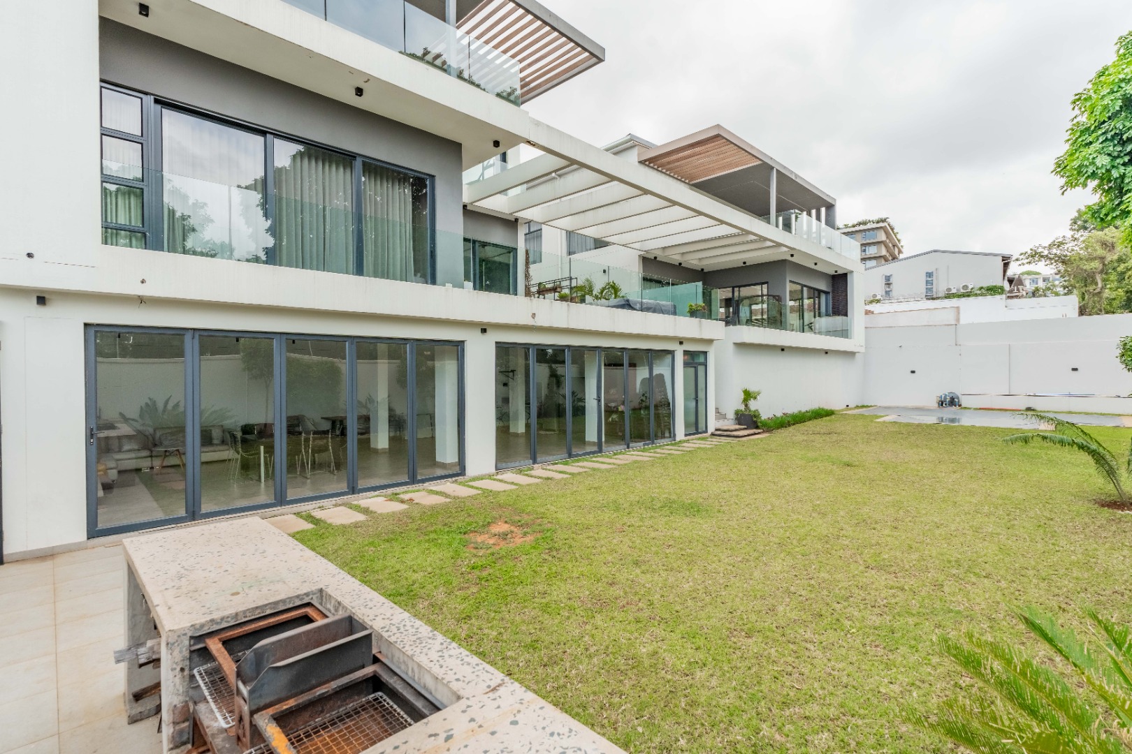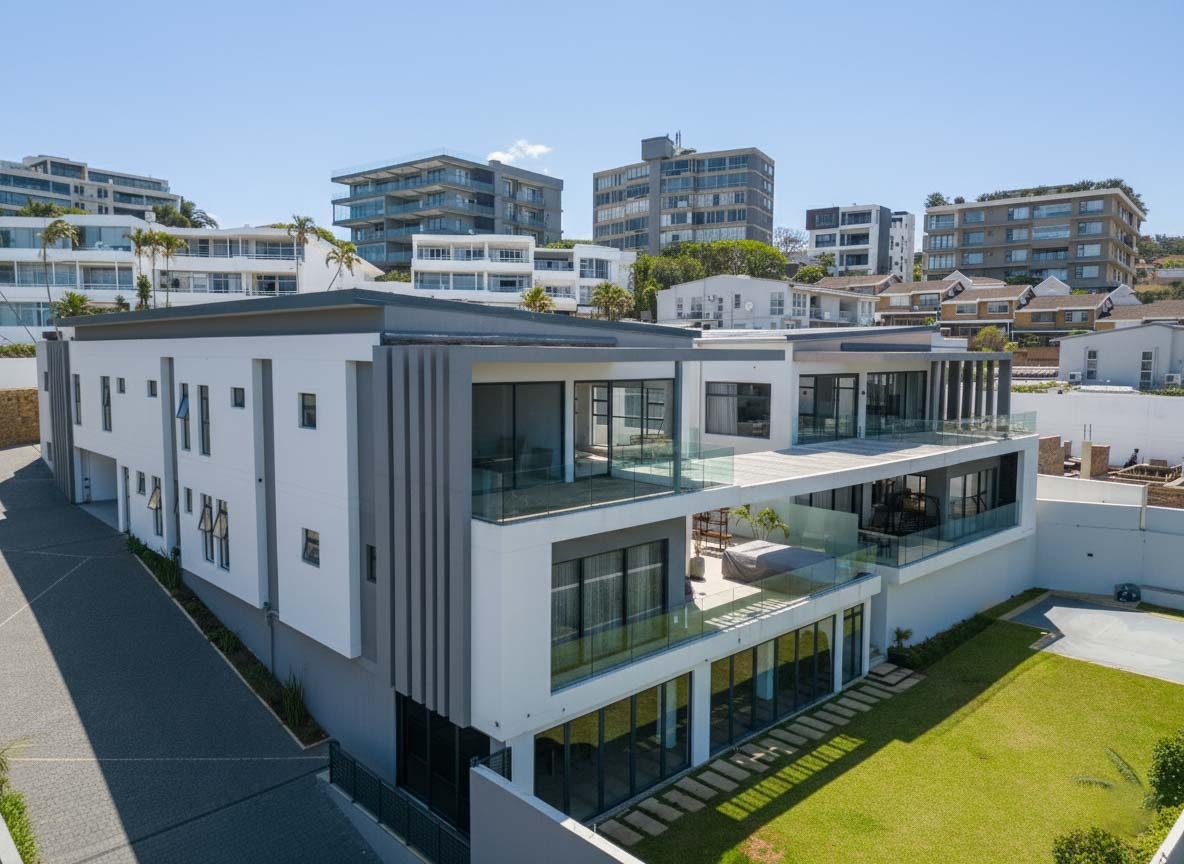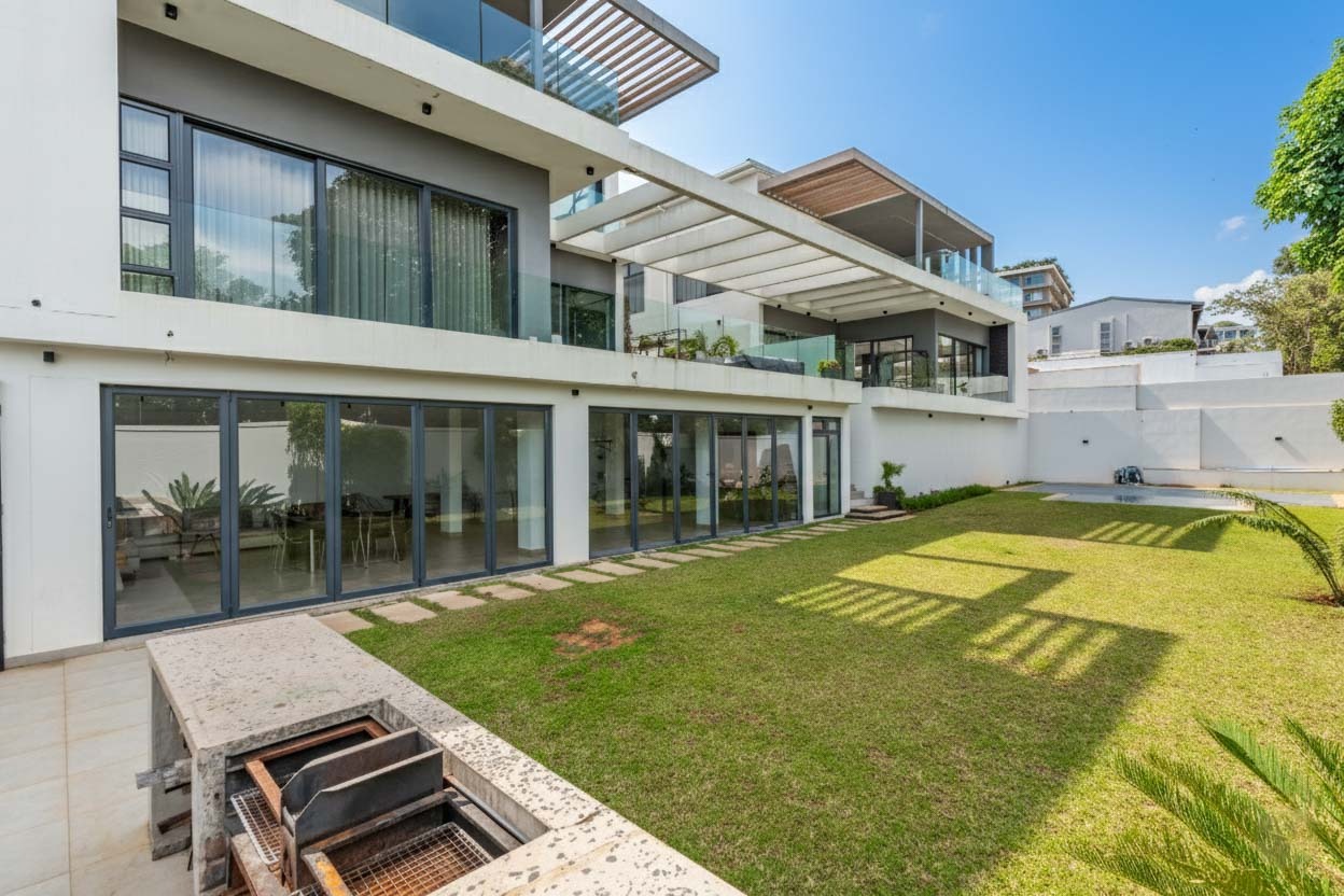 This premium 667sqm drive-up unit in Morningside offers 507sqm of modern single-level living with a private 160sqm yard, complemented by valuable common facilities including a fully enclosed entertainment area with a kitchen, a swimming pool with a full bathroom, and a landscaped garden with a built-in braai and pizza oven. The home features four en-suite bedrooms, including a master suite with a dressing room, a second bedroom with a jacuzzi, and a third bedroom with a wudhu area. The living spaces include two lounges, an entrance hall, a guest bathroom, a modern kitchen with a scullery, a dining room, a skylight-covered patio, a laundry room, a helper’s room with its own bathroom, two storerooms, and a double garage with additional covered and open parking.
