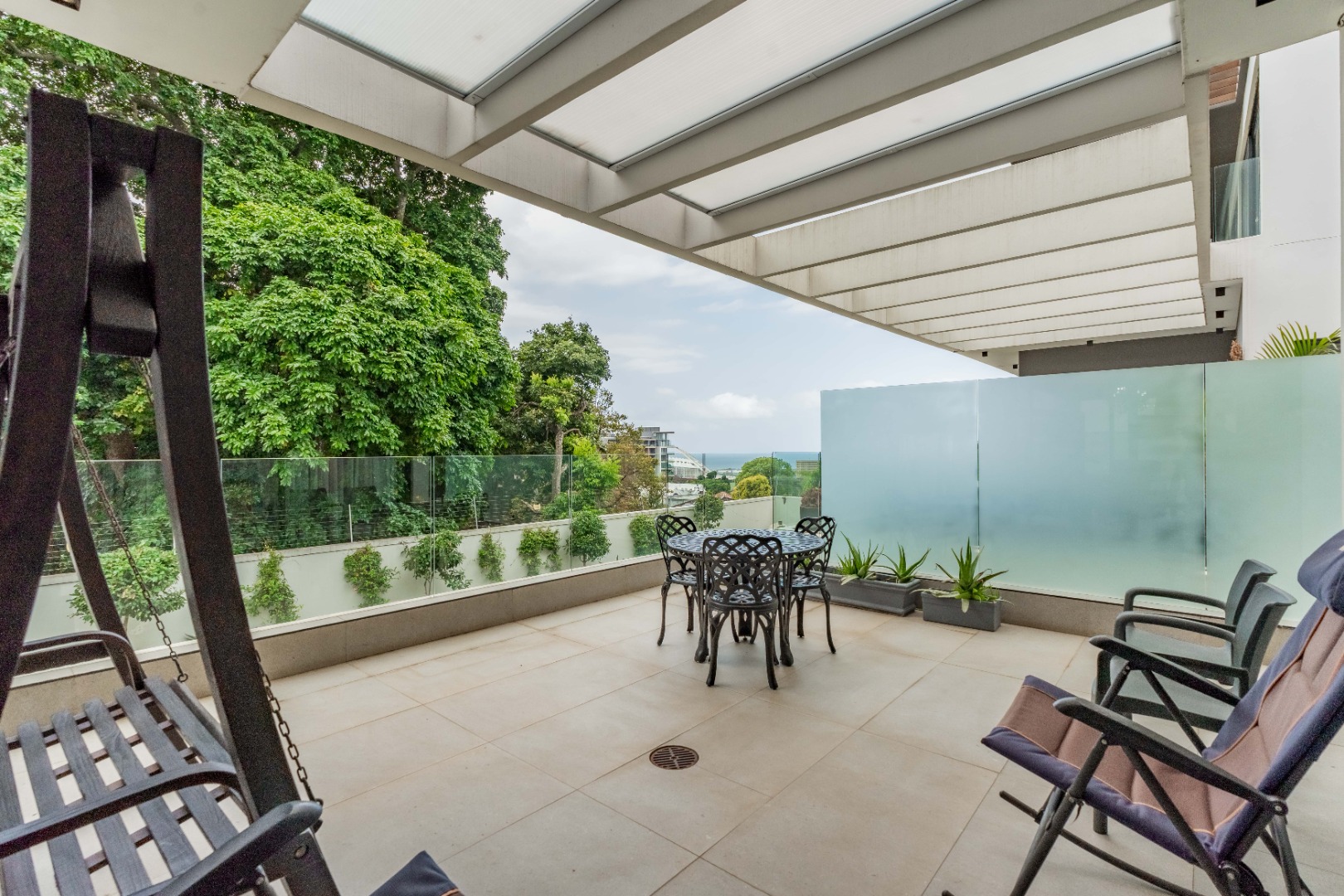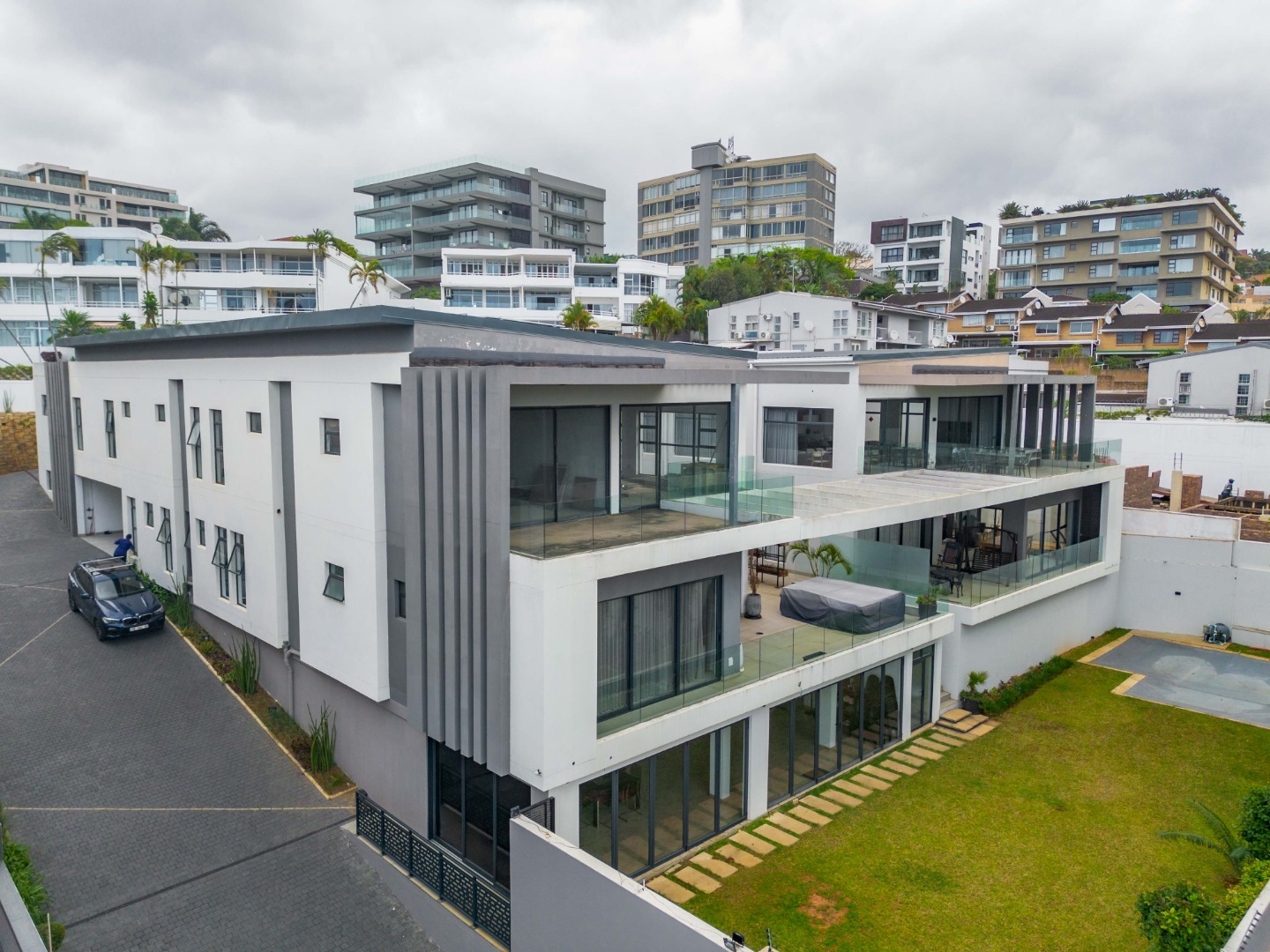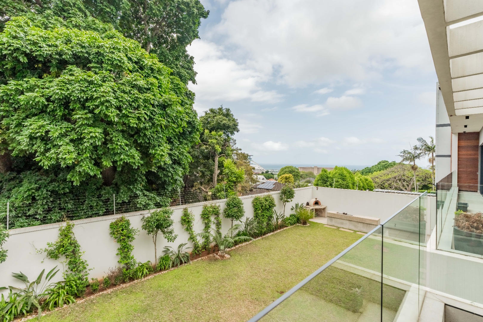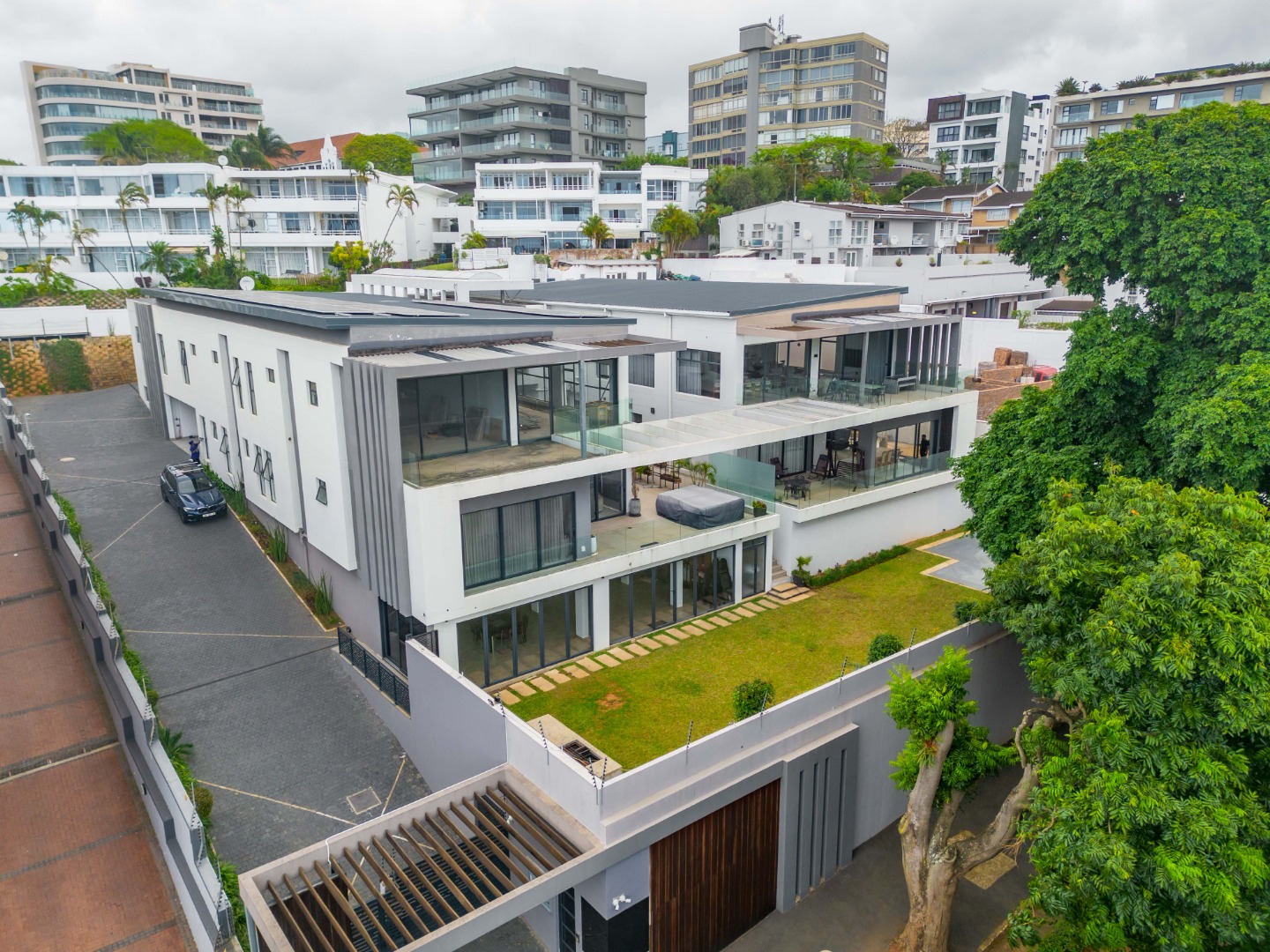 This premium 667sqm drive-up unit in Morningside offers 507sqm of modern single-level living with a private 160sqm yard, complemented by valuable common facilities including a fully enclosed entertainment area with a kitchen, a swimming pool with a full bathroom, and a landscaped garden with a built-in braai and pizza oven. The home features four en-suite bedrooms, including a master suite with a dressing room, a second bedroom with a jacuzzi, and a third bedroom with a wudhu area. The living spaces include two lounges, an entrance hall, a guest bathroom, a modern kitchen with a scullery, a dining room, a skylight-covered patio, a laundry room, a helper’s room with its own bathroom, two storerooms, and a double garage with additional covered and open parking.