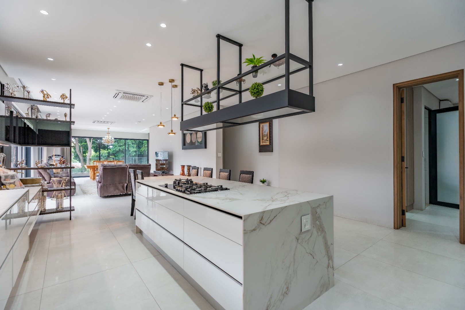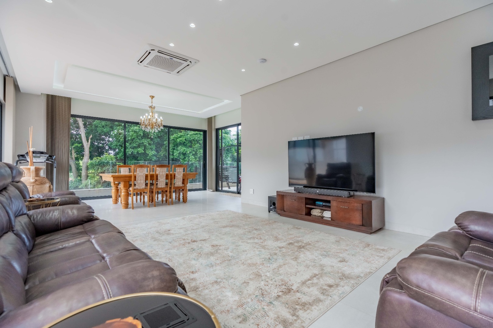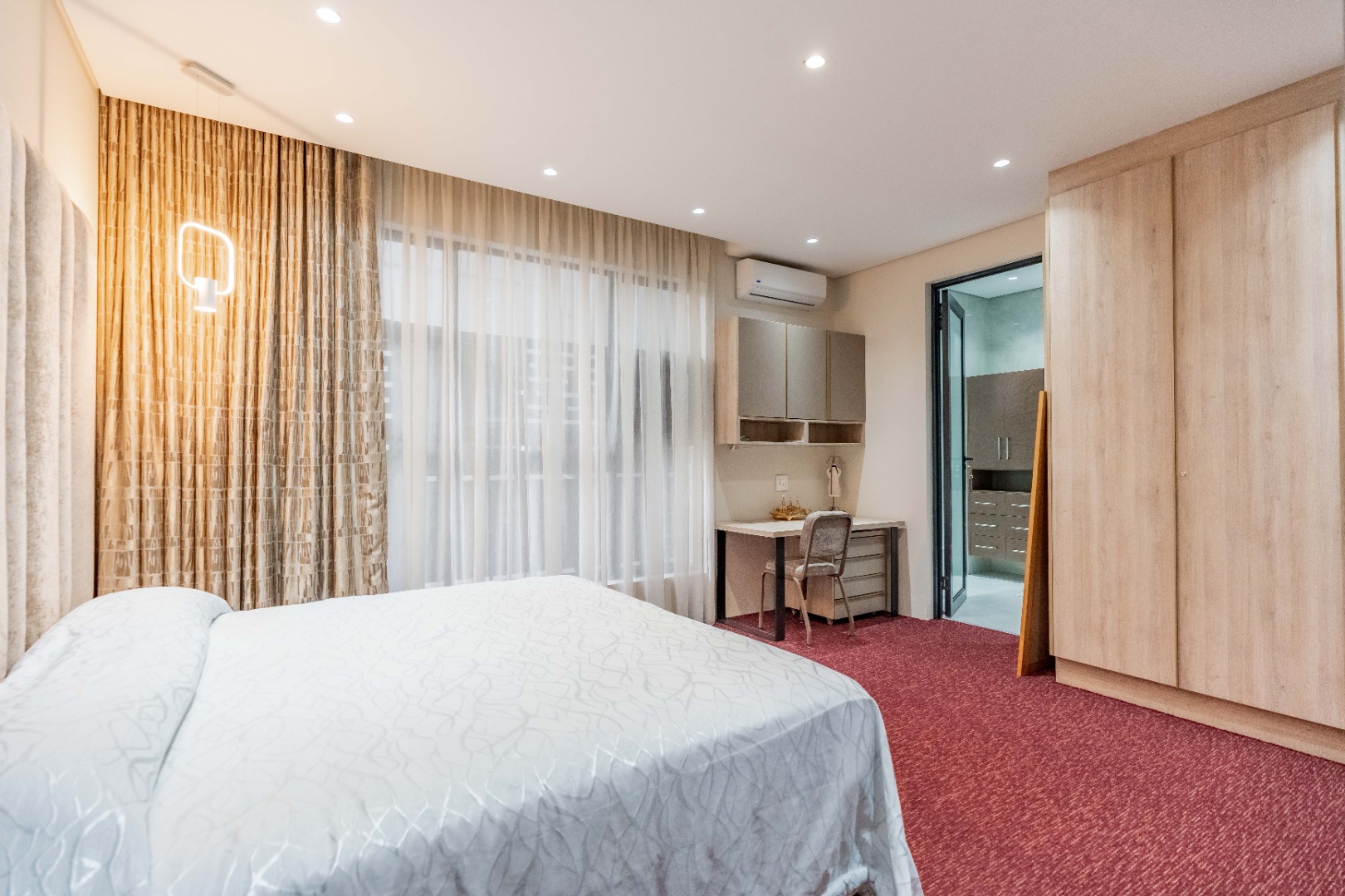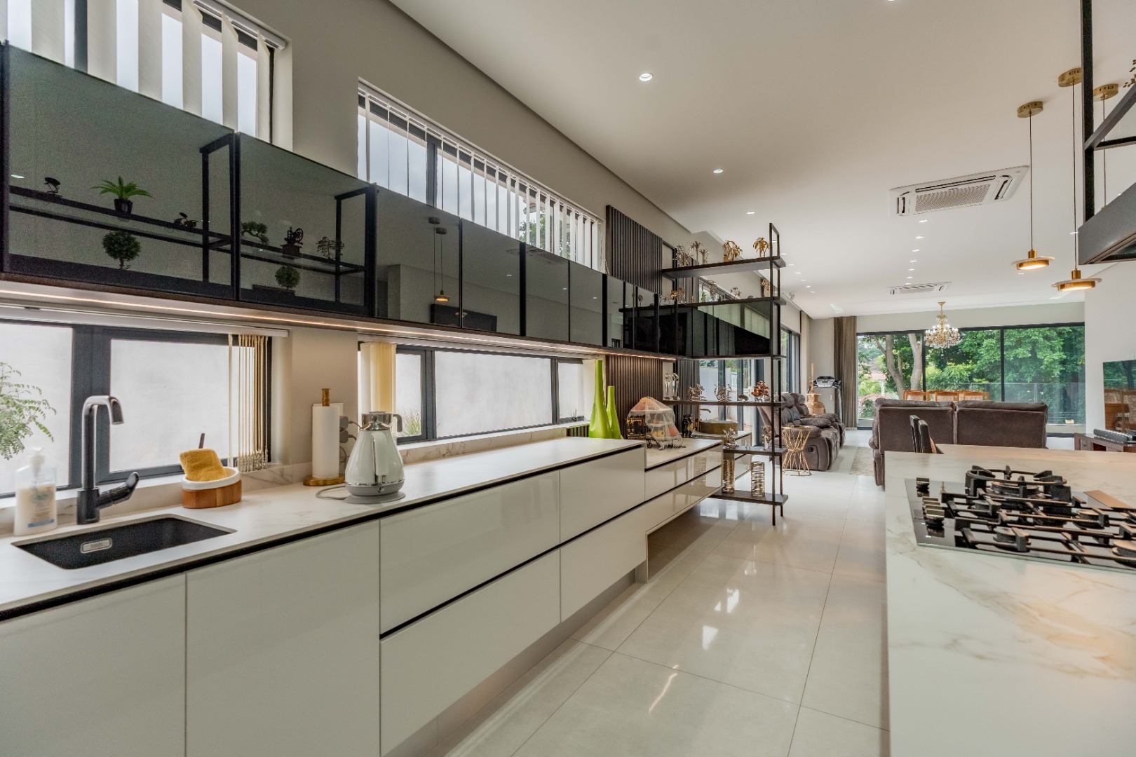 Recently built and less than three years old, the unit showcases high-spec finishes supplied by Classic & Lifestyle, including porcelain tiles, premium sanitaryware, Trellidoor mosquito nets, wave-track curtain rails, and two geysers. The custom cabinetry throughout the bedrooms, kitchen, scullery, and bathrooms—with Dekton stone surfaces—was designed and installed by Kitchen Studio. The kitchen includes a new Siemens oven and gas stove, and the home is further enhanced with custom blinds, seven Carrier inverter air-conditioners, a full alarm system with indoor and outdoor beams, video intercom access, fibre connectivity, wired network points, satellite connections, and provisions for additional surveillance cameras. The property also includes backup water tanks connected to the main supply and a guard house, with security staff currently on duty from 6pm to 6am. Optional extras include a Victron 15kVA inverter system with solar panels, a Siemens integrated fridge and freezer, and bedroom curtains, with certain items excluded and listed separately.