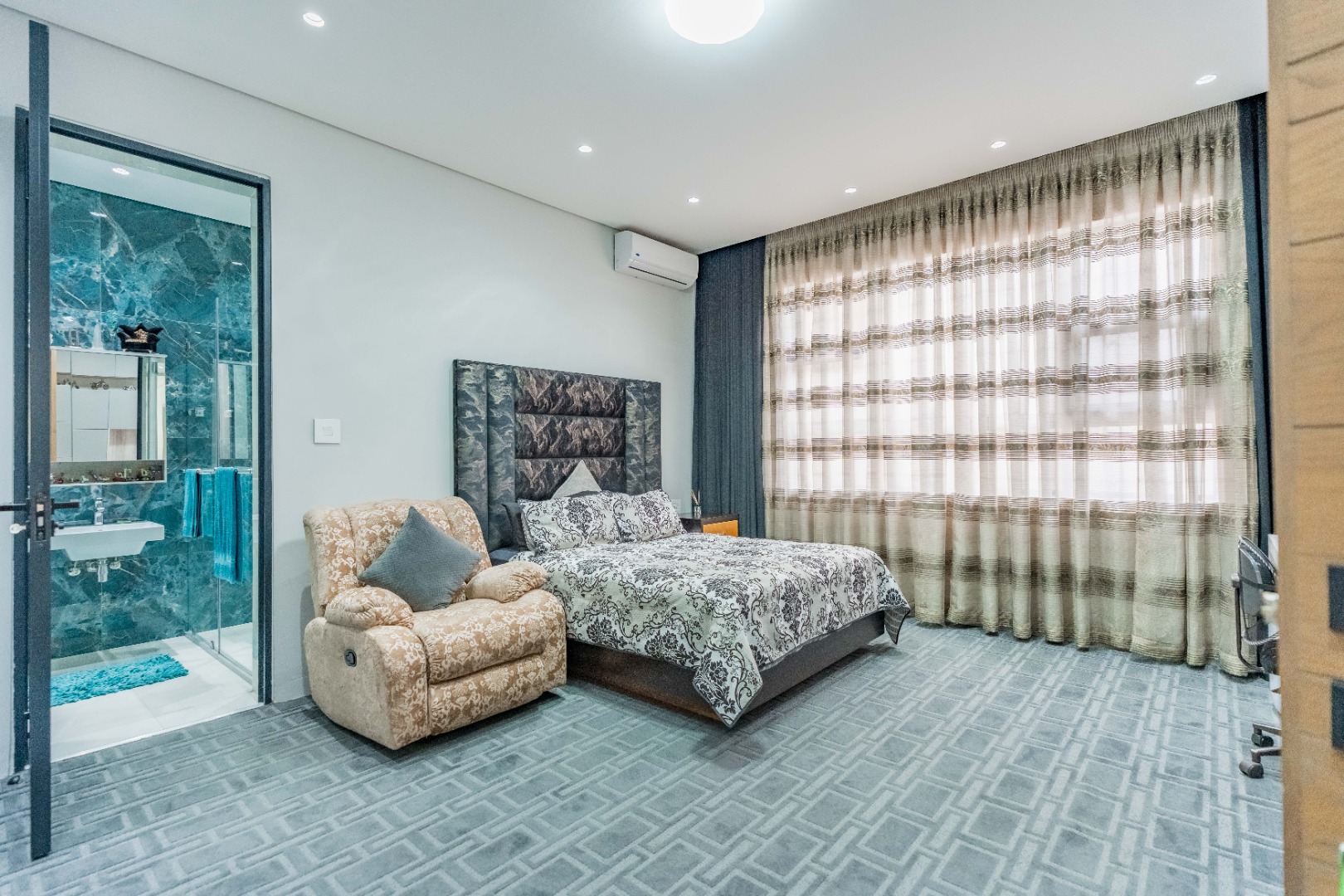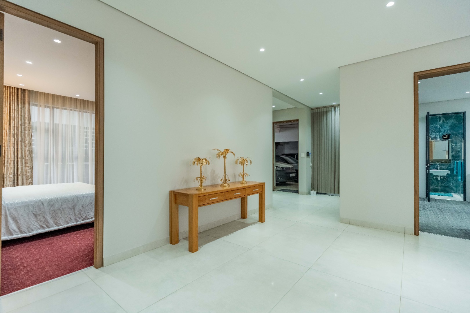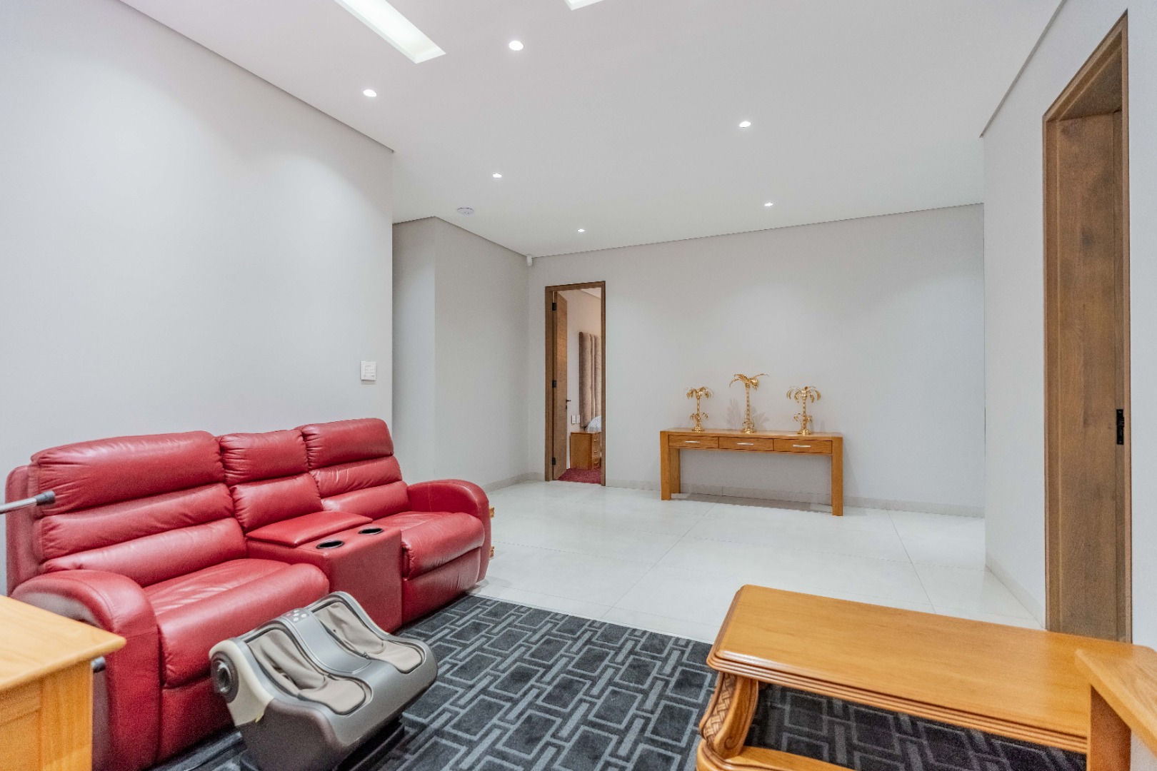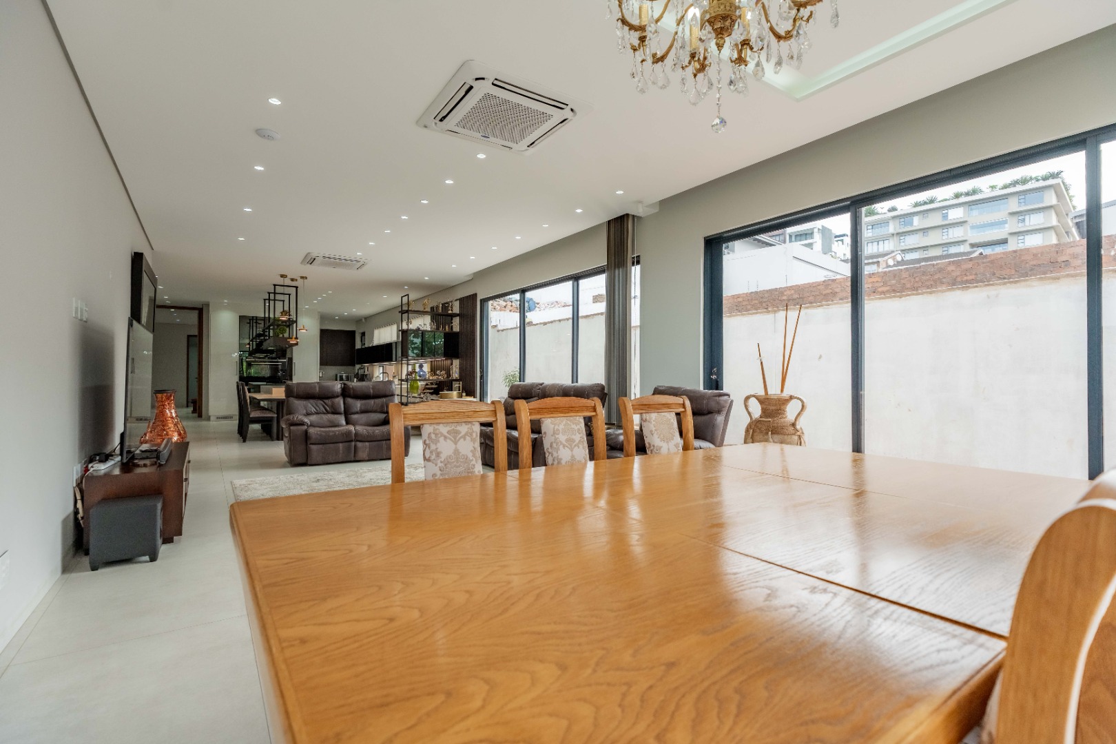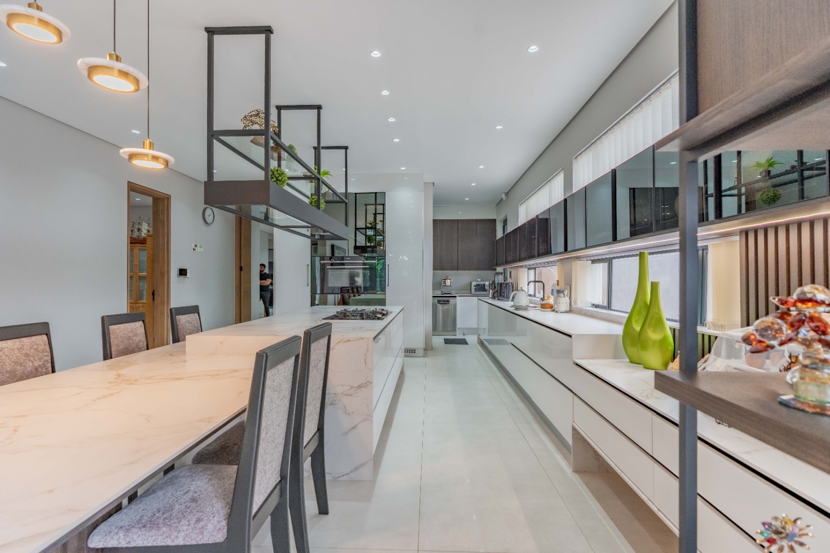 Recently built and less than three years old, the unit showcases high-spec finishes supplied by Classic & Lifestyle, including porcelain tiles, premium sanitaryware, Trellidoor mosquito nets, wave-track curtain rails, and two geysers. The custom cabinetry throughout the bedrooms, kitchen, scullery, and bathrooms—with Dekton stone surfaces—was designed and installed by Kitchen Studio. The kitchen includes a new Siemens oven and gas stove, and the home is further enhanced with custom blinds, seven Carrier inverter air-conditioners, a full alarm system with indoor and outdoor beams, video intercom access, fibre connectivity, wired network points, satellite connections, and provisions for additional surveillance cameras. The property also includes backup water tanks connected to the main supply and a guard house, with security staff currently on duty from 6pm to 6am. Optional extras include a Victron 15kVA inverter system with solar panels, a Siemens integrated fridge and freezer, and bedroom curtains, with certain items excluded and listed separately.
