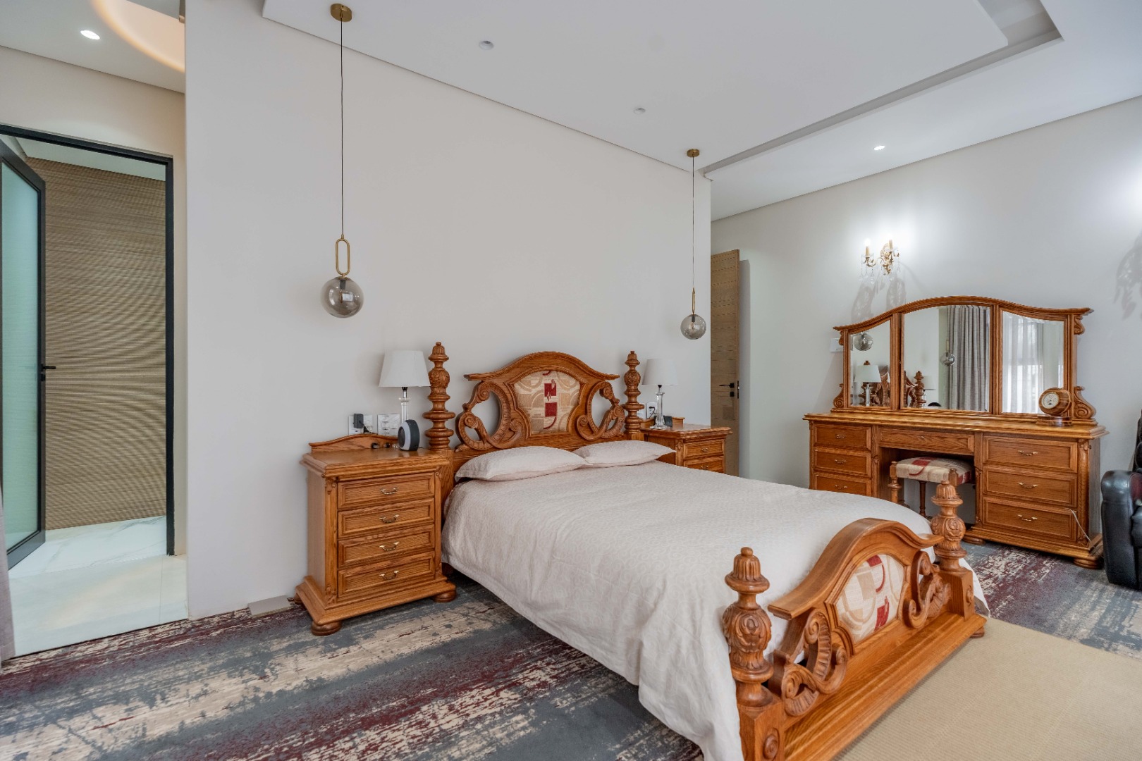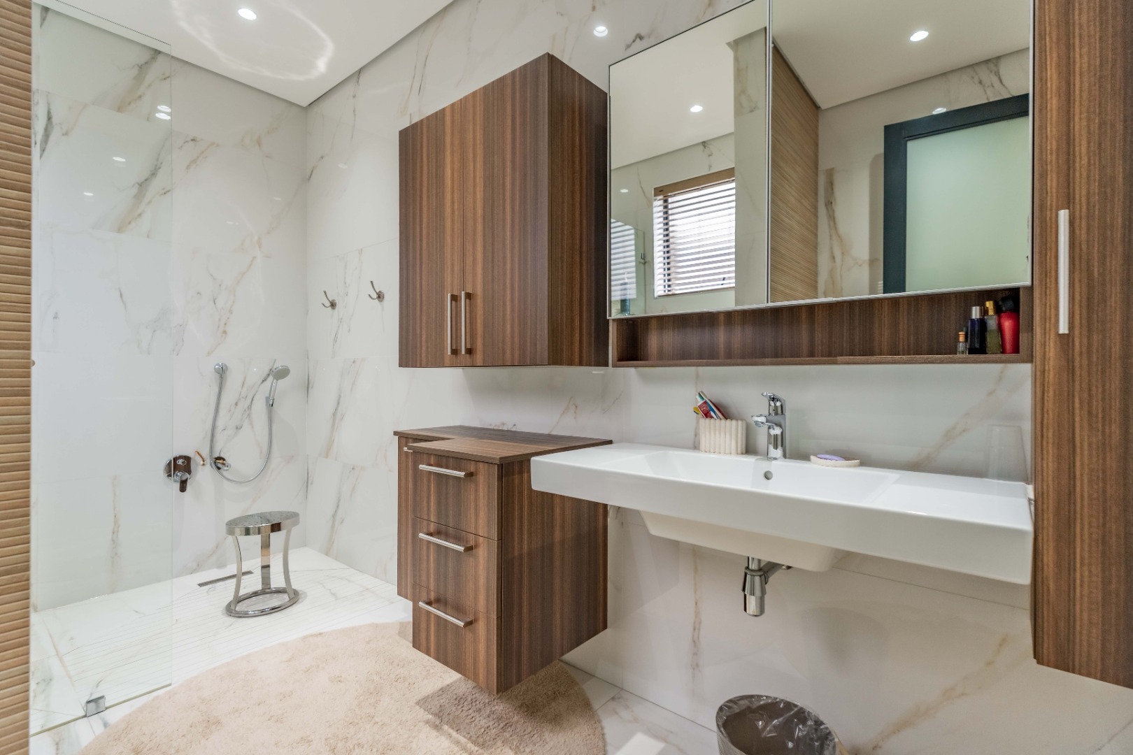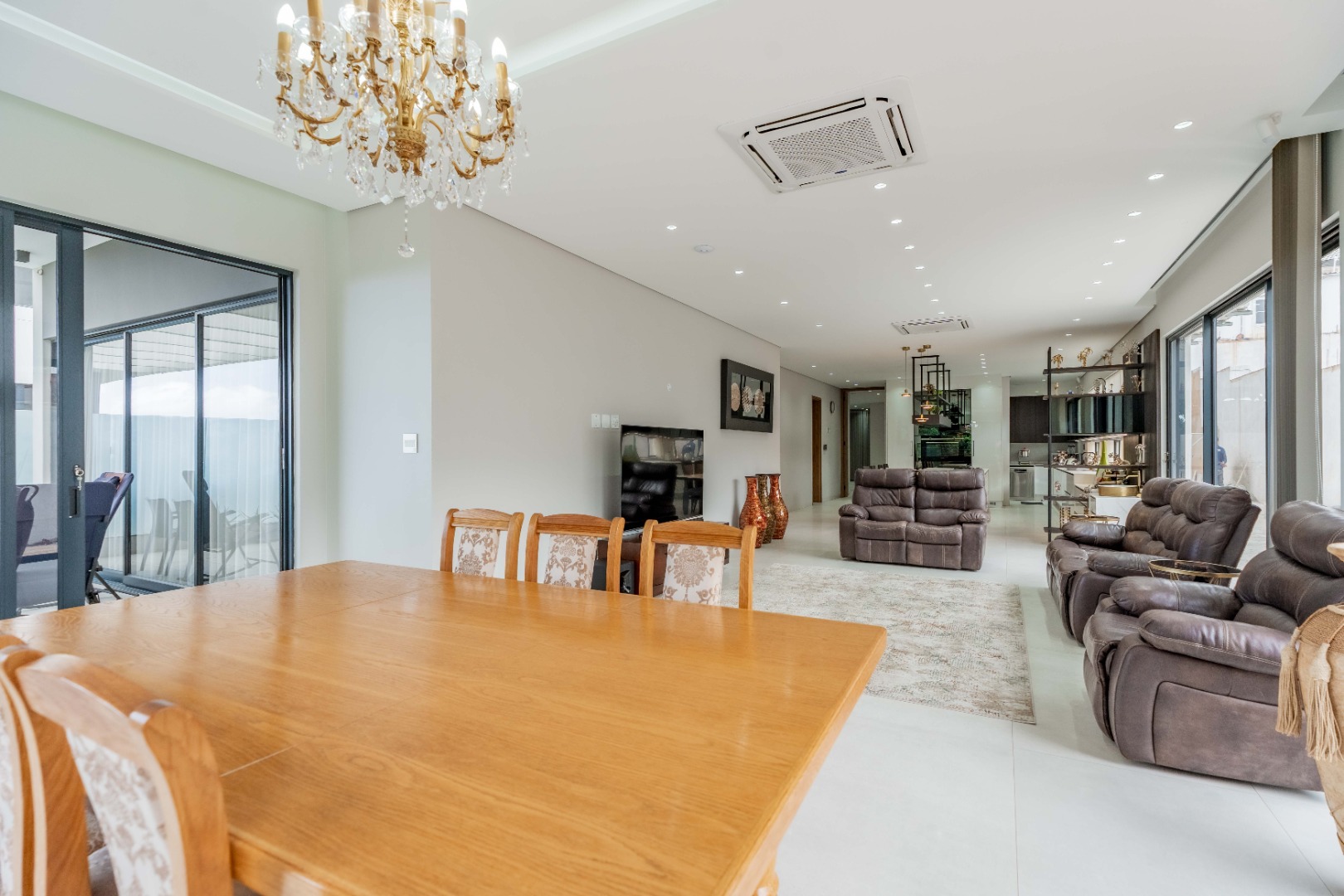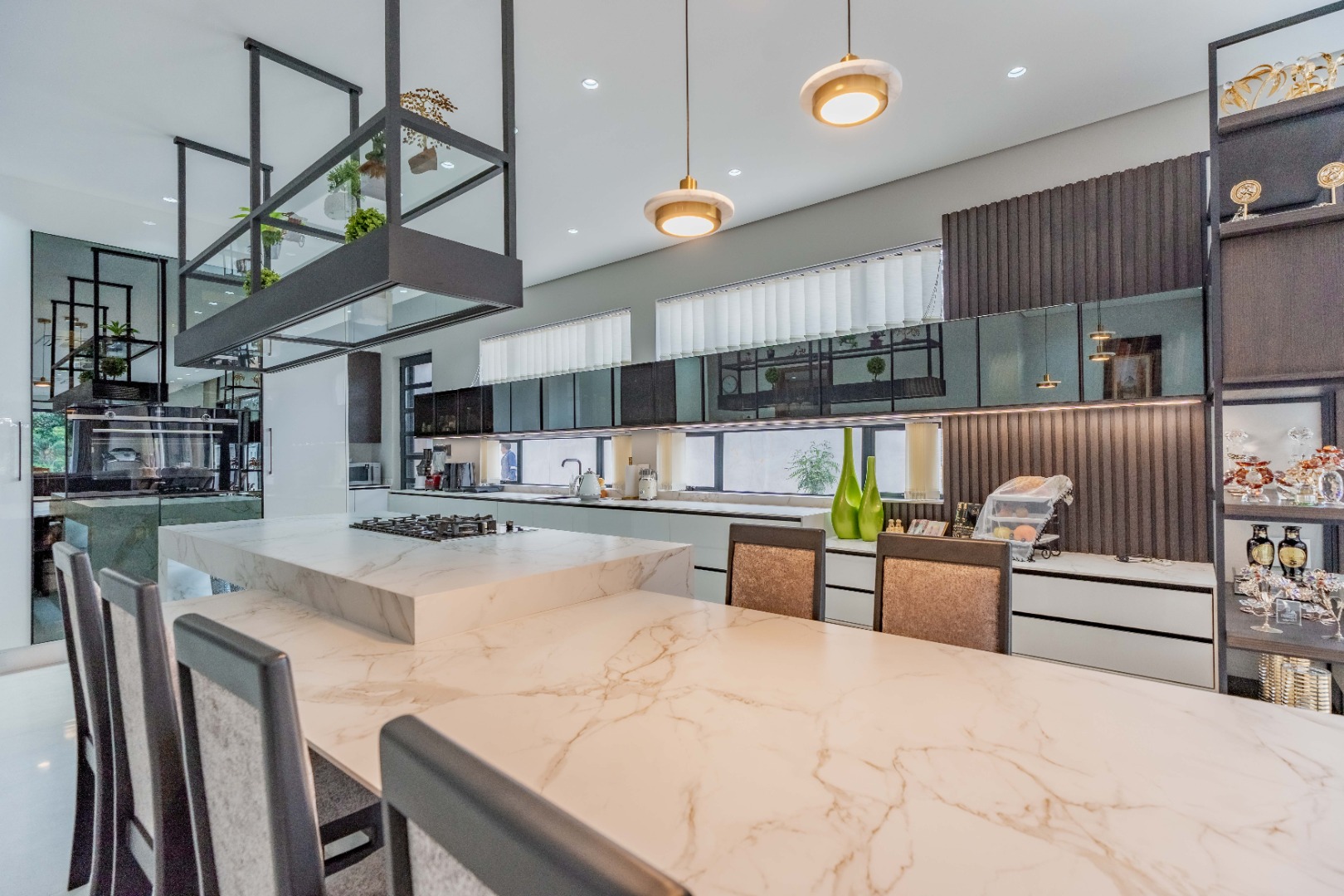 Recently built and less than three years old, the unit showcases high-spec finishes supplied by Classic & Lifestyle, including porcelain tiles, premium sanitaryware, Trellidoor mosquito nets, wave-track curtain rails, and two geysers. The custom cabinetry throughout the bedrooms, kitchen, scullery, and bathrooms—with Dekton stone surfaces—was designed and installed by Kitchen Studio. The kitchen includes a new Siemens oven and gas stove, and the home is further enhanced with custom blinds, seven Carrier inverter air-conditioners, a full alarm system with indoor and outdoor beams, video intercom access, fibre connectivity, wired network points, satellite connections, and provisions for additional surveillance cameras. The property also includes backup water tanks connected to the main supply and a guard house, with security staff currently on duty from 6pm to 6am. Optional extras include a Victron 15kVA inverter system with solar panels, a Siemens integrated fridge and freezer, and bedroom curtains, with certain items excluded and listed separately.