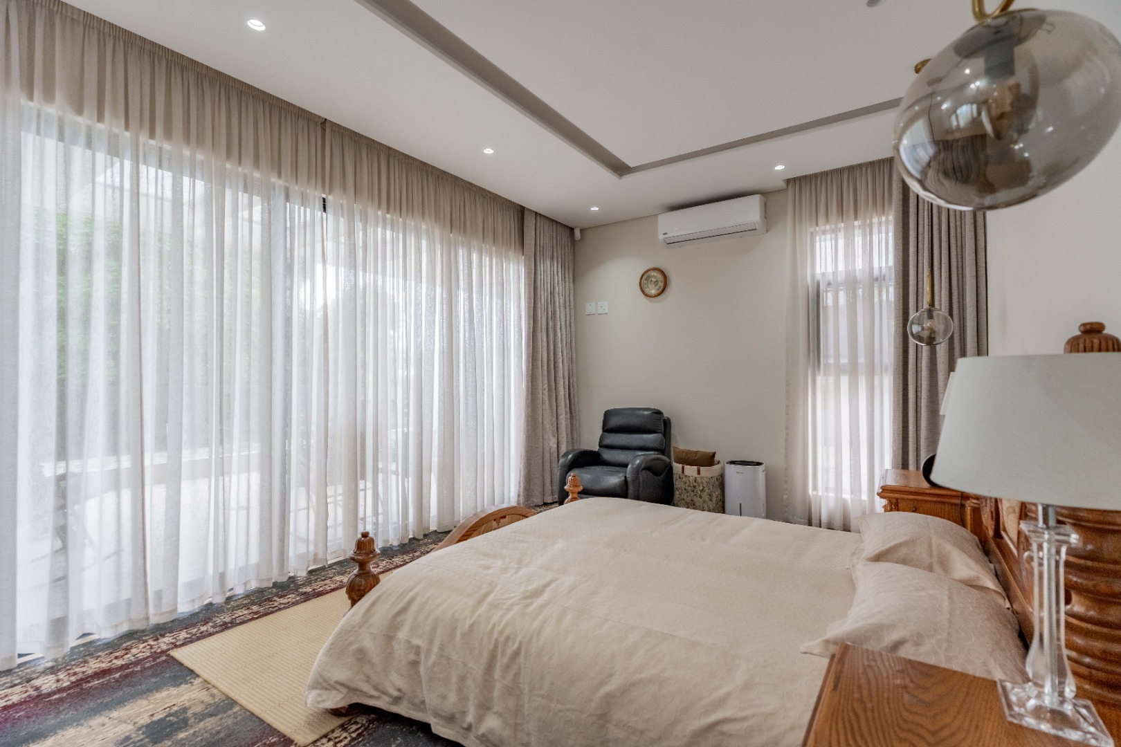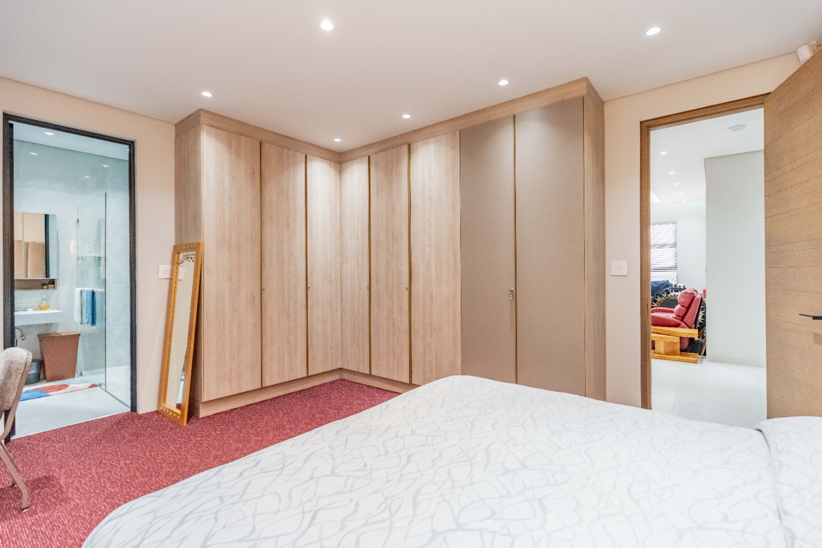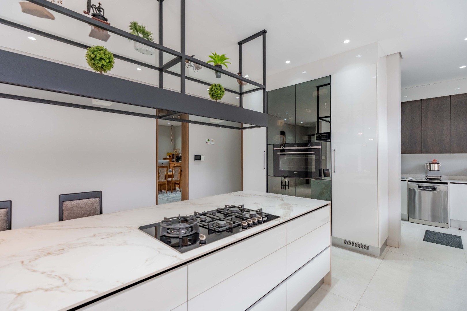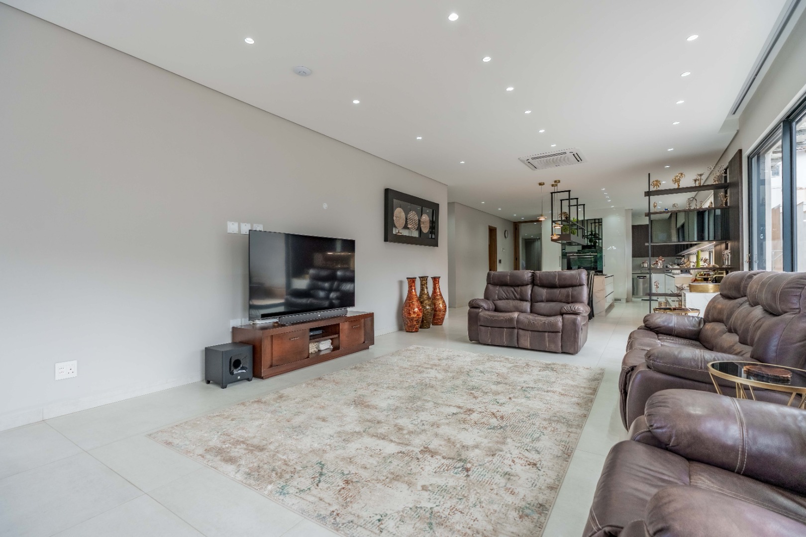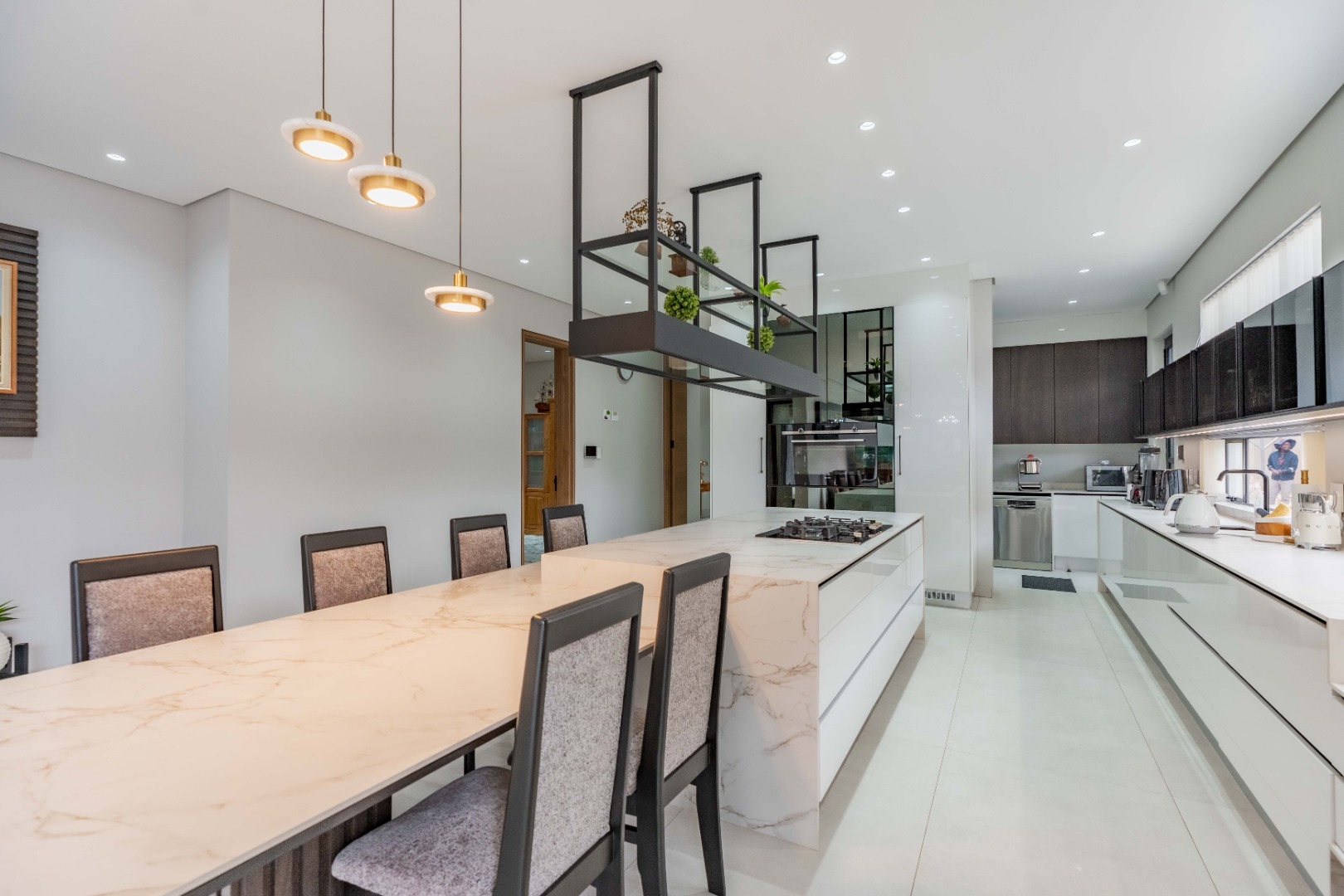 Recently built and less than three years old, the unit showcases high-spec finishes supplied by Classic & Lifestyle, including porcelain tiles, premium sanitaryware, Trellidoor mosquito nets, wave-track curtain rails, and two geysers. The custom cabinetry throughout the bedrooms, kitchen, scullery, and bathrooms—with Dekton stone surfaces—was designed and installed by Kitchen Studio. The kitchen includes a new Siemens oven and gas stove, and the home is further enhanced with custom blinds, seven Carrier inverter air-conditioners, a full alarm system with indoor and outdoor beams, video intercom access, fibre connectivity, wired network points, satellite connections, and provisions for additional surveillance cameras. The property also includes backup water tanks connected to the main supply and a guard house, with security staff currently on duty from 6pm to 6am. Optional extras include a Victron 15kVA inverter system with solar panels, a Siemens integrated fridge and freezer, and bedroom curtains, with certain items excluded and listed separately.