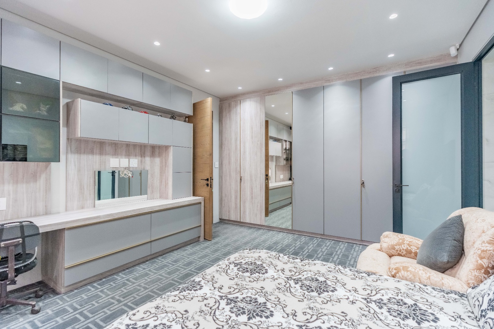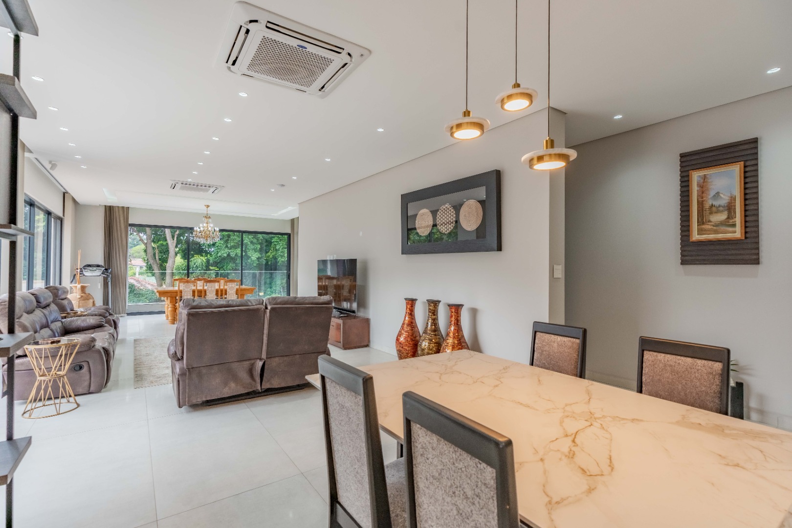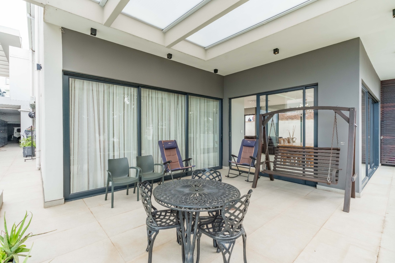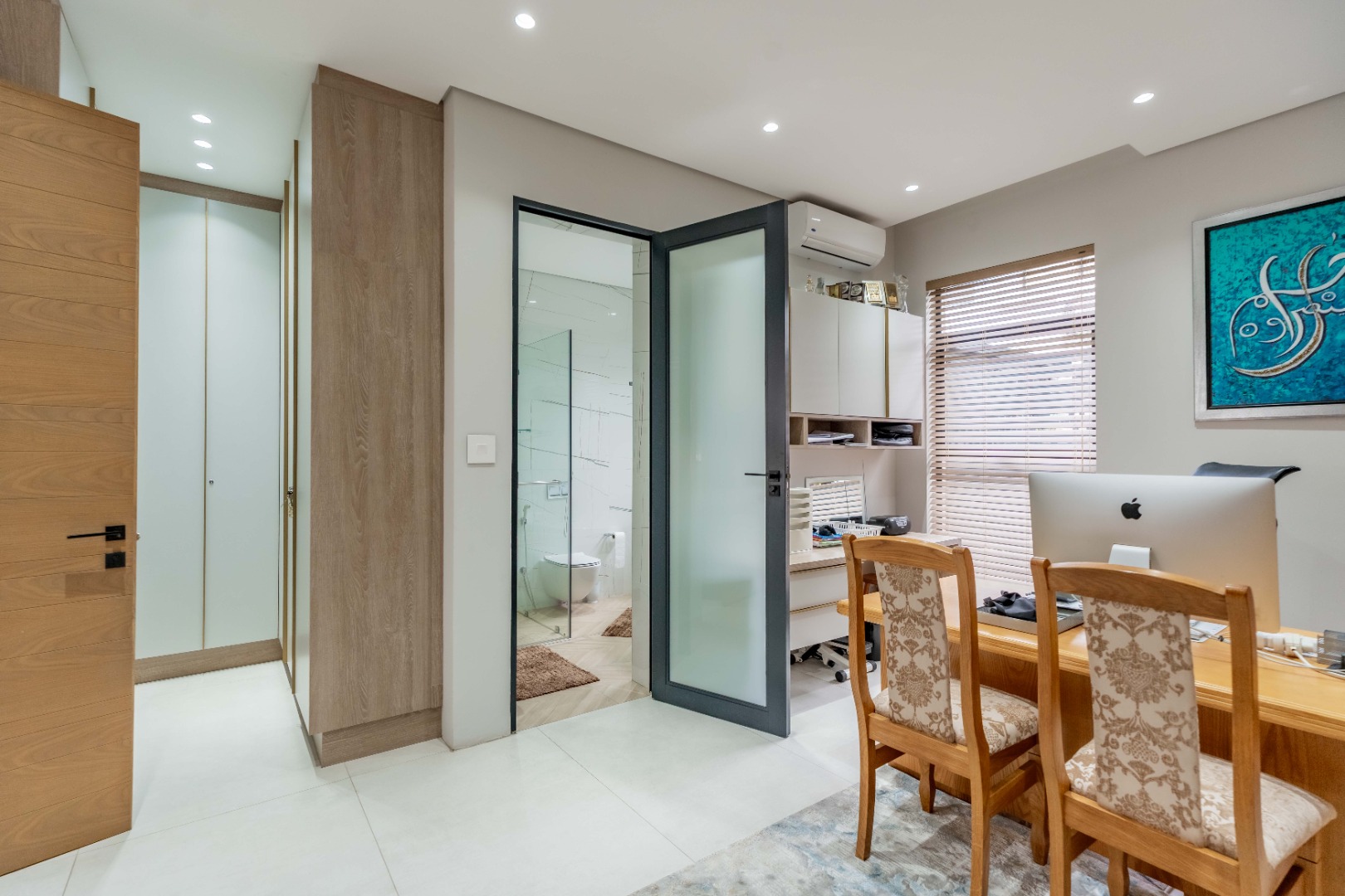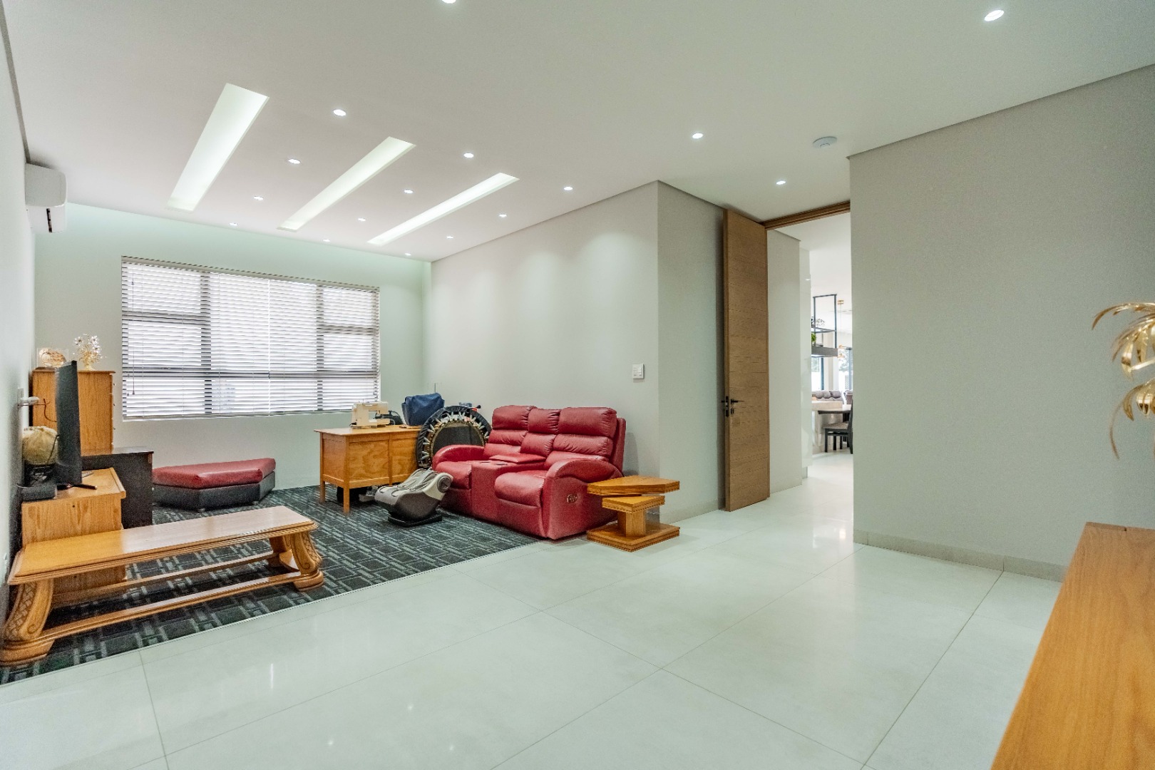 Recently built and less than three years old, the unit showcases high-spec finishes supplied by Classic & Lifestyle, including porcelain tiles, premium sanitaryware, Trellidoor mosquito nets, wave-track curtain rails, and two geysers. The custom cabinetry throughout the bedrooms, kitchen, scullery, and bathrooms—with Dekton stone surfaces—was designed and installed by Kitchen Studio. The kitchen includes a new Siemens oven and gas stove, and the home is further enhanced with custom blinds, seven Carrier inverter air-conditioners, a full alarm system with indoor and outdoor beams, video intercom access, fibre connectivity, wired network points, satellite connections, and provisions for additional surveillance cameras. The property also includes backup water tanks connected to the main supply and a guard house, with security staff currently on duty from 6pm to 6am. Optional extras include a Victron 15kVA inverter system with solar panels, a Siemens integrated fridge and freezer, and bedroom curtains, with certain items excluded and listed separately.