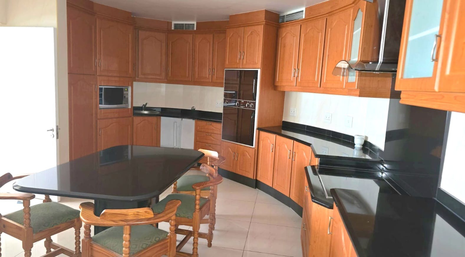 The fully fitted kitchen boasts granite countertops and a separate fitted pantry with additional sinks. The open-plan lounge and dining area flow seamlessly, enjoying breath taking sea views throughout. Ducted air-conditioning is installed throughout the apartment.