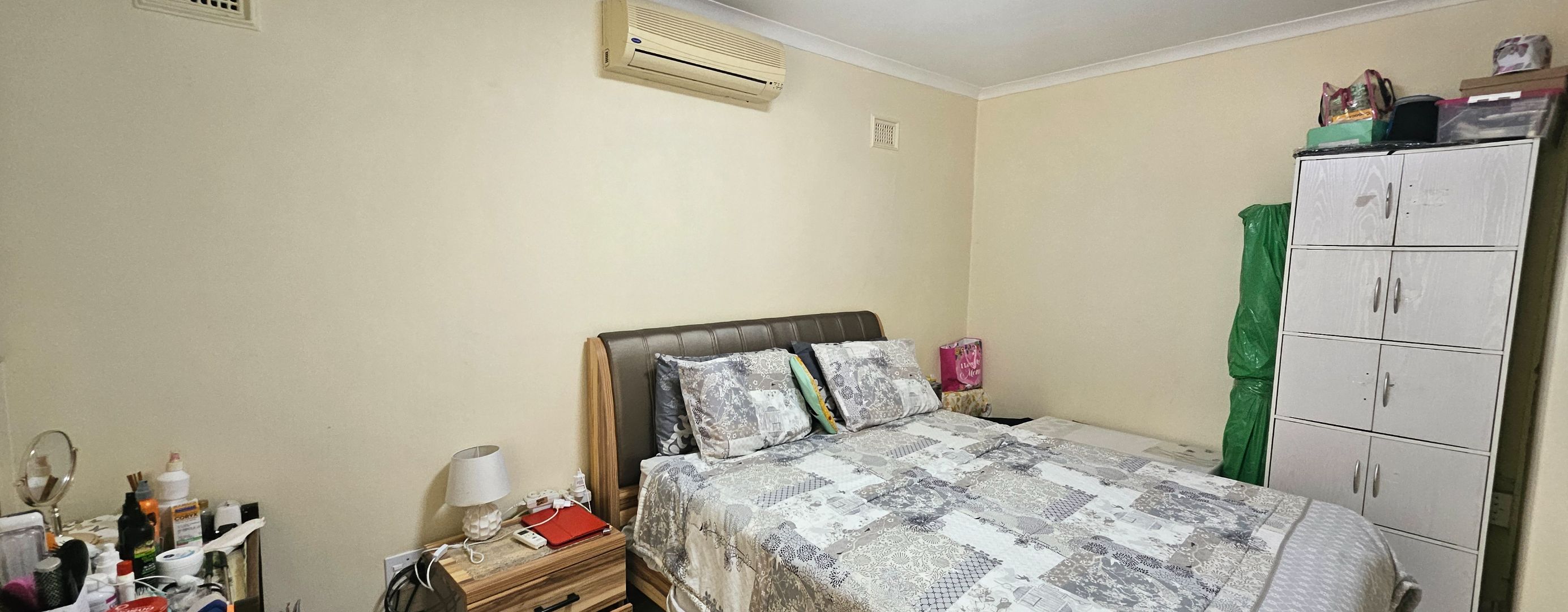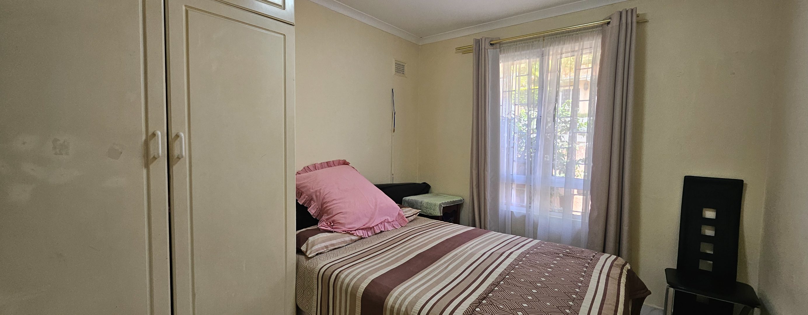 The residence comprises two well-proportioned bedrooms, each designed for comfort and practicality. Both bedrooms benefit from natural light, with windows fitted with security bars for peace of mind. Built-in wardrobes provide essential storage solutions, while air conditioning units ensure a comfortable climate. The single bathroom is conveniently located.