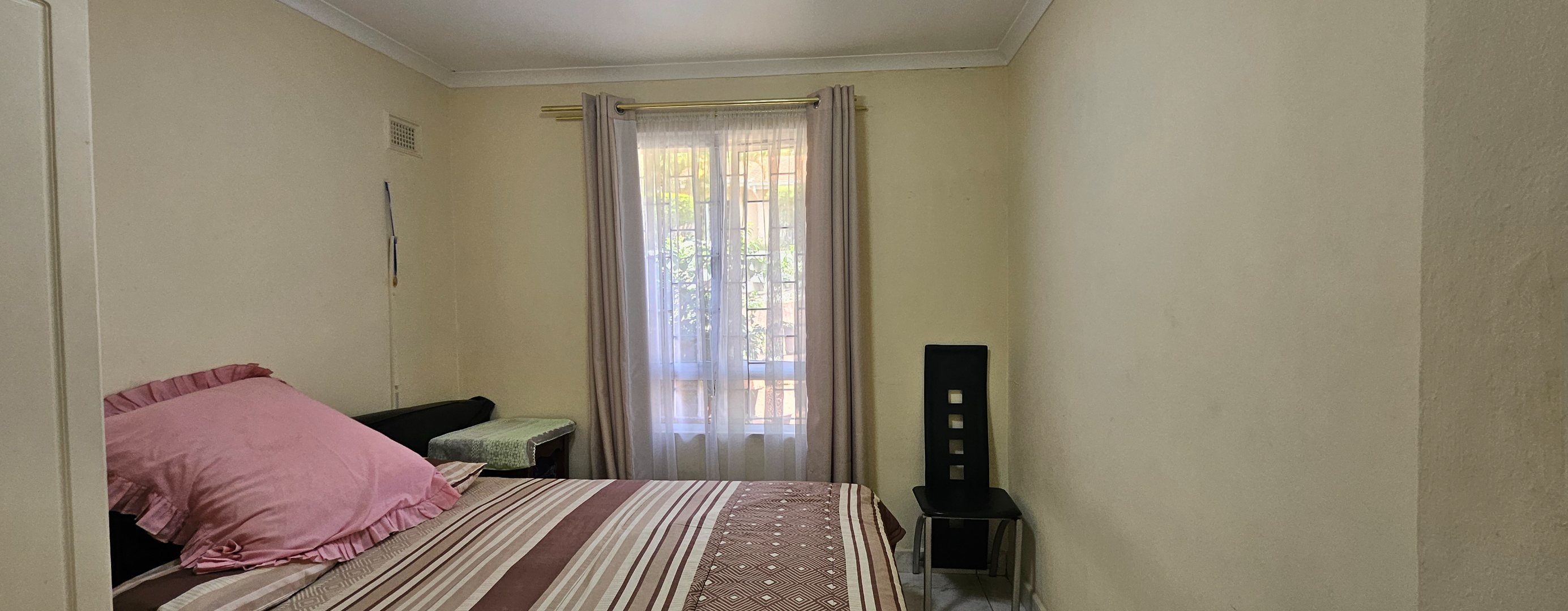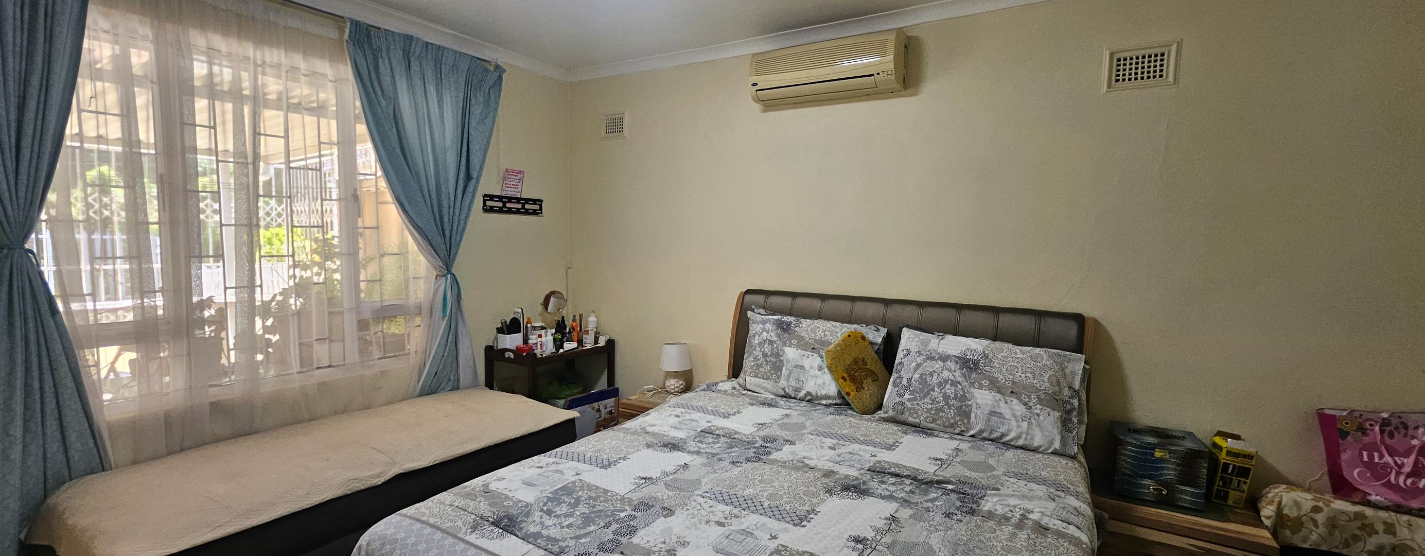 The residence comprises two well-proportioned bedrooms, each designed for comfort and practicality. Both bedrooms benefit from natural light, with windows fitted with security bars for peace of mind. Built-in wardrobes provide essential storage solutions, while air conditioning units ensure a comfortable climate. The single bathroom is conveniently located.