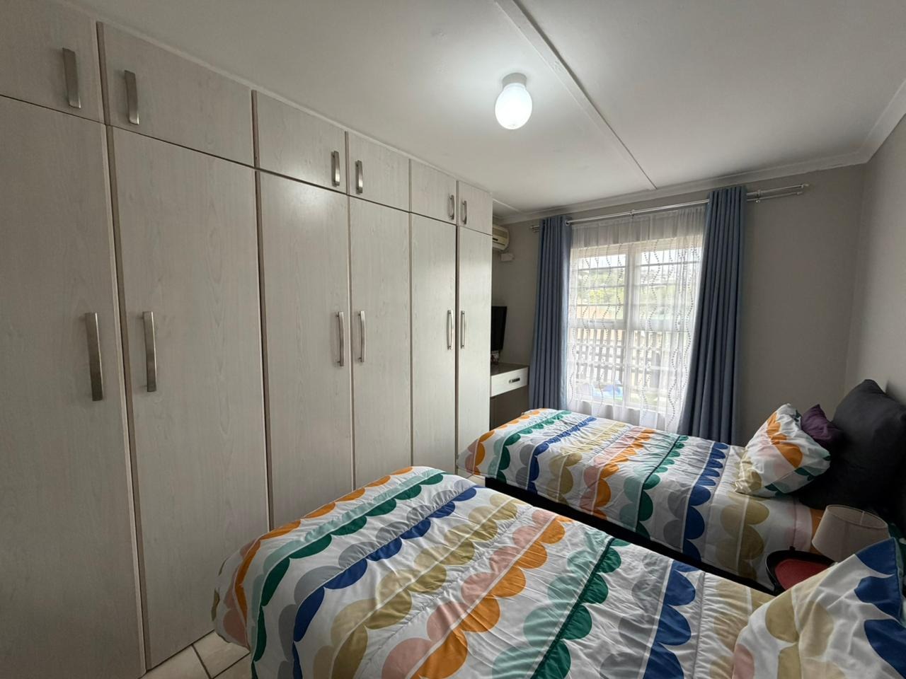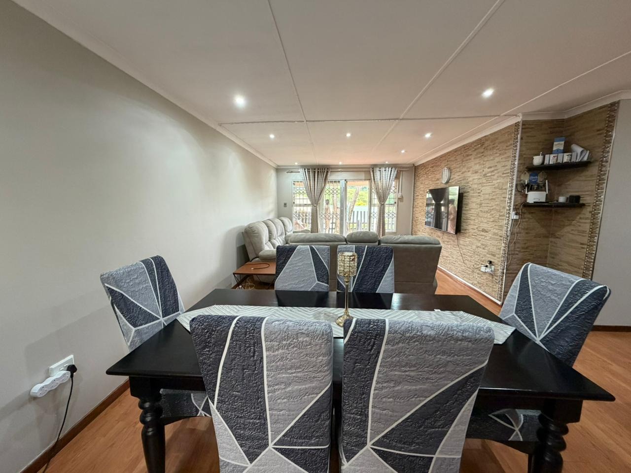 Inside, a spacious, brightly lit living area boasts attractive wooden laminate flooring and modern lighting. A textured accent wall adds character, with sliding glass doors opening to the outdoor patio. The home includes two comfortable bedrooms, each featuring built-in wardrobes and air conditioning for optimal comfort and storage.