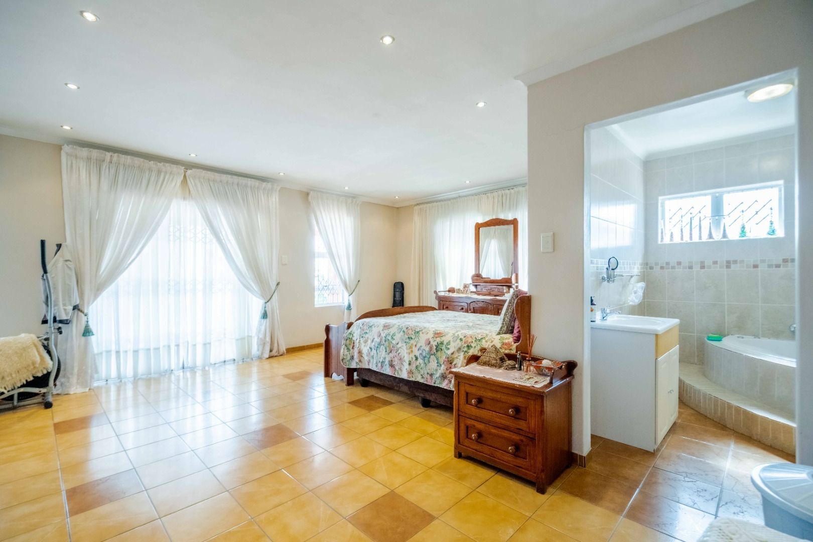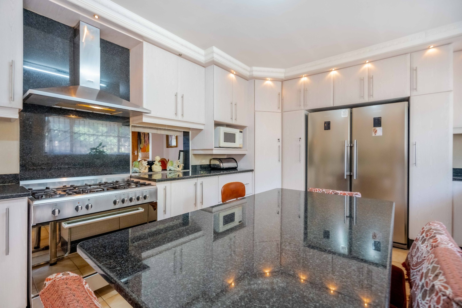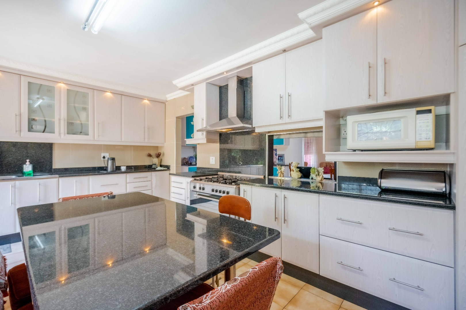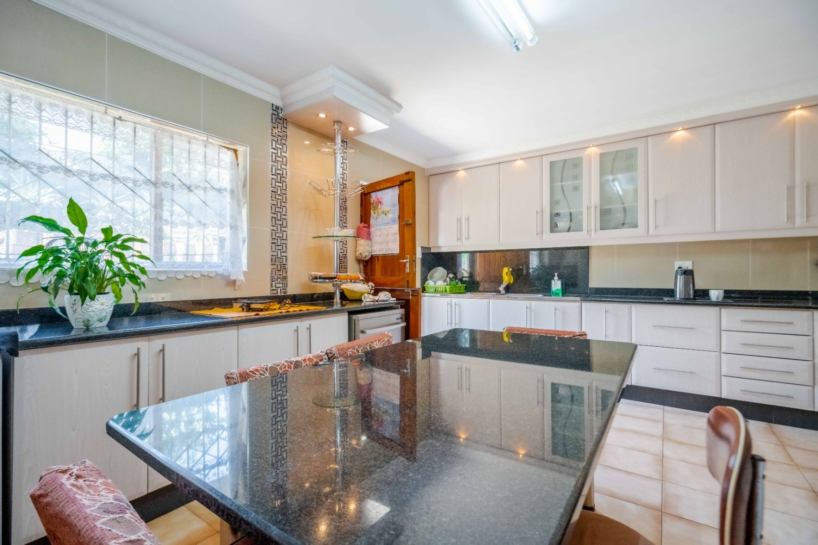 Impeccably maintained, this stunning home is located in the desirable Springfield suburb, just off Fyfe Road in Morningside. Boasting both size and character, this residence is bathed in natural light. Upon entering, you are greeted with ample parking space and a double garage that provides direct access to the home. The entrance hall leads to a cozy family lounge, seamlessly flowing into a spacious dining area with ample cupboard space. The fully fitted kitchen is beautifully finished with high-quality built-in cupboards, granite countertops, a center island, a high-powered extractor, downlighting fixtures, and plumbing for a washing machine and dishwasher. The kitchen conveniently leads to the back area of the property. The second bedroom is generously sized and features its own private ensuite, while a guest loo provides additional convenience. The master bedroom is impressively large, easily accommodating a king-size bed, and includes built-in cupboards and access to a balcony area. The main ensuite bathroom features a luxurious jacuzzi bath, a toilet, and a basin. The third and fourth bedrooms are equally spacious and well-appointed. The family bathroom is tastefully designed with a combined shower and bath, a basin, and is fully tiled throughout.