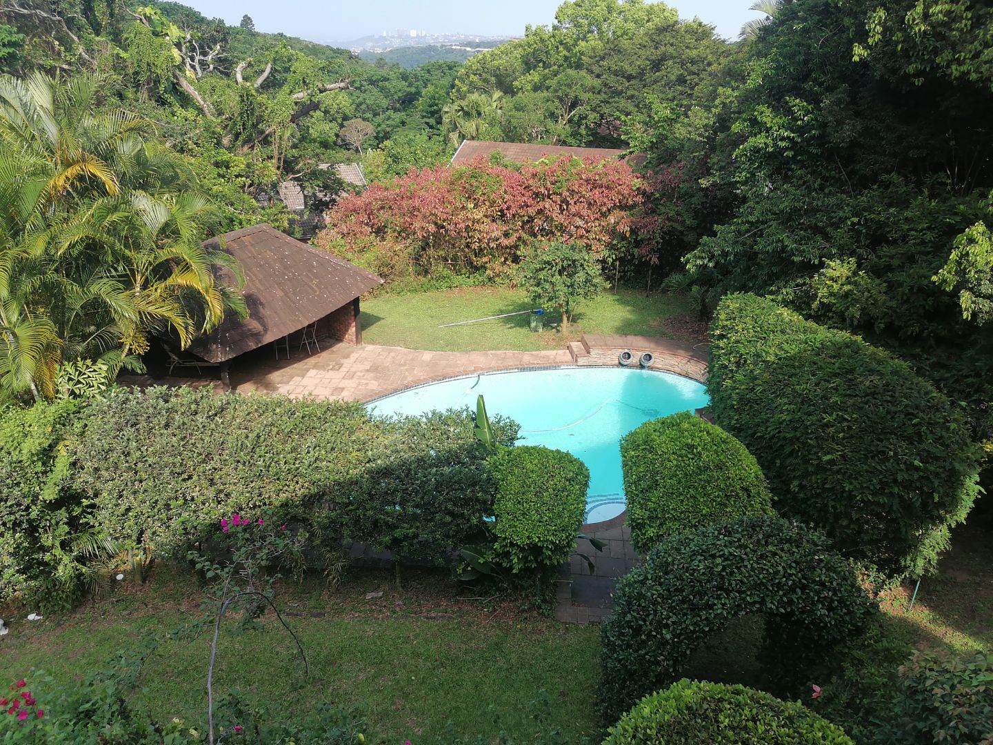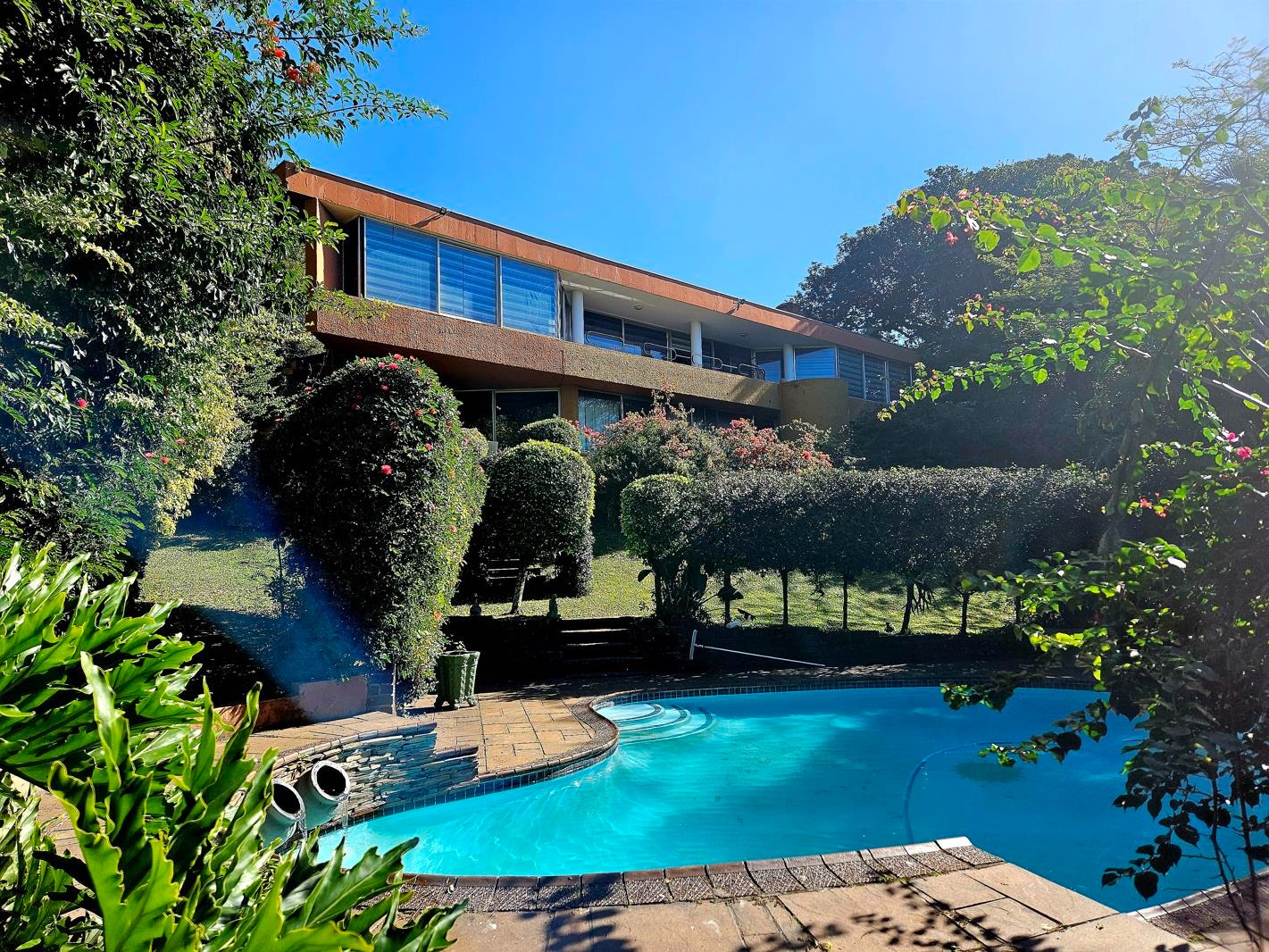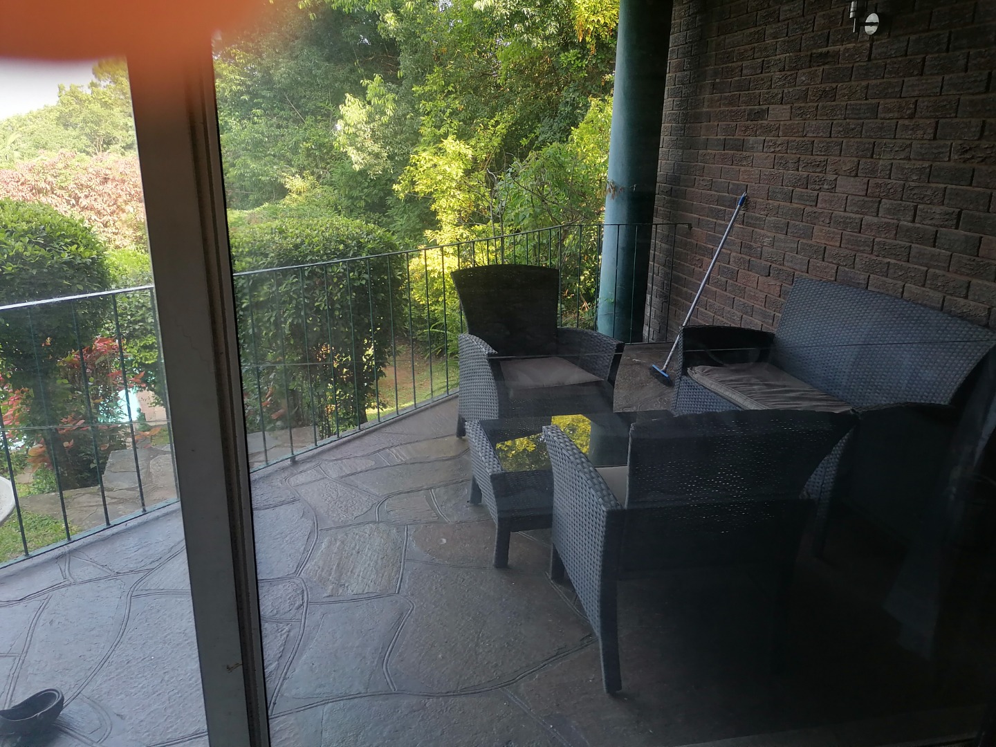 The house features huge windows with panoramic views off the balcony, overlooking the sparkling pool and garden.