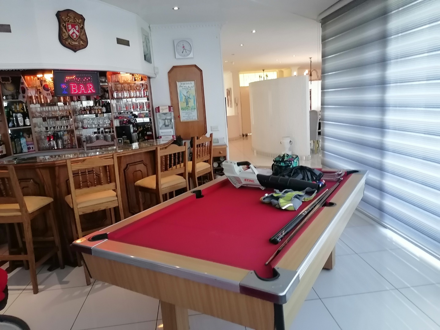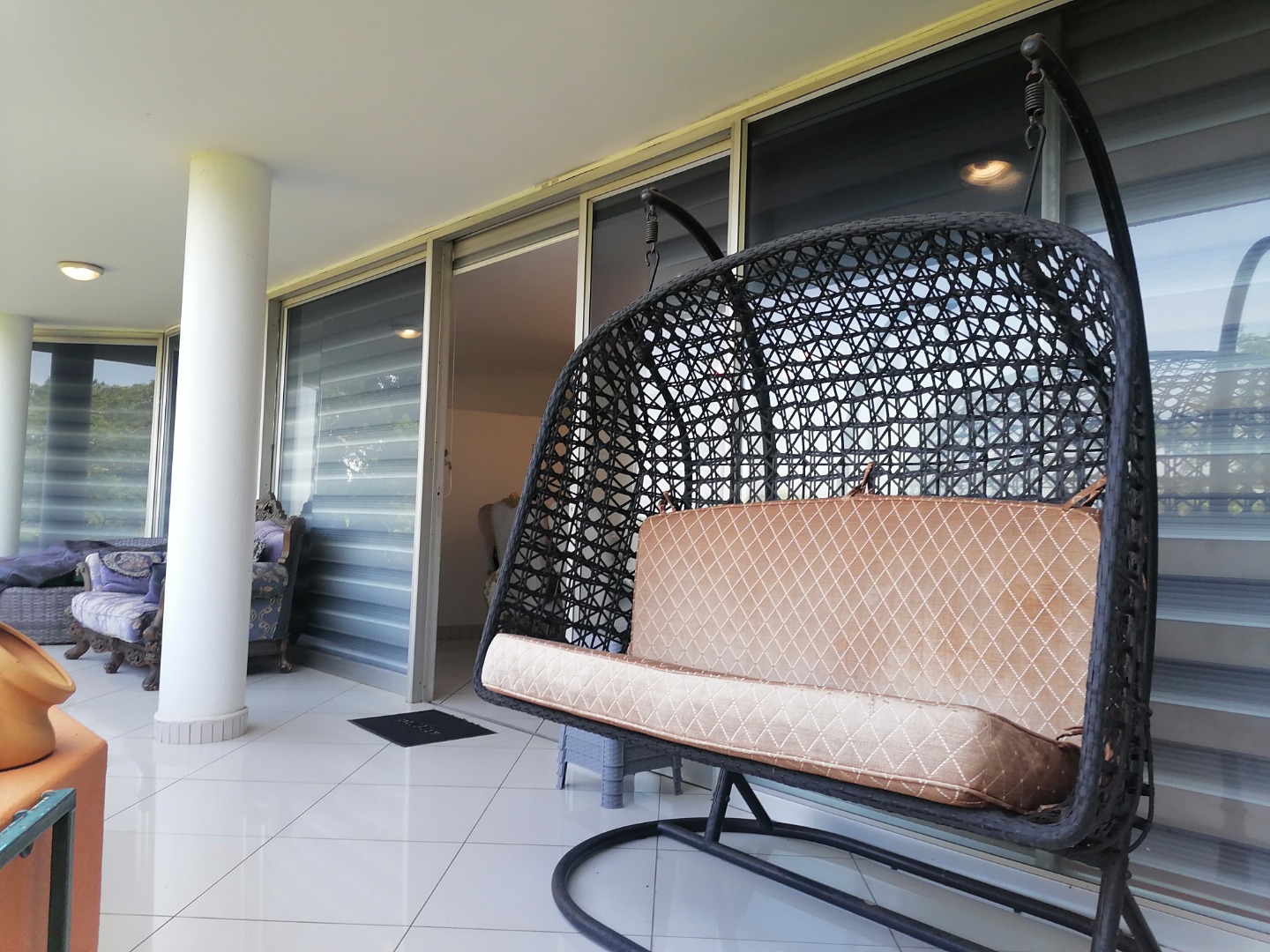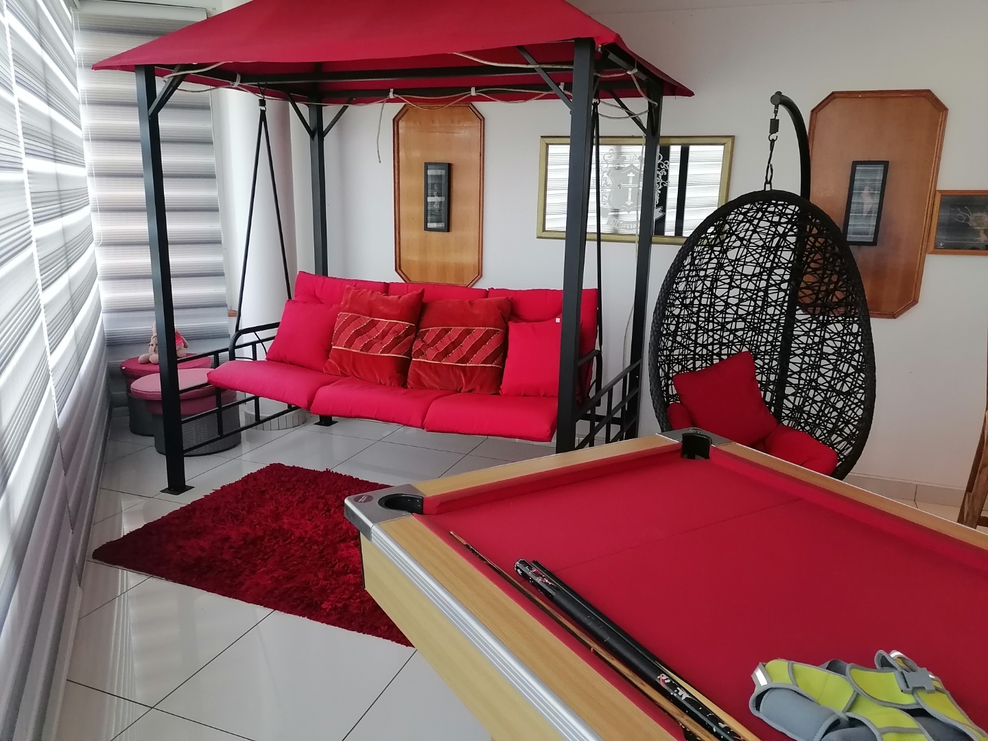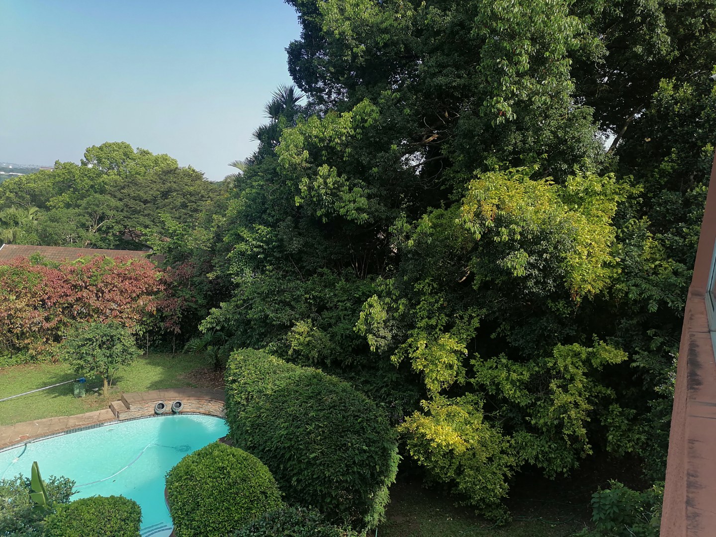 The house features huge windows with panoramic views off the balcony, overlooking the sparkling pool and garden.