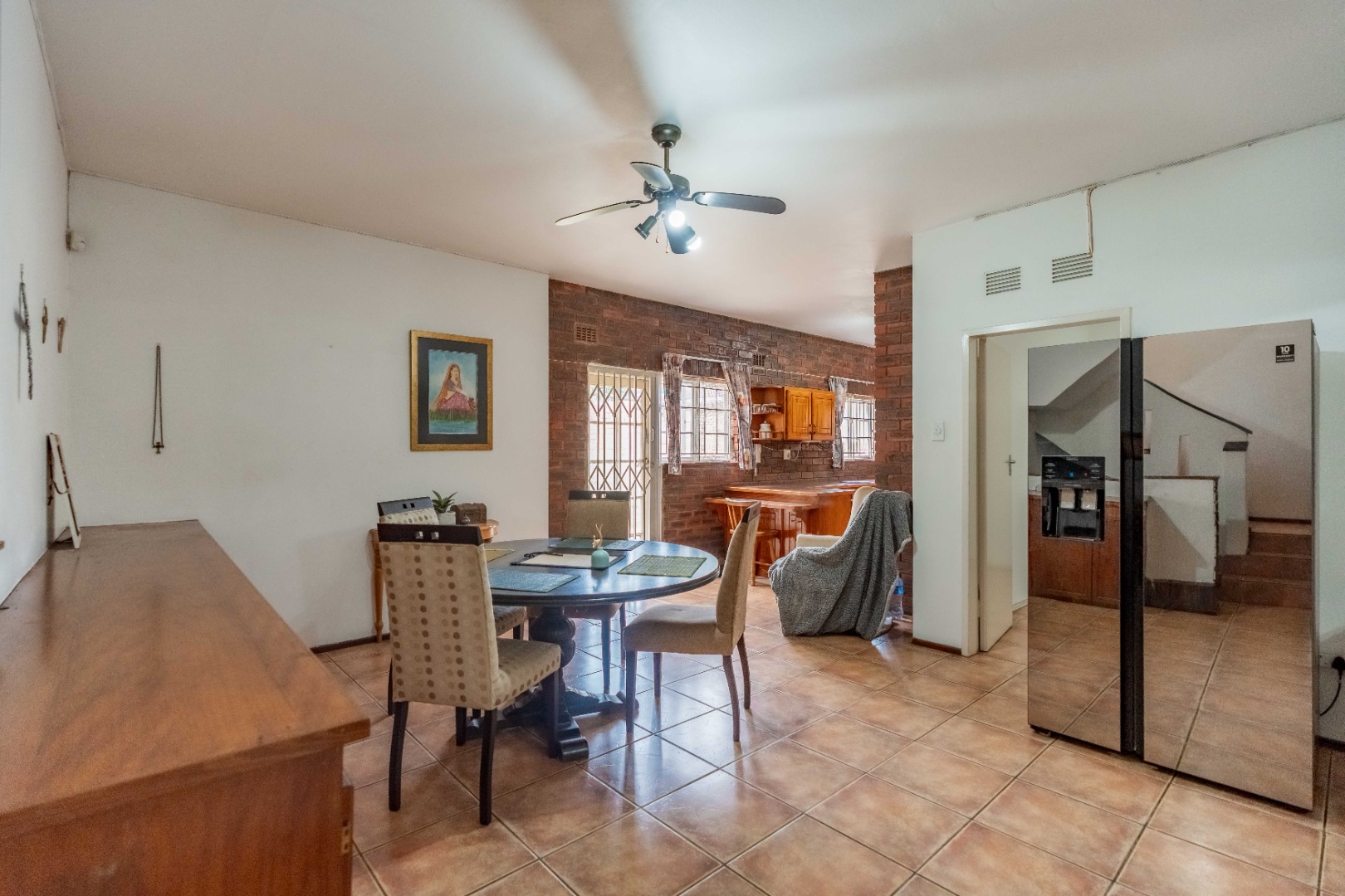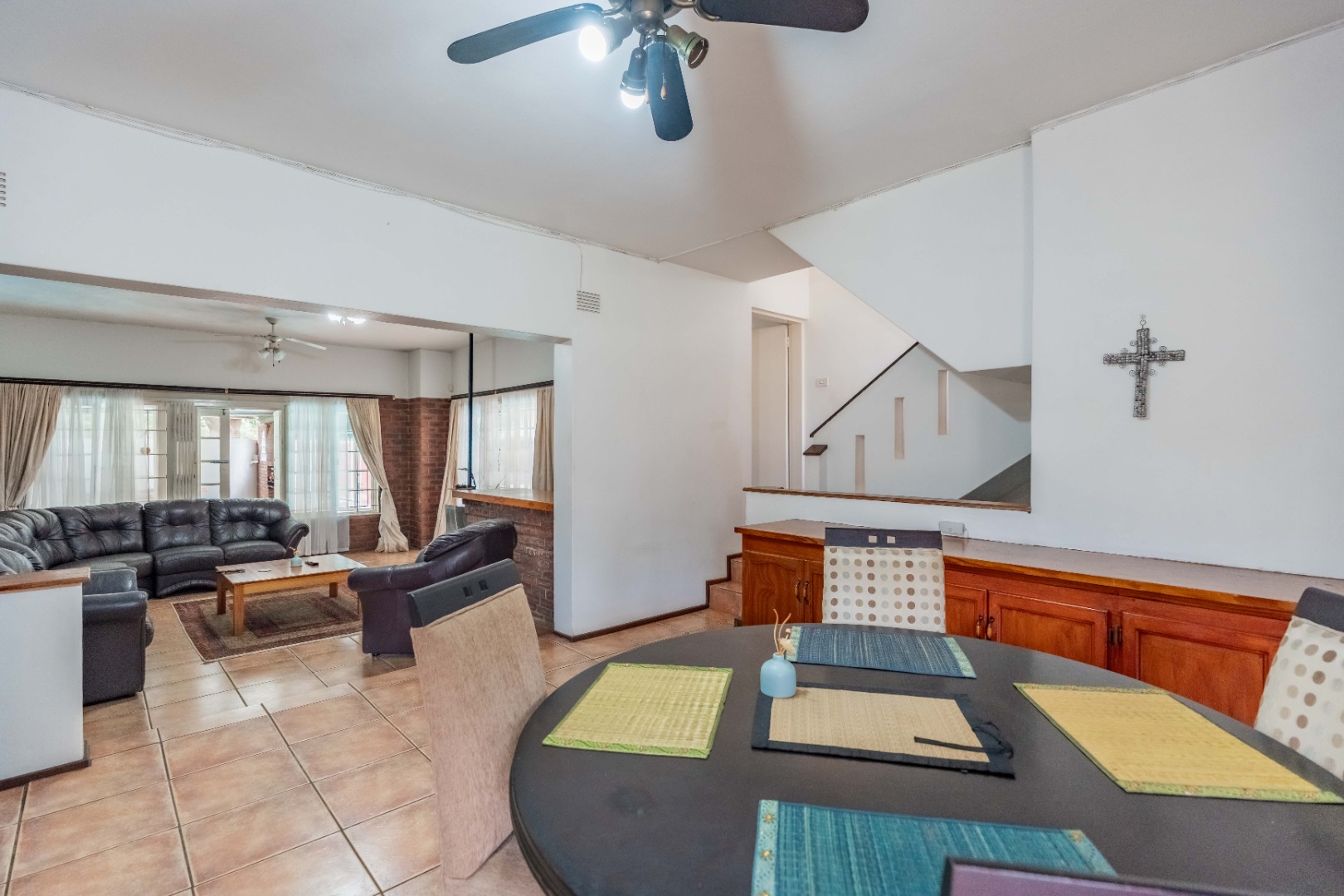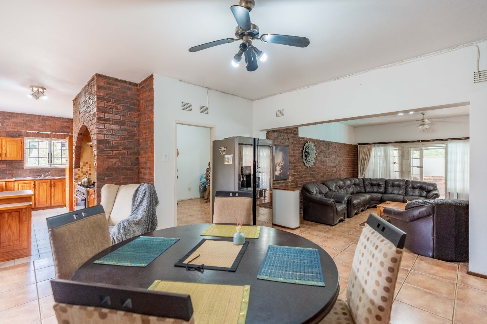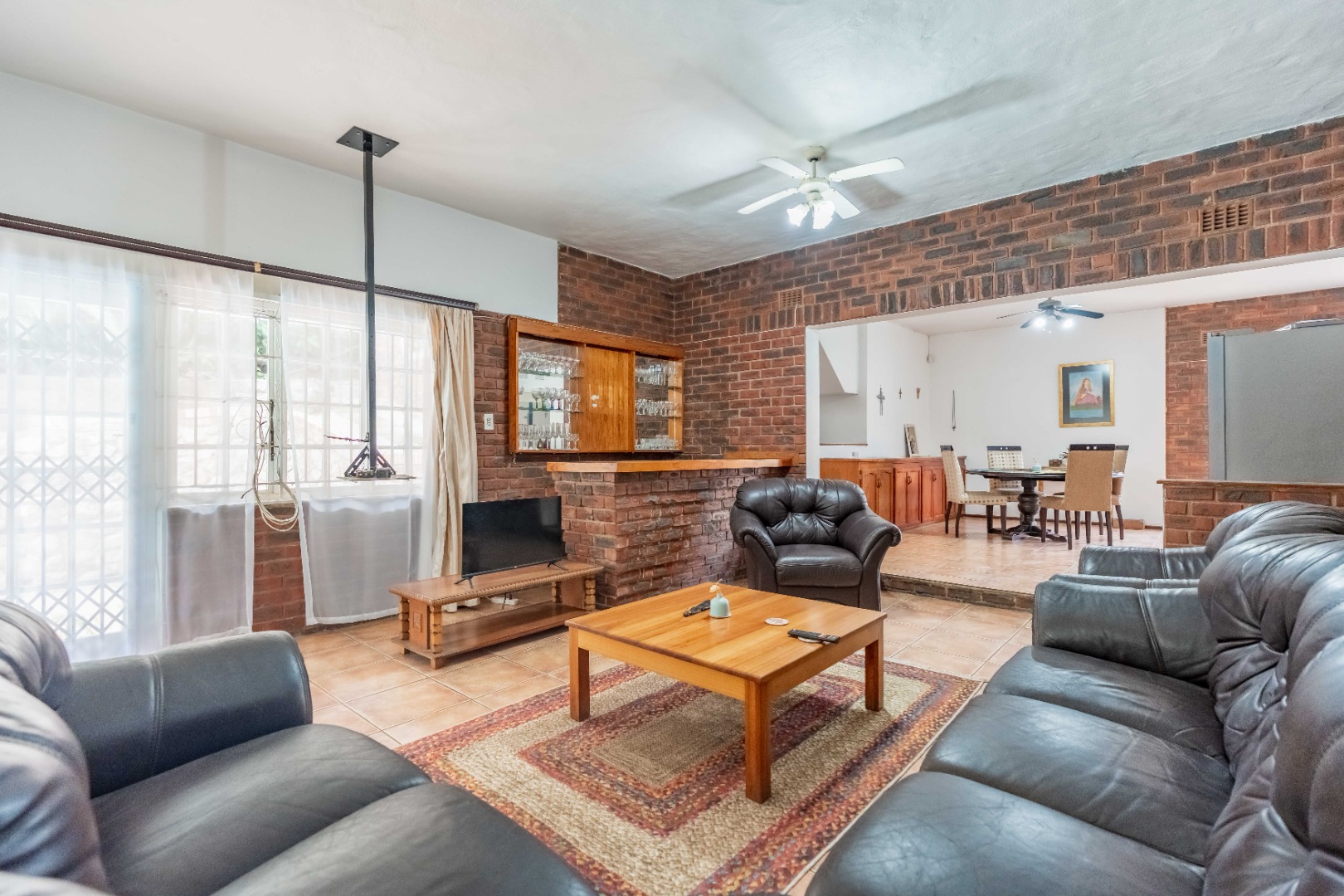 The open-plan dining room and kitchen form the heart of the home. The kitchen offers a gas hob, ample cupboard space, and a round-the-corner scullery that keeps the main kitchen neat and practical for everyday living. The main lounge, fully set up for DSTV, flows through sliding doors to the outdoor entertainment area. A spacious entertainment room or relaxed family area provides additional flexible living space for gatherings, movie nights, or a children’s retreat.