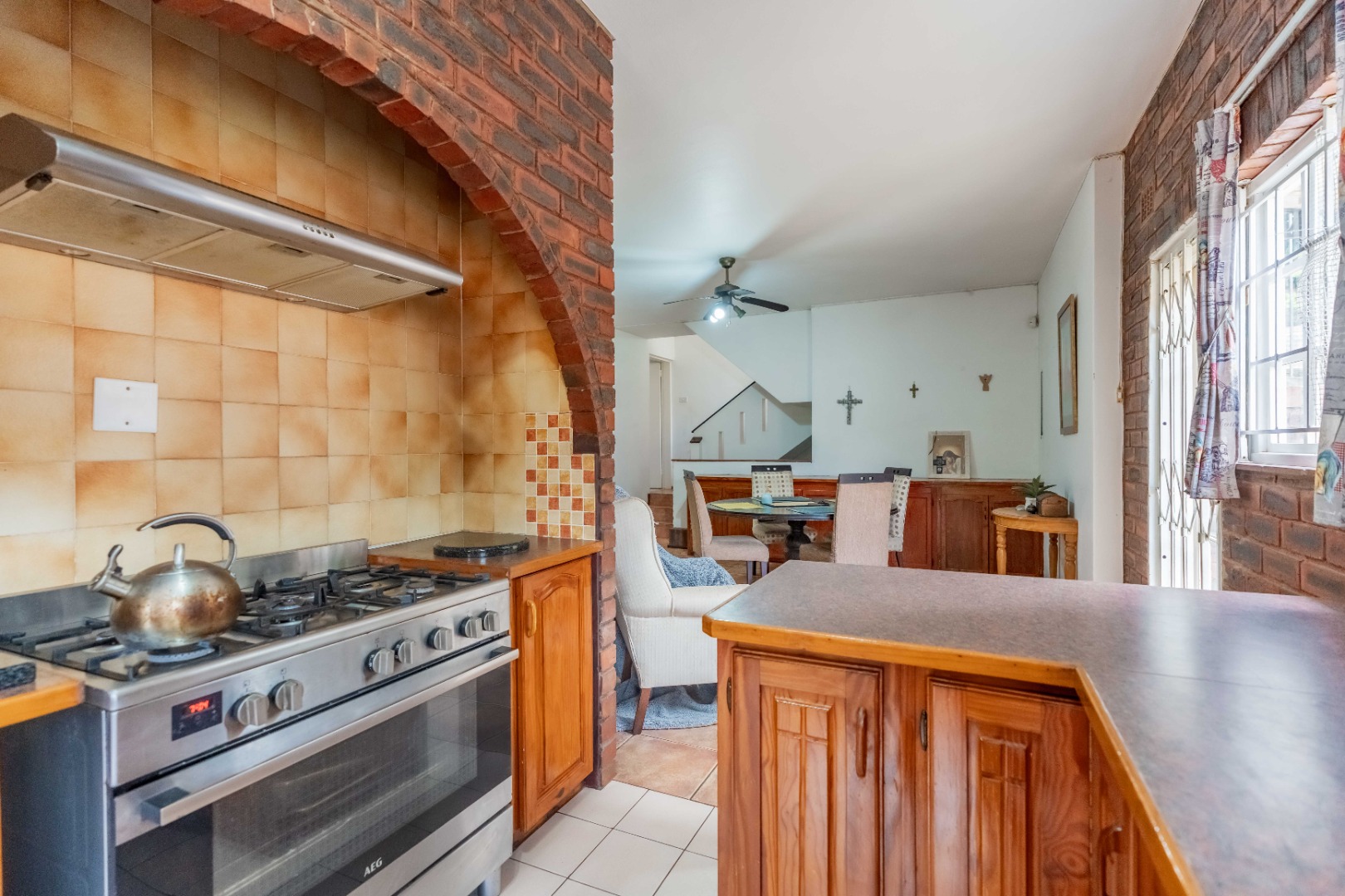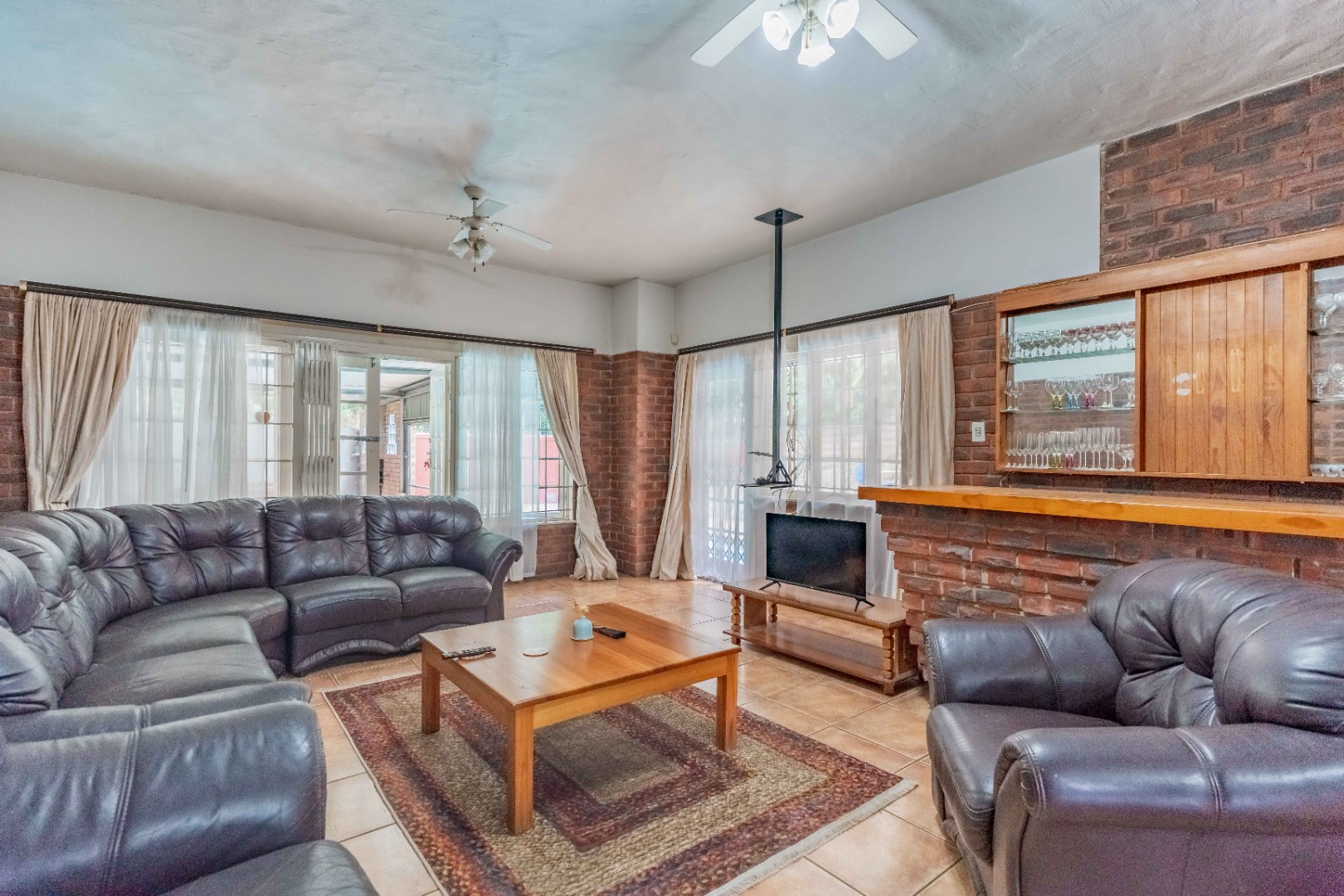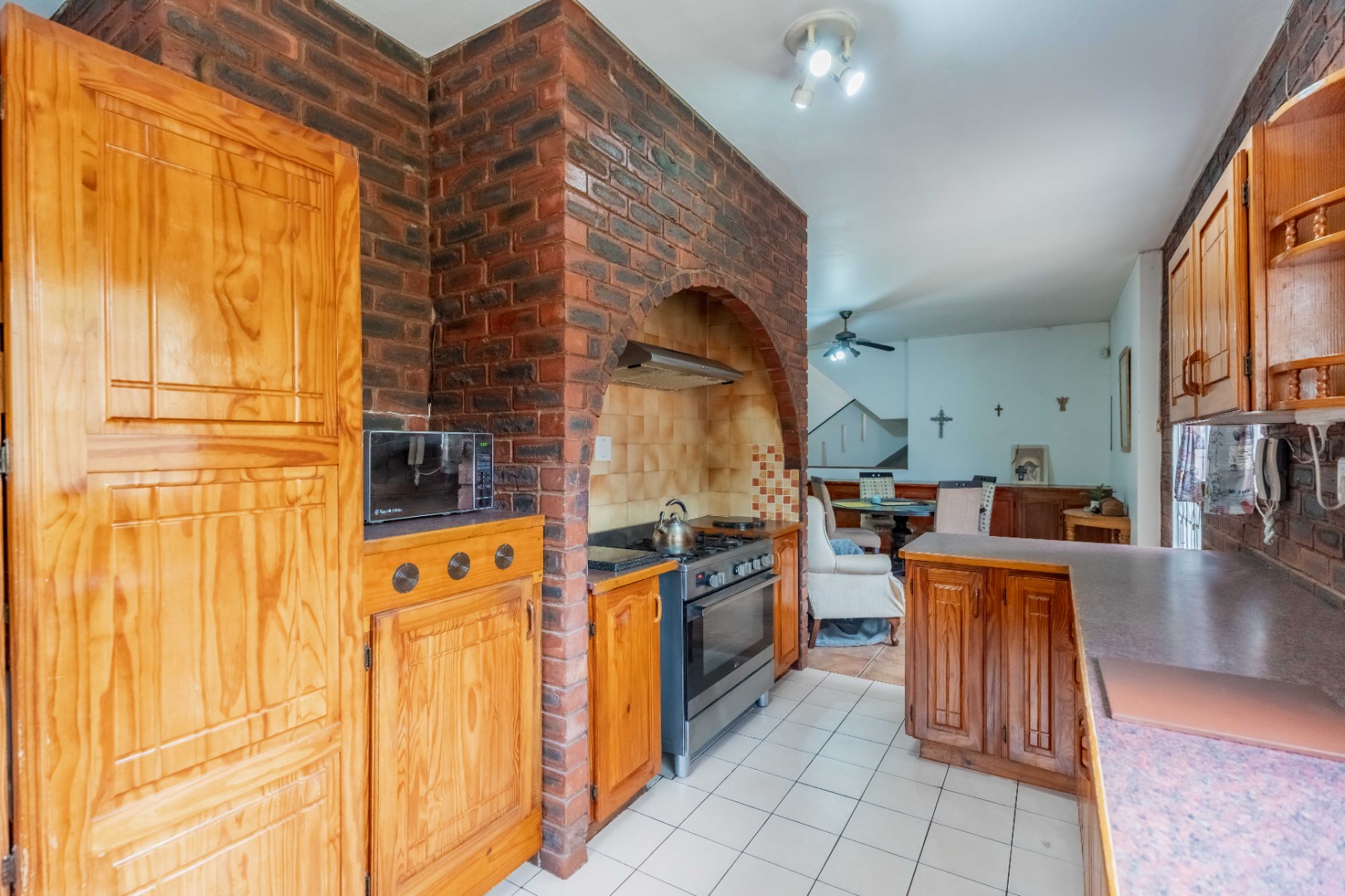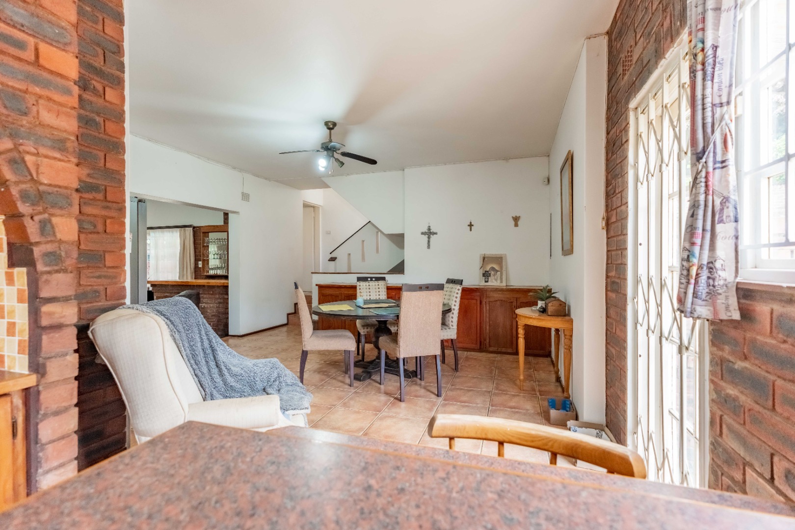 The open-plan dining room and kitchen form the heart of the home. The kitchen offers a gas hob, ample cupboard space, and a round-the-corner scullery that keeps the main kitchen neat and practical for everyday living. The main lounge, fully set up for DSTV, flows through sliding doors to the outdoor entertainment area. A spacious entertainment room or relaxed family area provides additional flexible living space for gatherings, movie nights, or a children’s retreat.