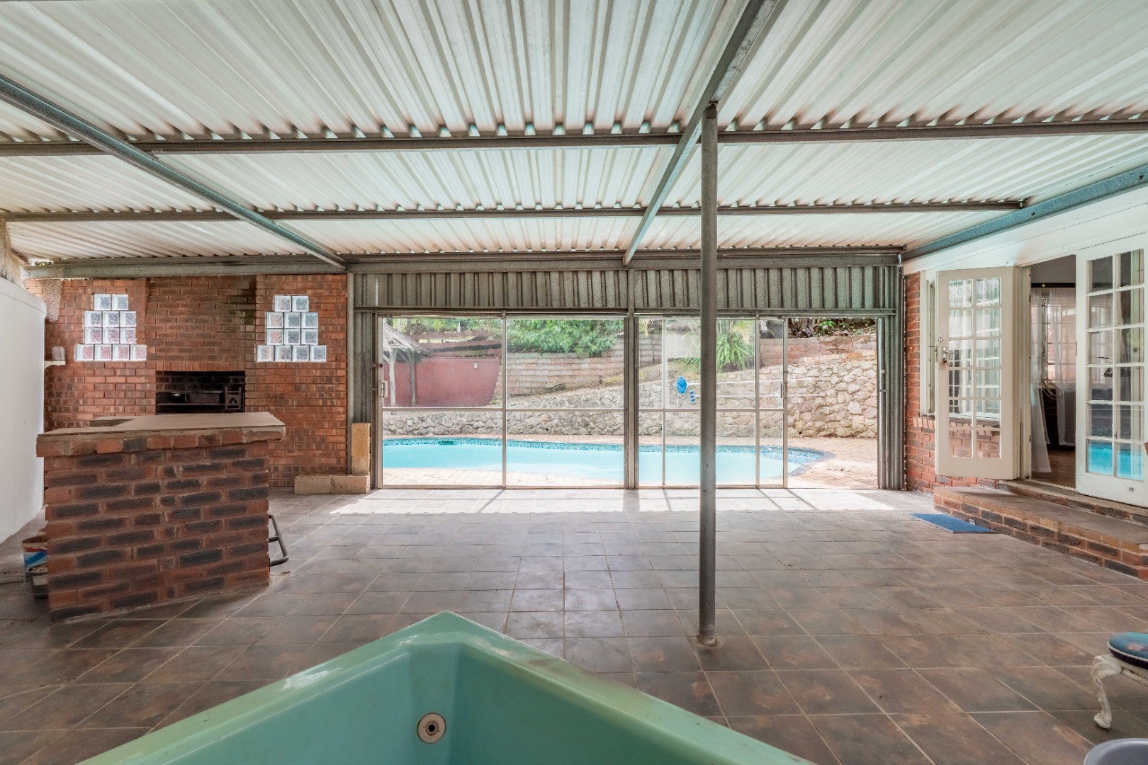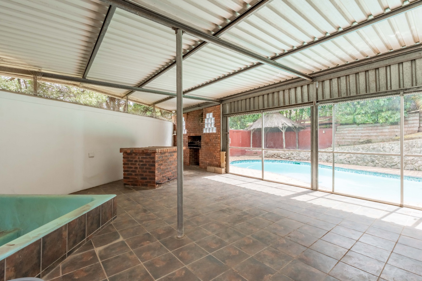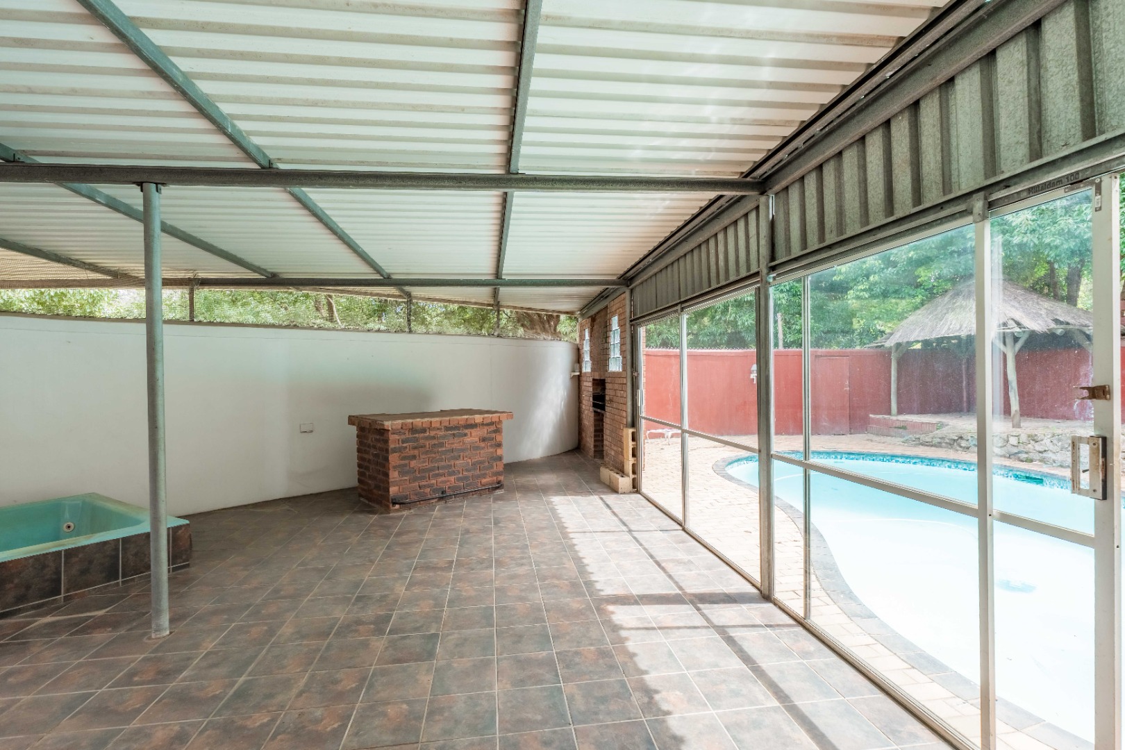 Outside, the home truly comes to life with a lovely entertainment area featuring an enclosed patio with built-in braai, overlooking the sparkling swimming pool and jacuzzi—perfect for relaxed weekends and entertaining friends and family.