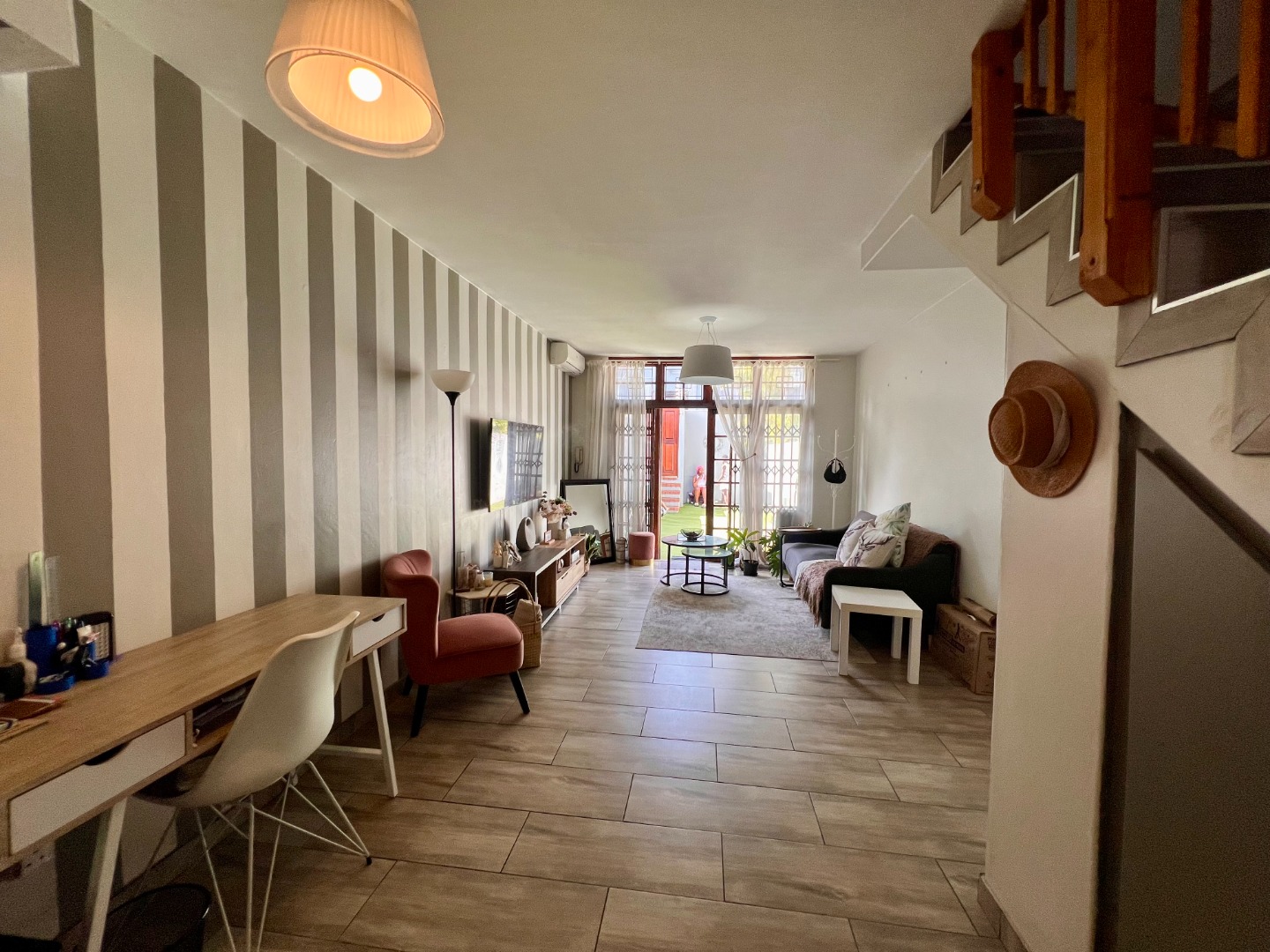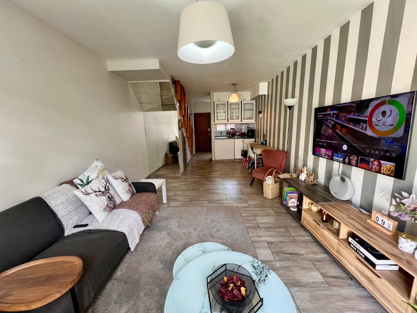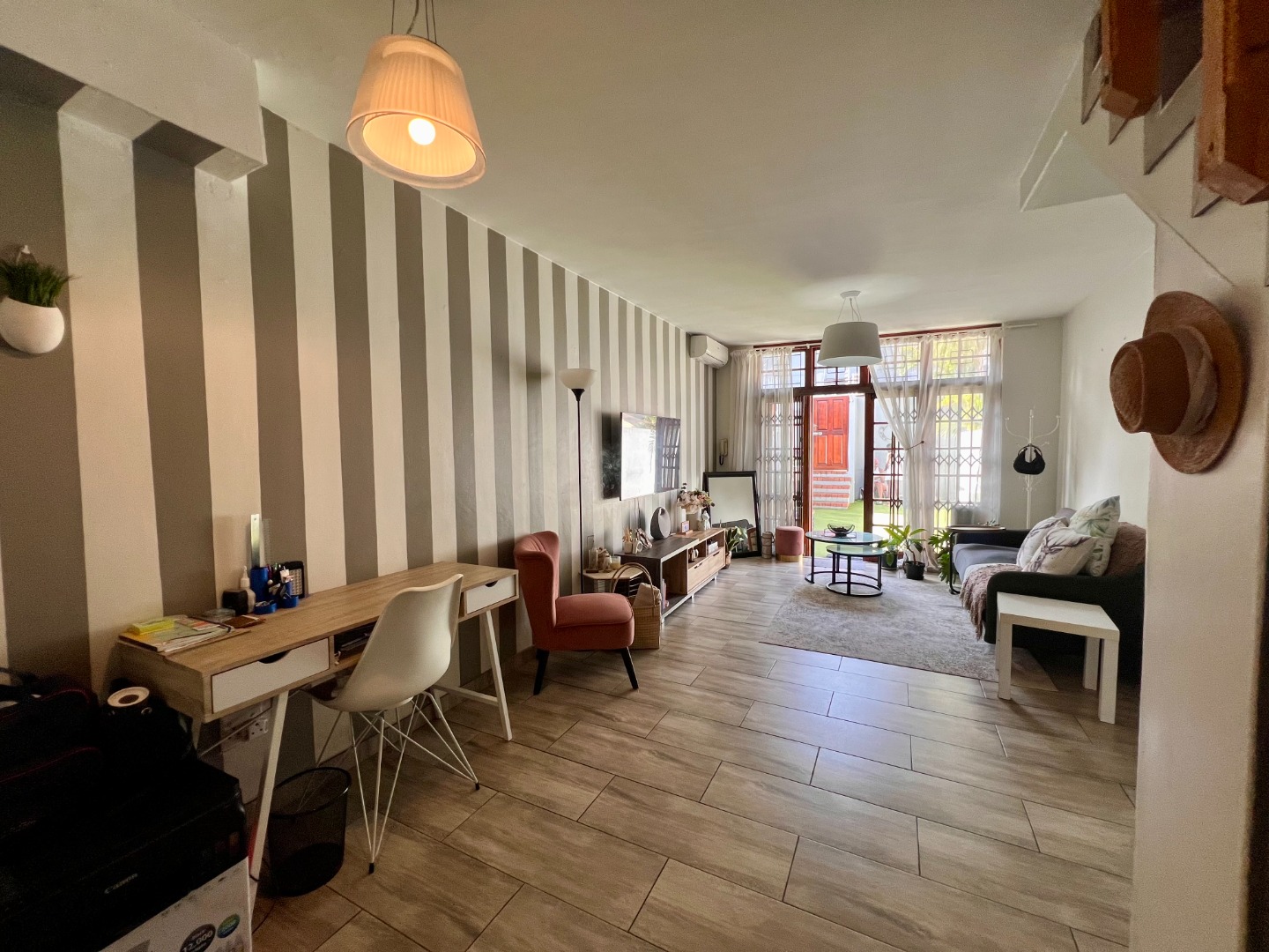 Step inside to an inviting open-plan living area, featuring stylish wood-look tiled flooring throughout and a distinctive striped accent wall that adds character. The space is bathed in natural light from large windows and a glass door, which also provides access to an outdoor area. The compact yet functional seamlessly integrates with the living space.