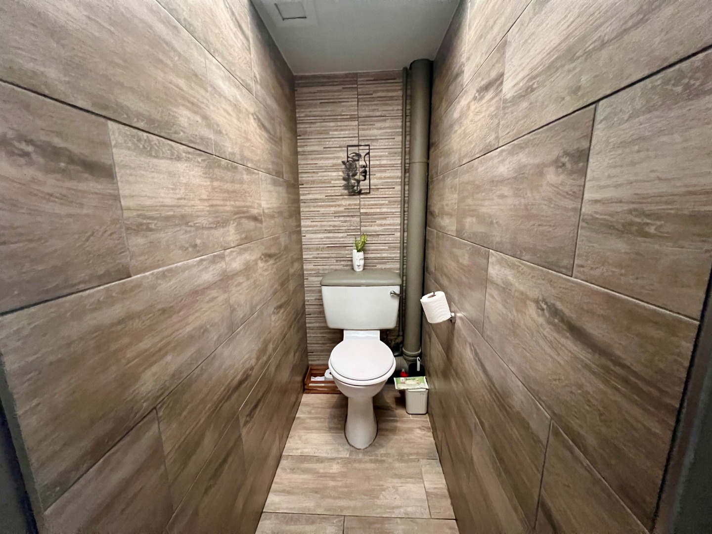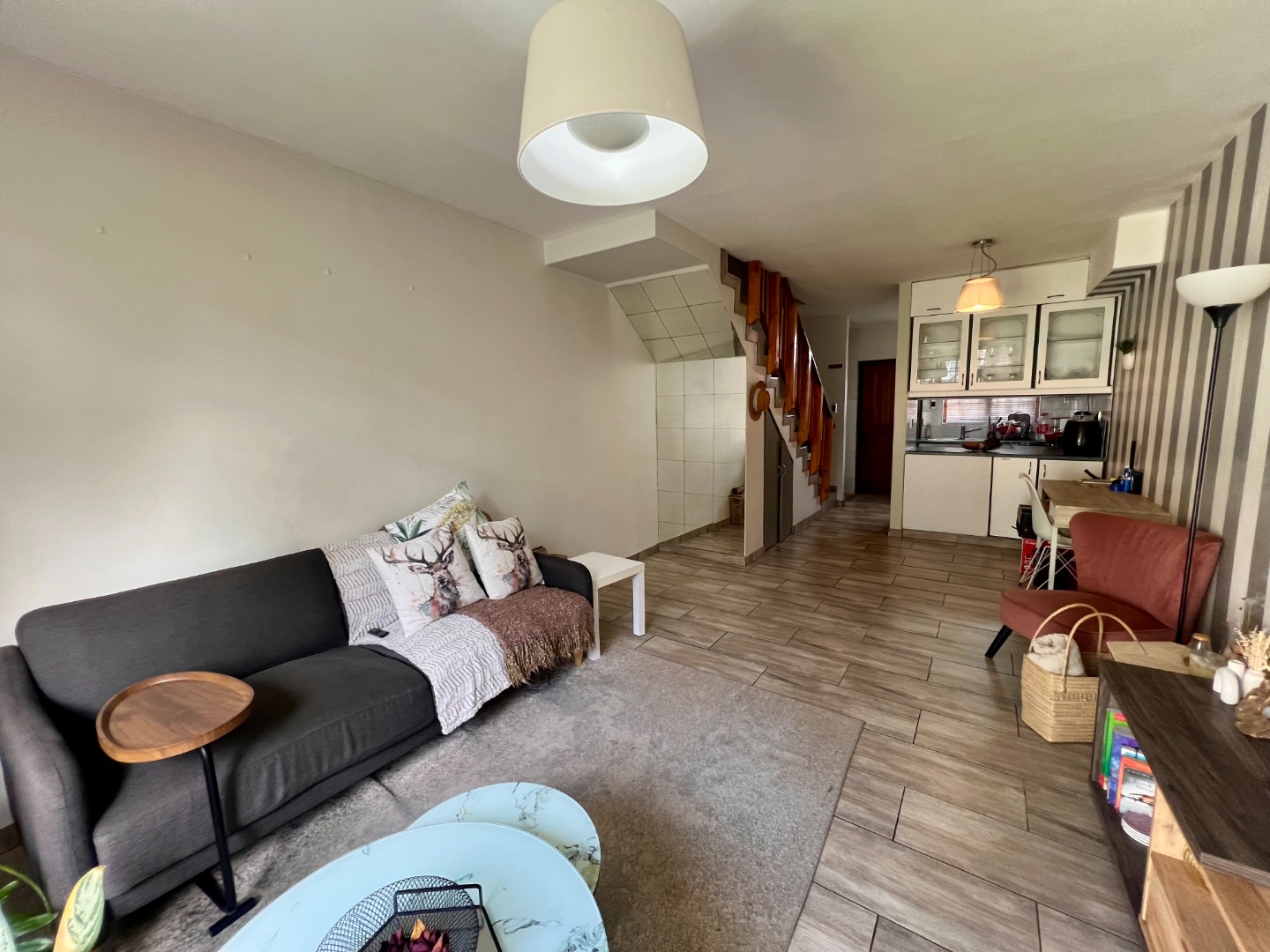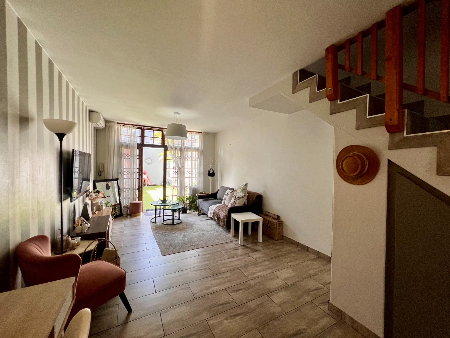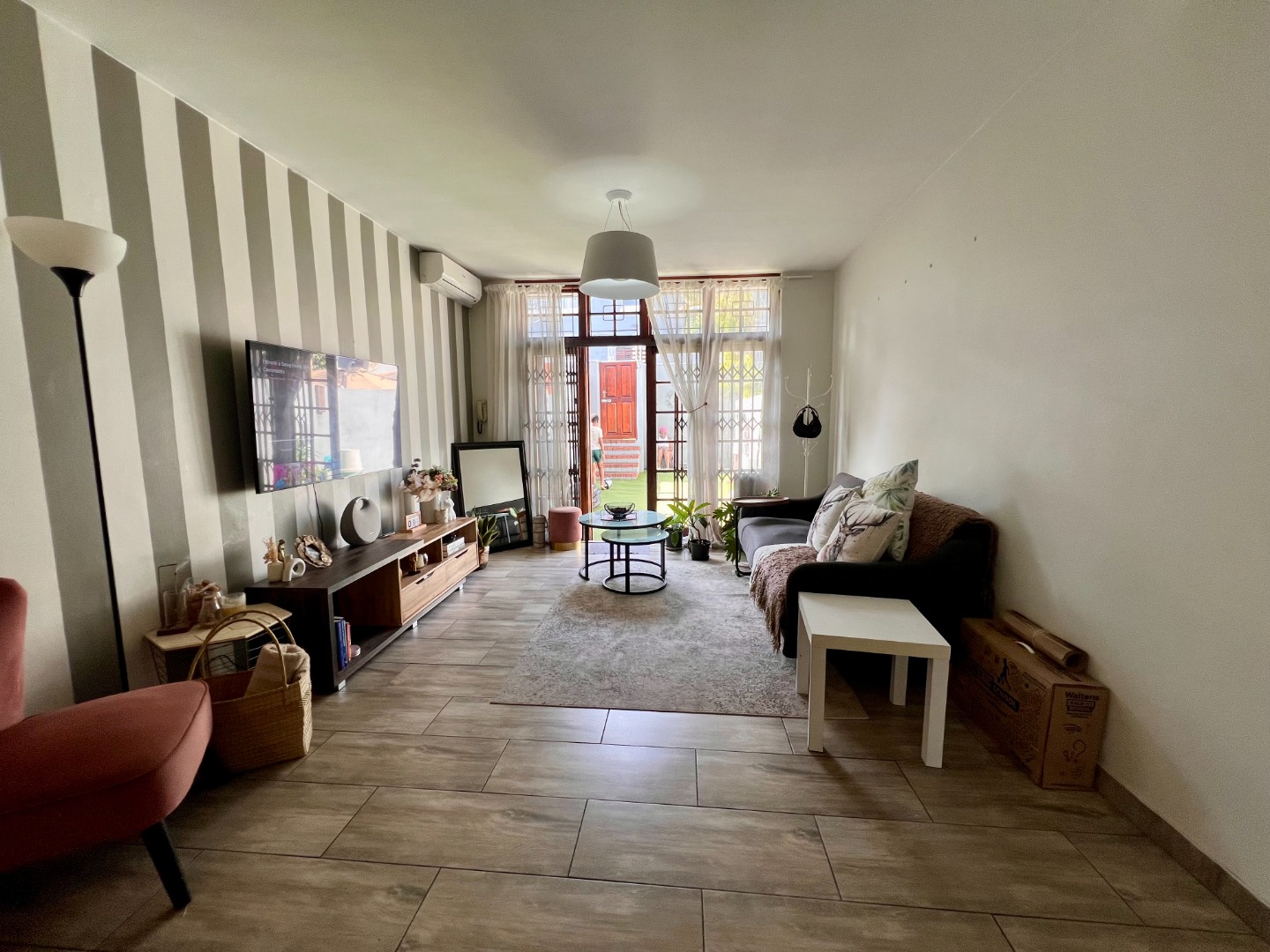 Step inside to an inviting open-plan living area, featuring stylish wood-look tiled flooring throughout and a distinctive striped accent wall that adds character. The space is bathed in natural light from large windows and a glass door, which also provides access to an outdoor area. The compact yet functional seamlessly integrates with the living space.