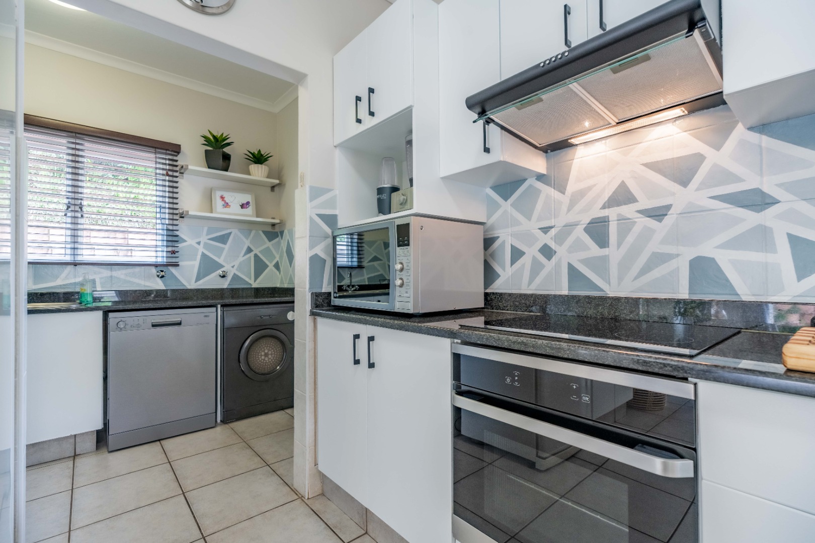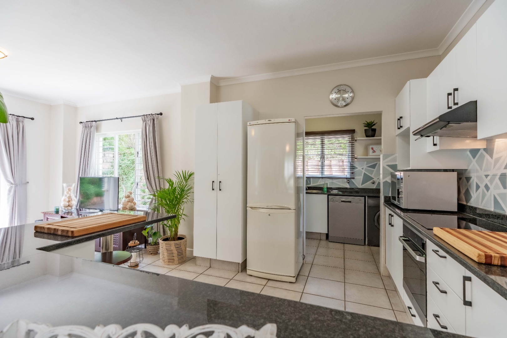 This unit offers seamless open-plan living and entertaining. The lower level features a generous living space that flows beautifully to your private, established garden and splash pool. The sleek, contemporary kitchen includes a separate scullery, keeping your main area tidy and ready for guests. A very convenient guest loo under the stairs completes the downstairs amenities.
