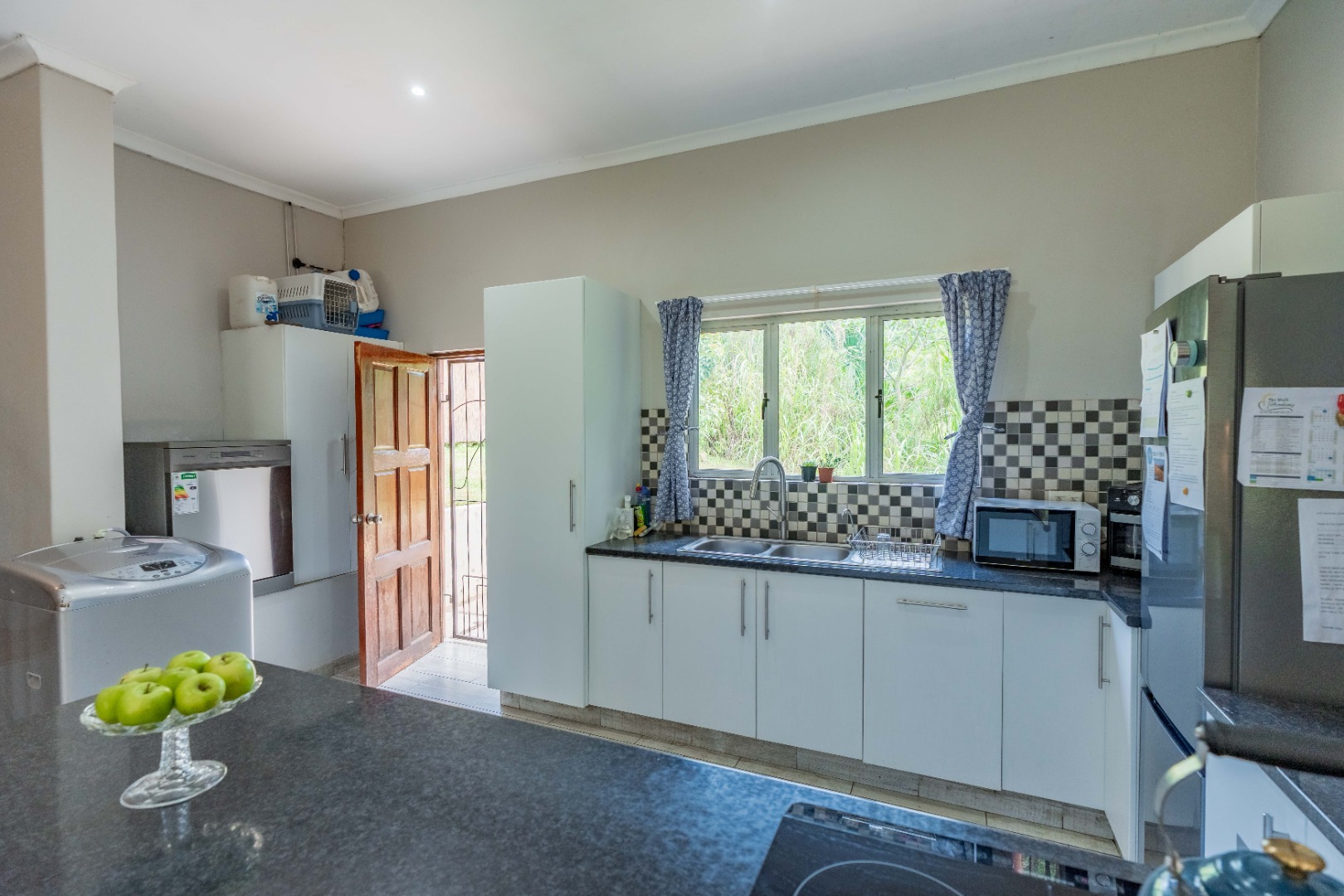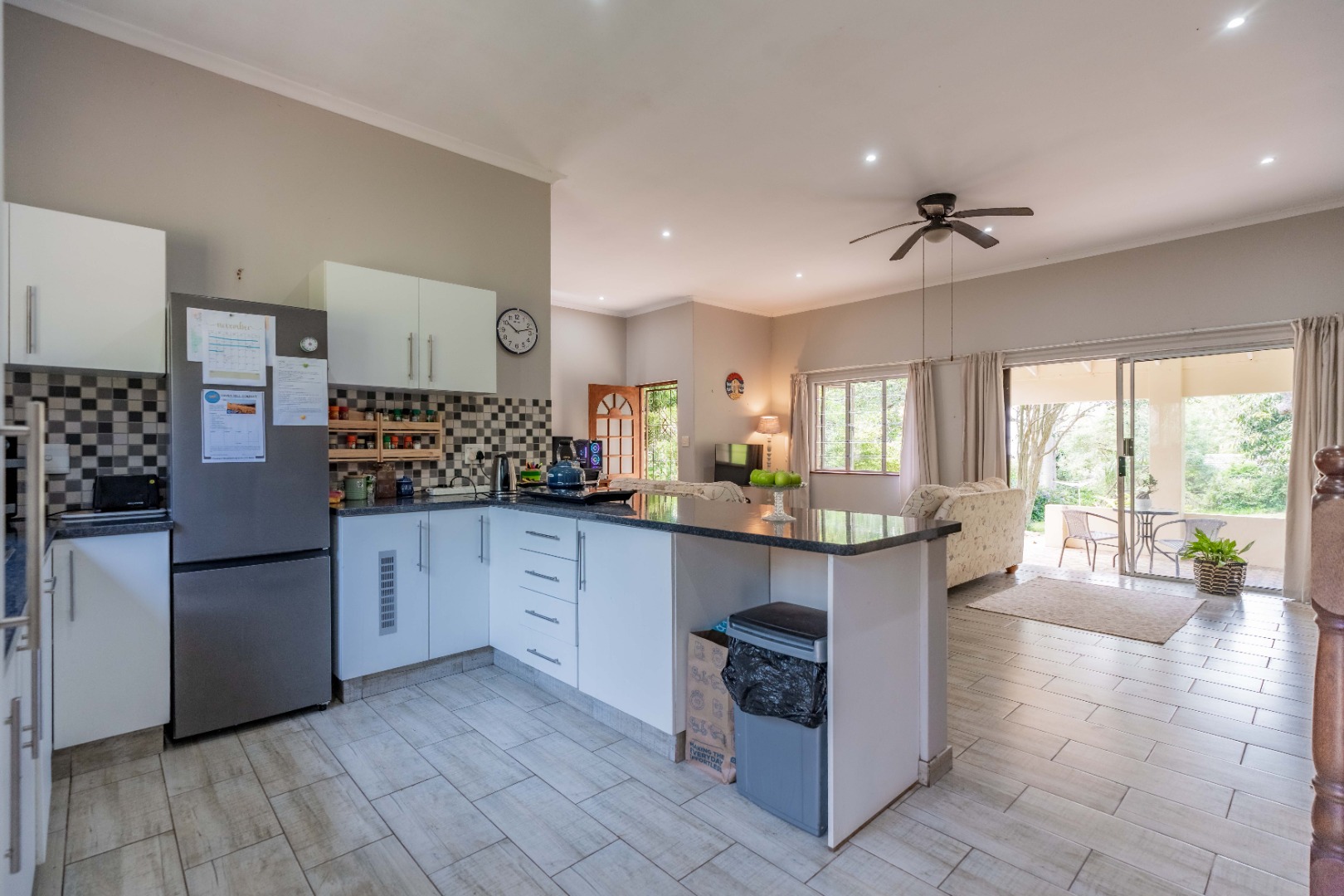 The kitchen connects directly to the living area and is fitted with granite countertops and ample storage space.