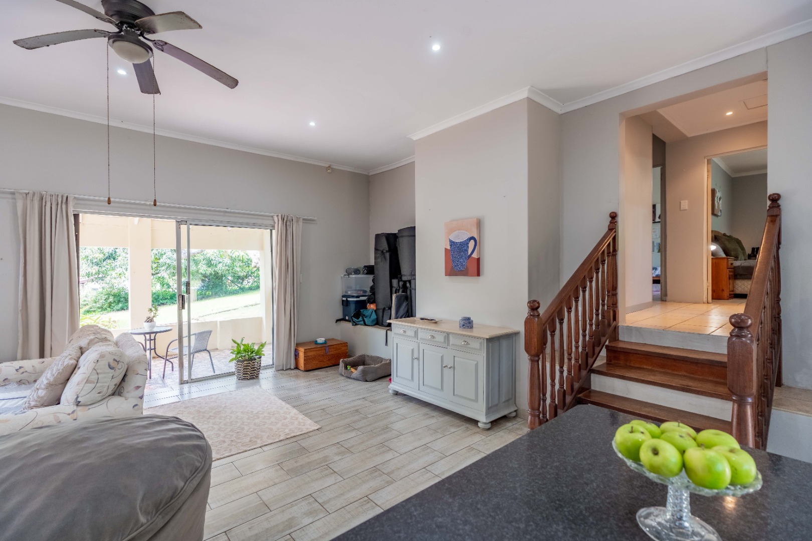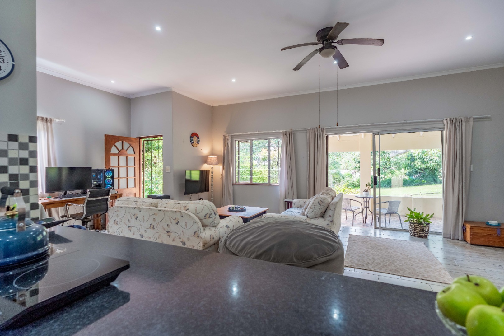 The main living space features a double-volume open-plan lounge and dining room. This design provides maximum natural light and airflow, creating a comfortable, airy feel.