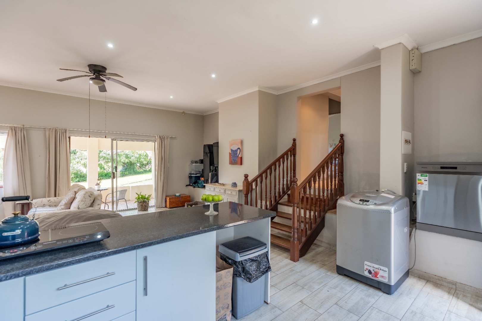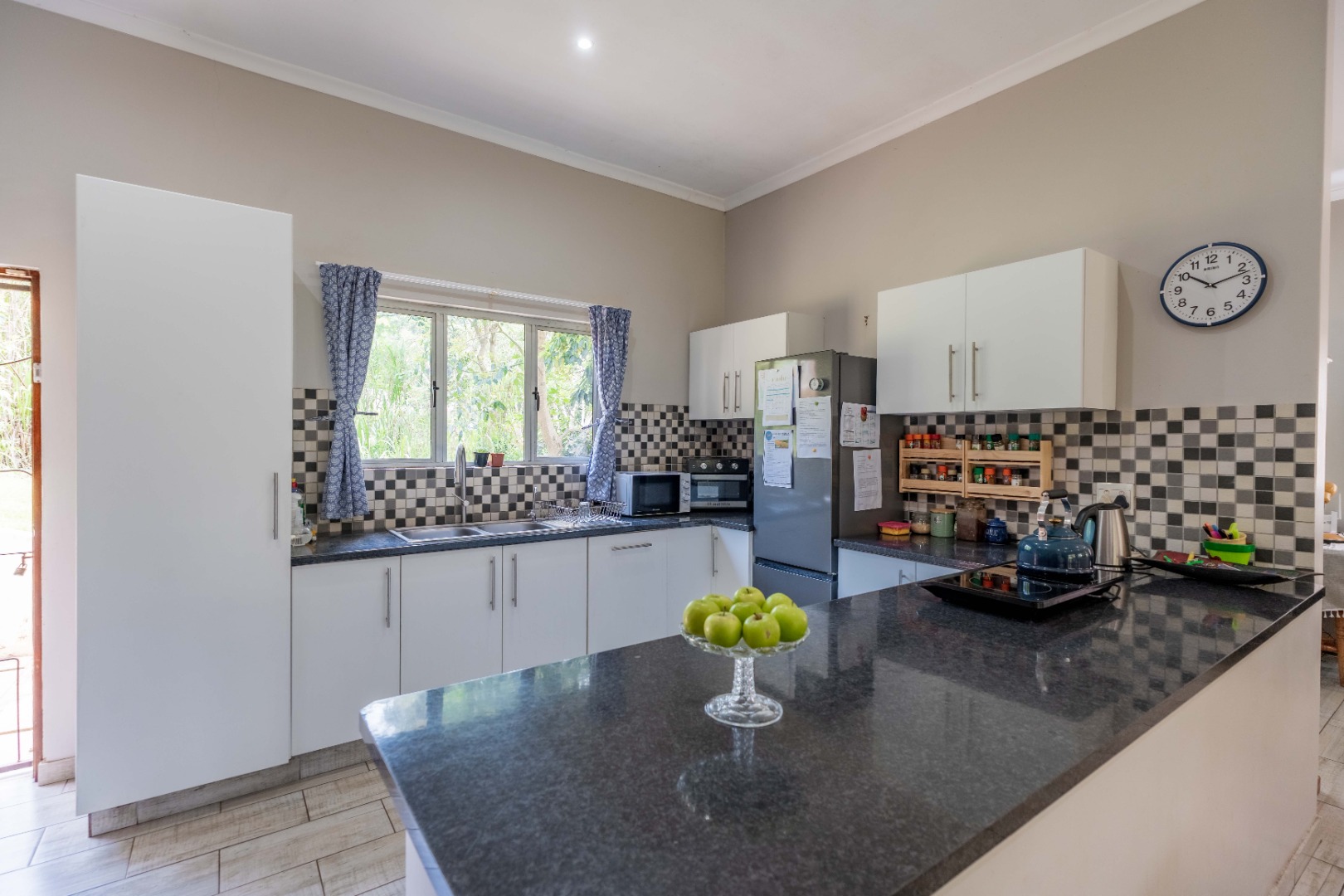 The kitchen connects directly to the living area and is fitted with granite countertops and ample storage space.