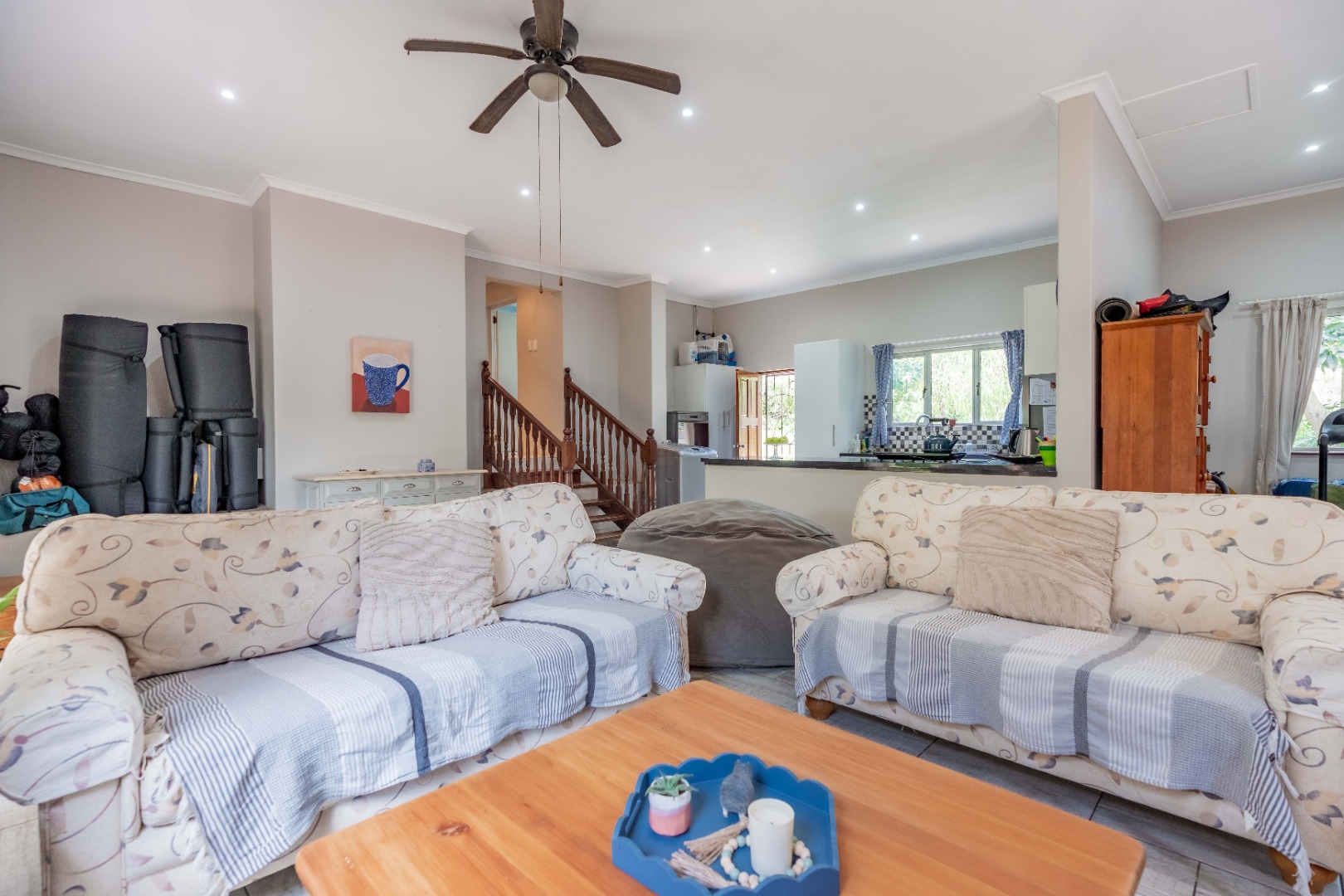 The main living space features a double-volume open-plan lounge and dining room. This design provides maximum natural light and airflow, creating a comfortable, airy feel.