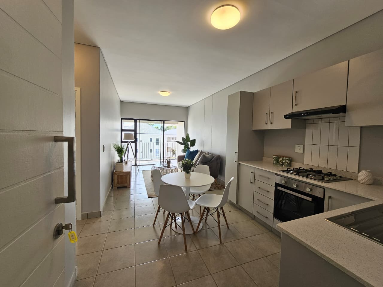 The apartment offers a modern open-plan kitchen fitted with a gas stove, undercounter oven, and plumbing for either a washing machine or dishwasher. The spacious lounge flows seamlessly onto a private balcony — perfect for relaxing or entertaining.