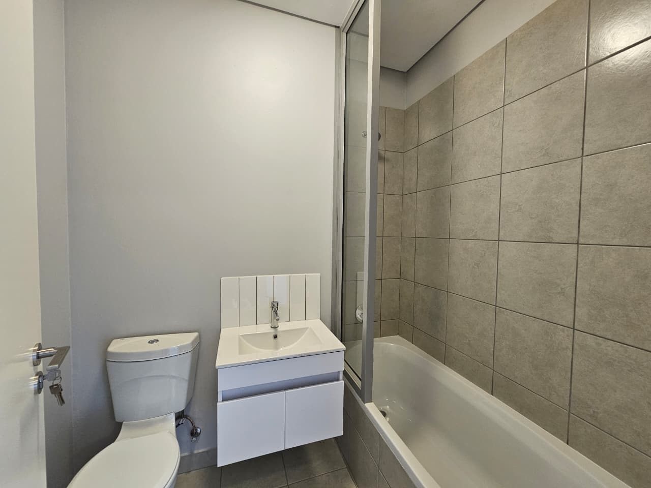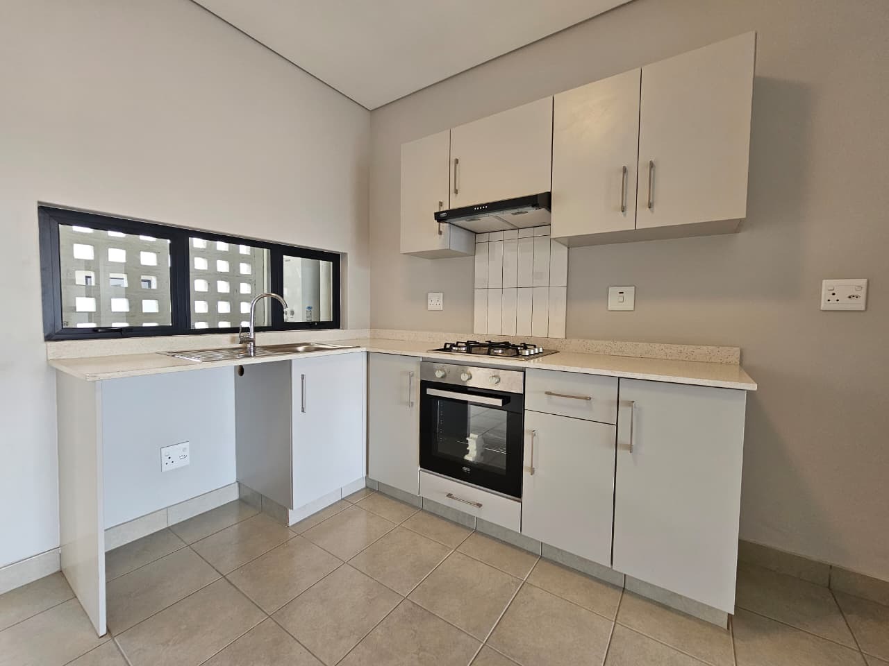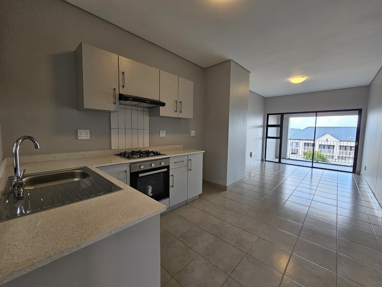 The apartment offers a modern open-plan kitchen fitted with a gas stove, undercounter oven, and plumbing for either a washing machine or dishwasher. The spacious lounge flows seamlessly onto a private balcony — perfect for relaxing or entertaining.
