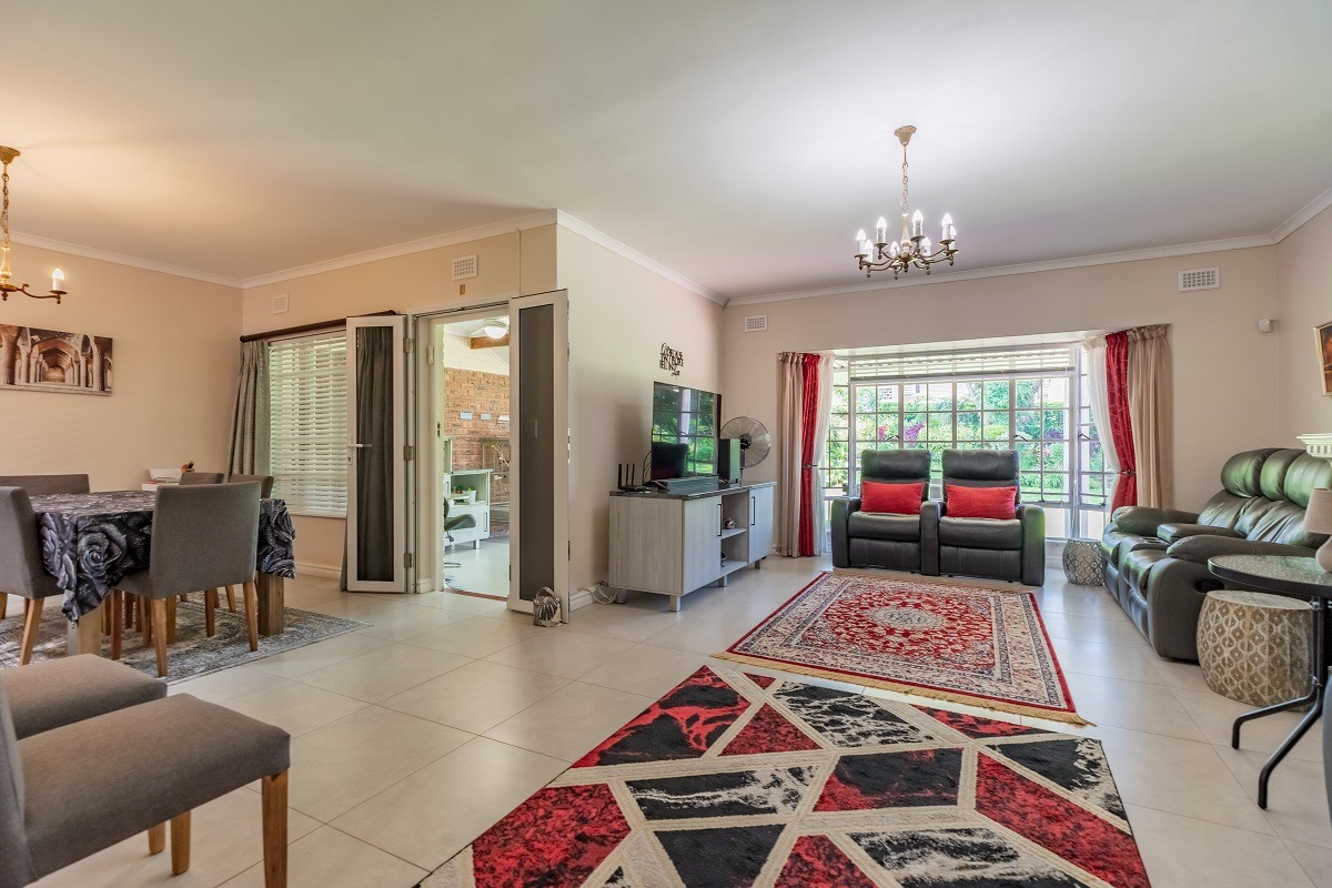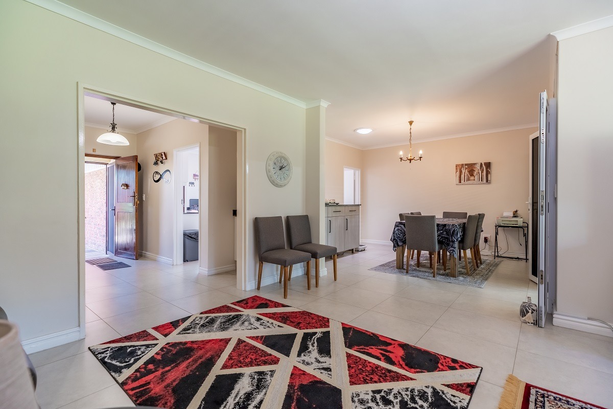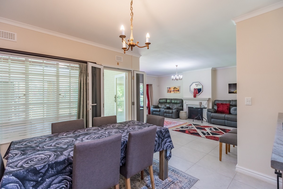 Step through the entrance hall into an open-plan lounge and dining room, seamlessly connected to an enclosed patio. With sliding doors that open to a front paved, covered patio area, you'll enjoy beautiful views of the manicured front garden - a perfect setting for entertaining guests or relaxing with evening sundowners.