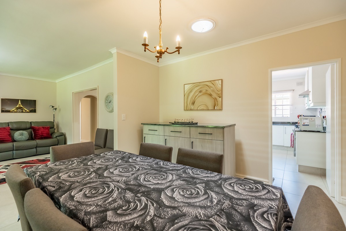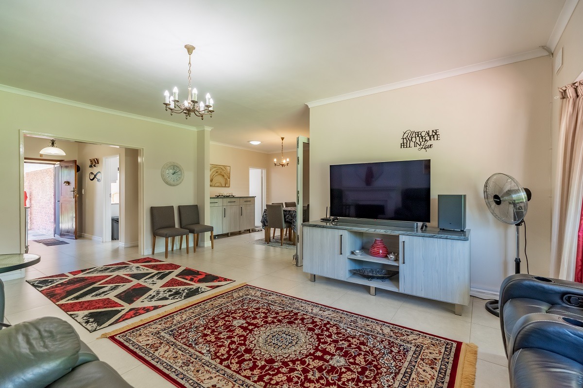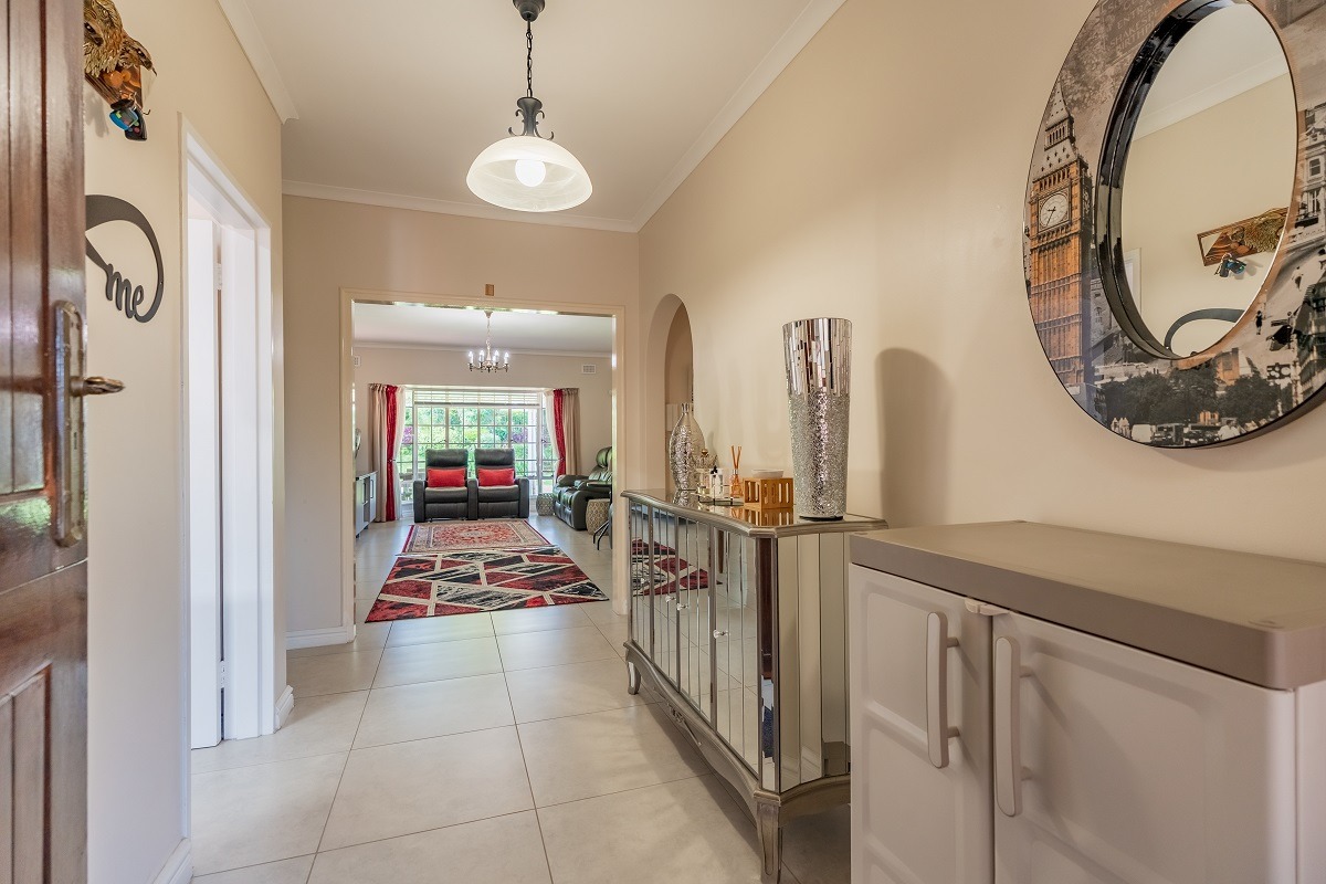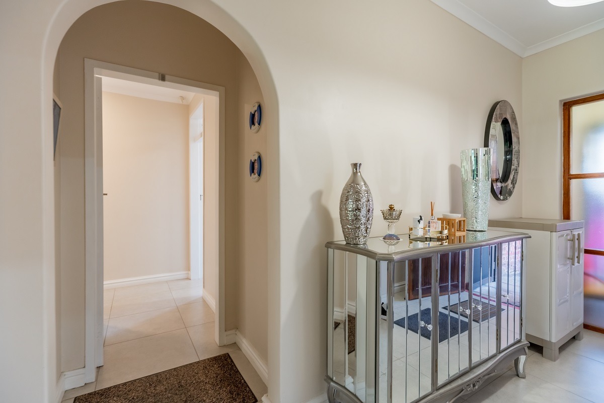 Step through the entrance hall into an open-plan lounge and dining room, seamlessly connected to an enclosed patio. With sliding doors that open to a front paved, covered patio area, you'll enjoy beautiful views of the manicured front garden - a perfect setting for entertaining guests or relaxing with evening sundowners.