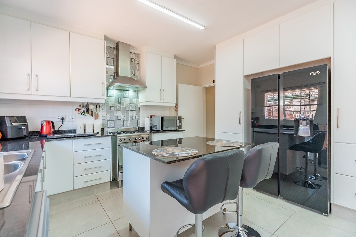 The large kitchen is a culinary enthusiast's dream, featuring ample cupboard space and a centre island. Equipped with a Smeg gas stove and an instant water heater, it also has space for a double-door fridge.
