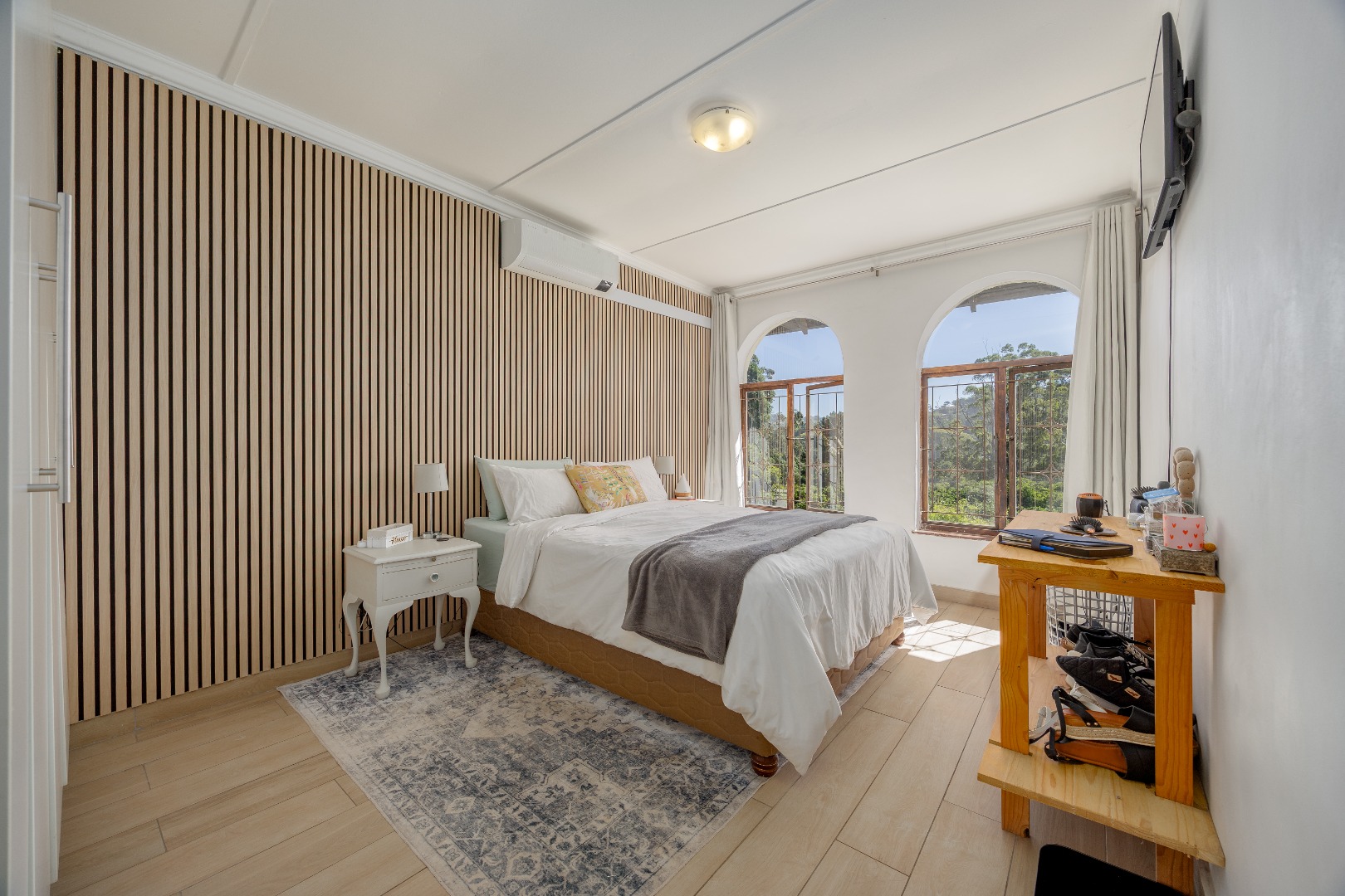 Upstairs, the home transitions into a peaceful retreat. The master suite is a true sanctuary, featuring integrated acoustic sound-blocking insulation for total tranquility. Wake up to elevated views of lush Hillcrest through elegant arched windows that lend a sophisticated Mediterranean feel to the space. The additional two bedrooms are bright and airy, ideal for a growing family or a quiet home office perfectly separated from the downstairs living areas.