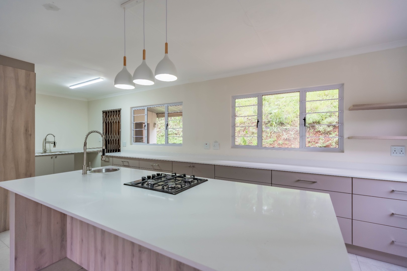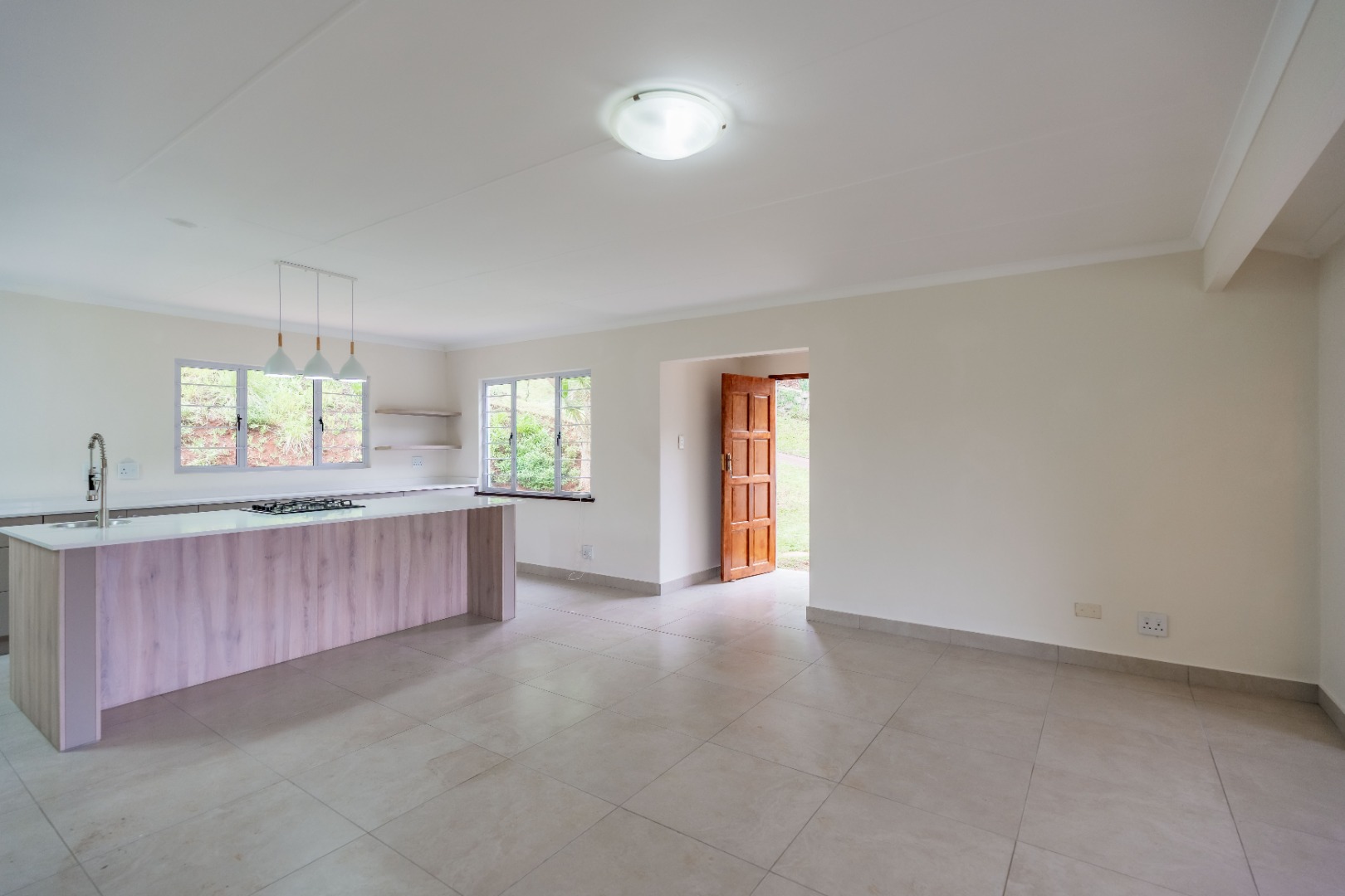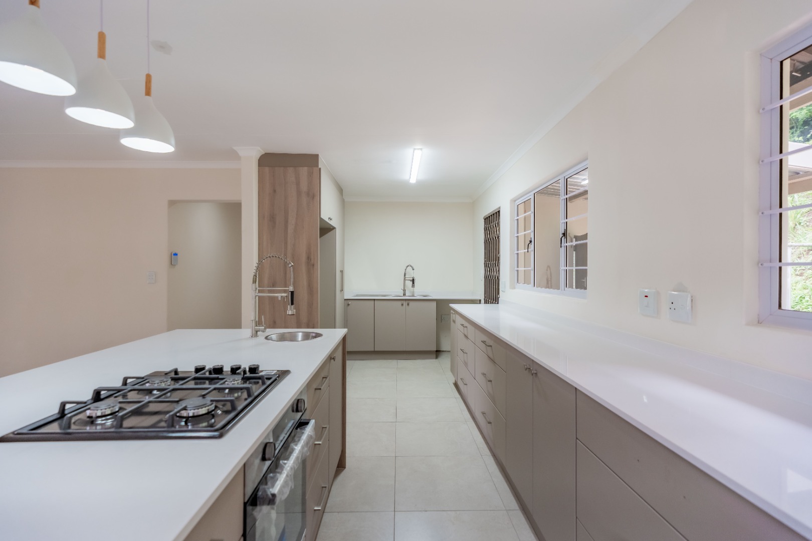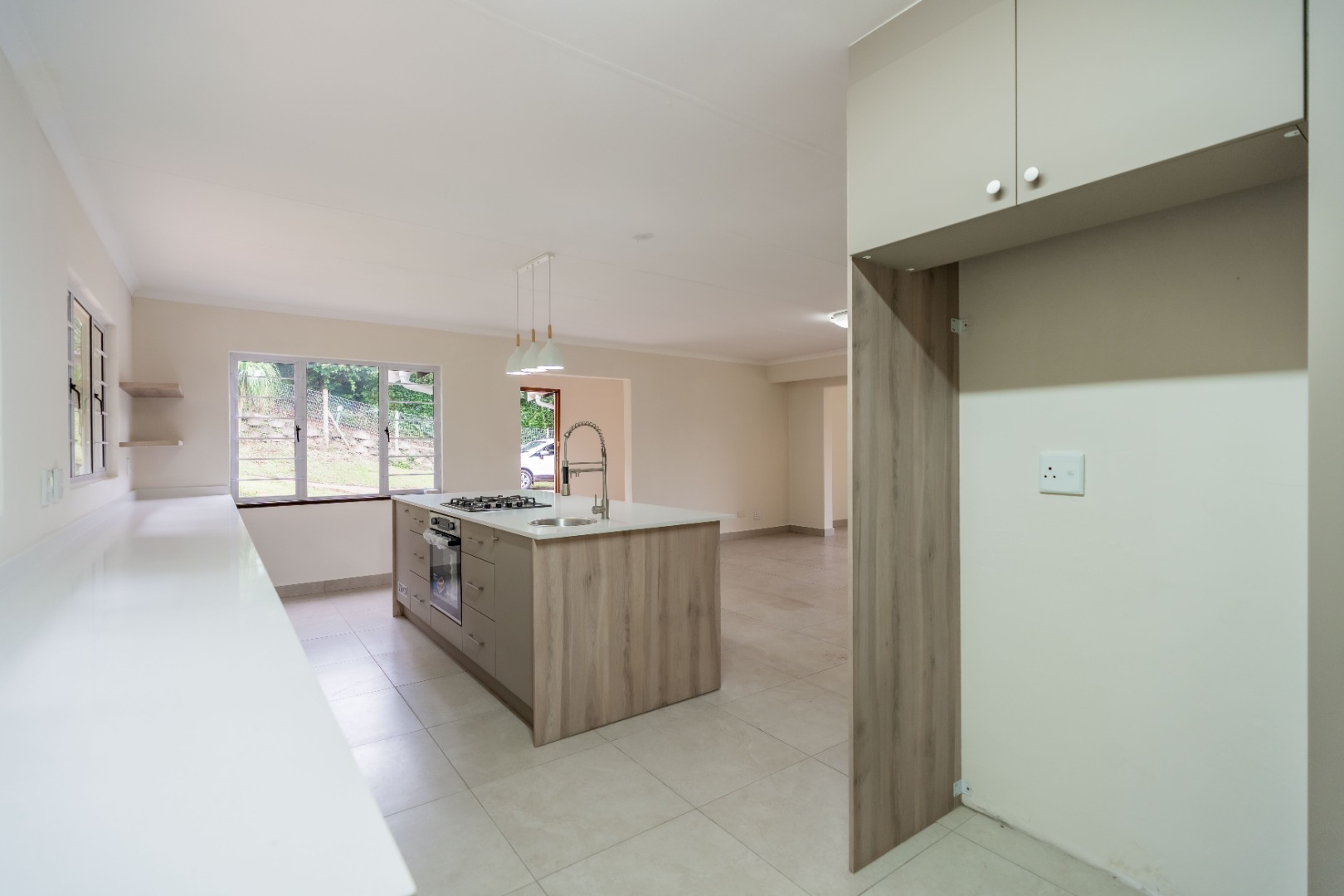 The heart of the home is the open-plan lounge and kitchen, designed for both everyday living and entertaining. The kitchen showcases elegant quartz countertops, a large central island with breakfast nook, gas hob, and electric under-counter oven.