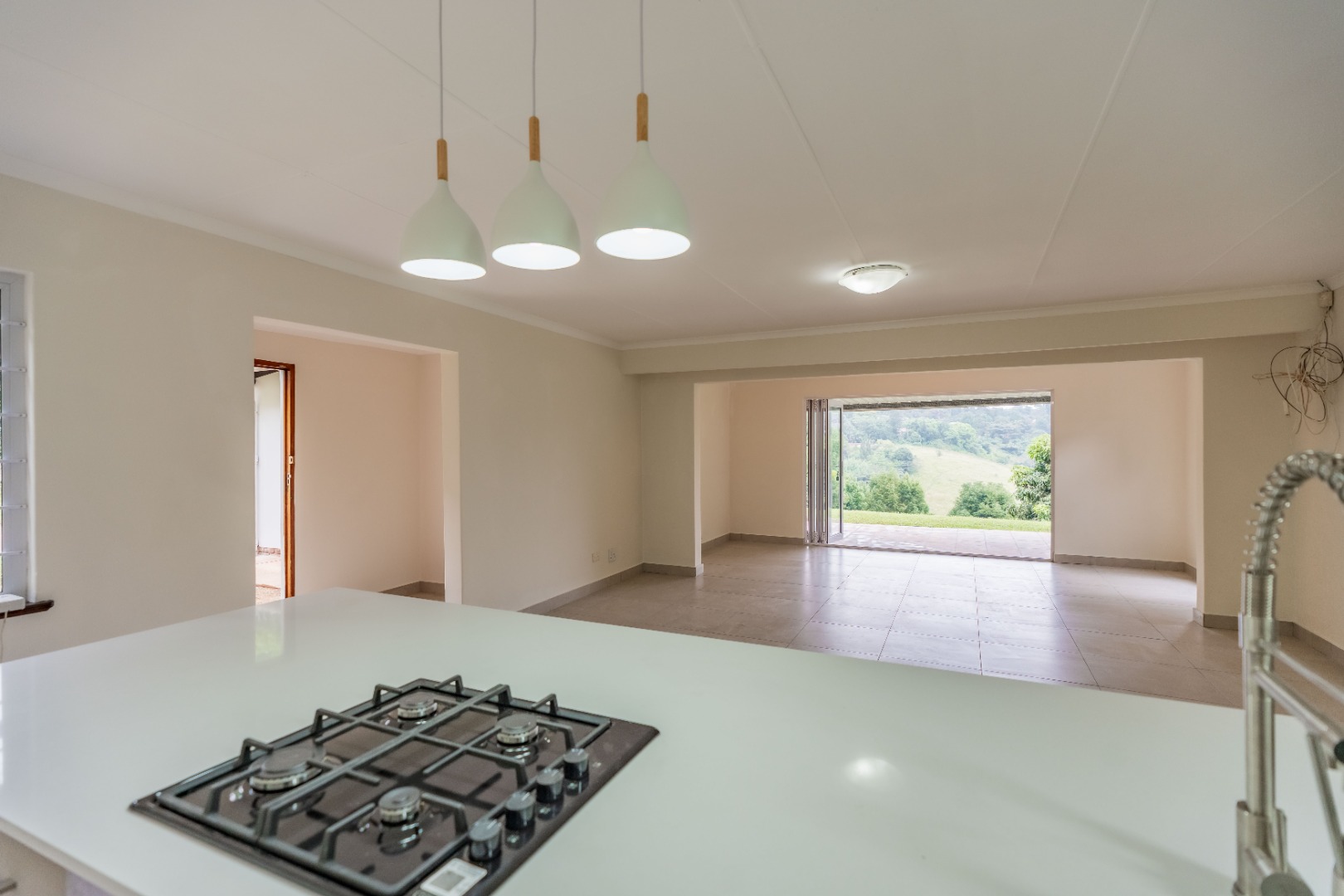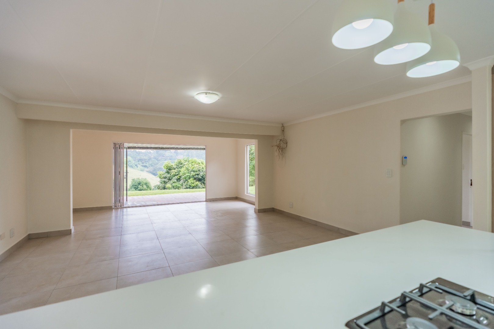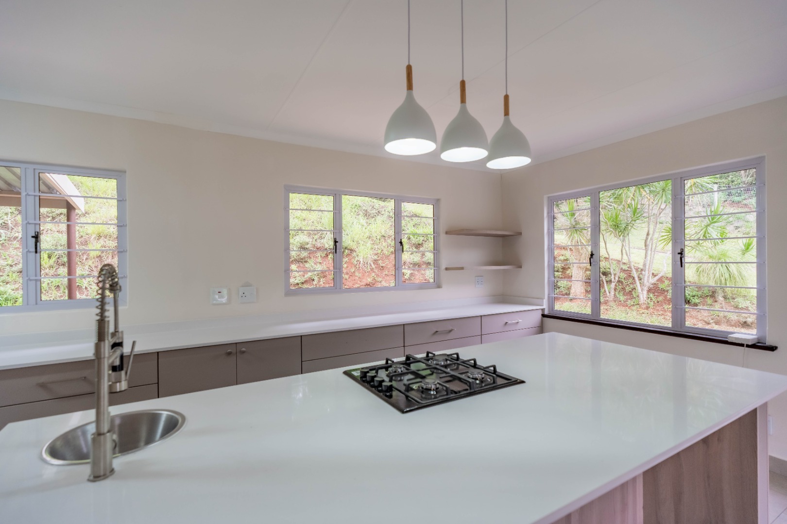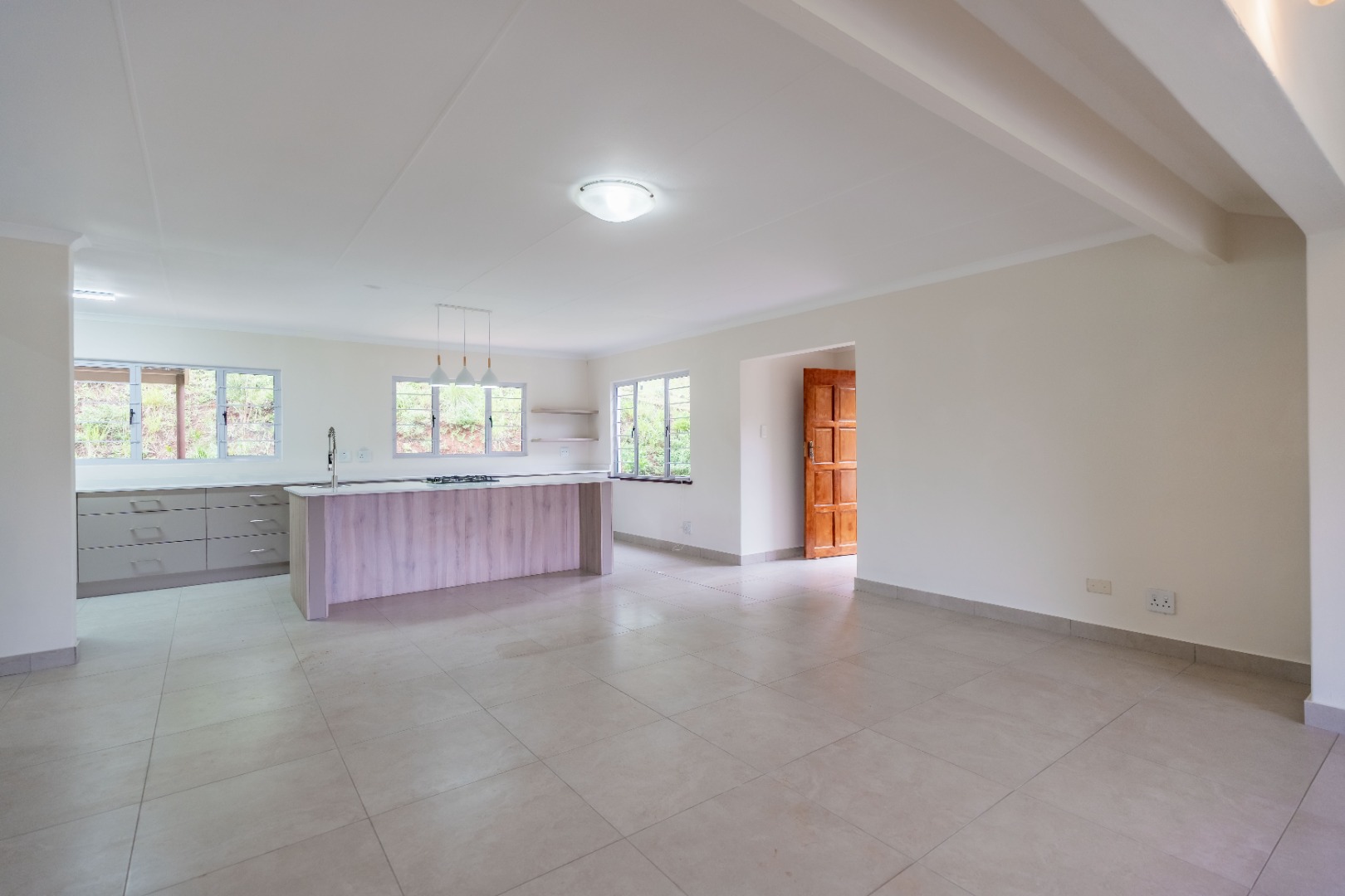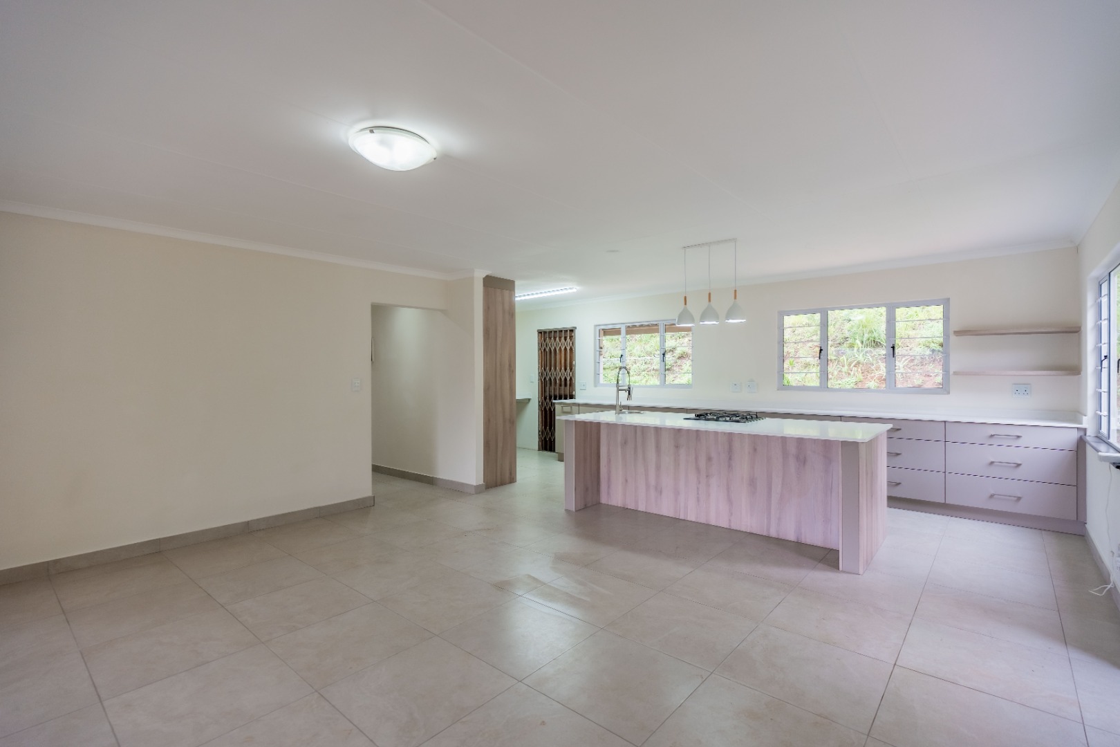 The heart of the home is the open-plan lounge and kitchen, designed for both everyday living and entertaining. The kitchen showcases elegant quartz countertops, a large central island with breakfast nook, gas hob, and electric under-counter oven.