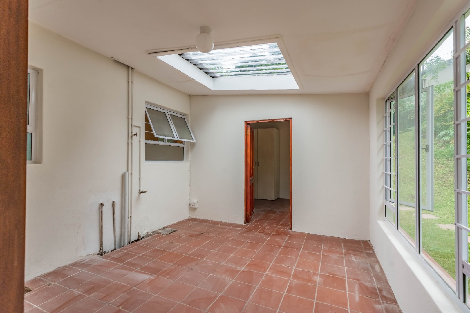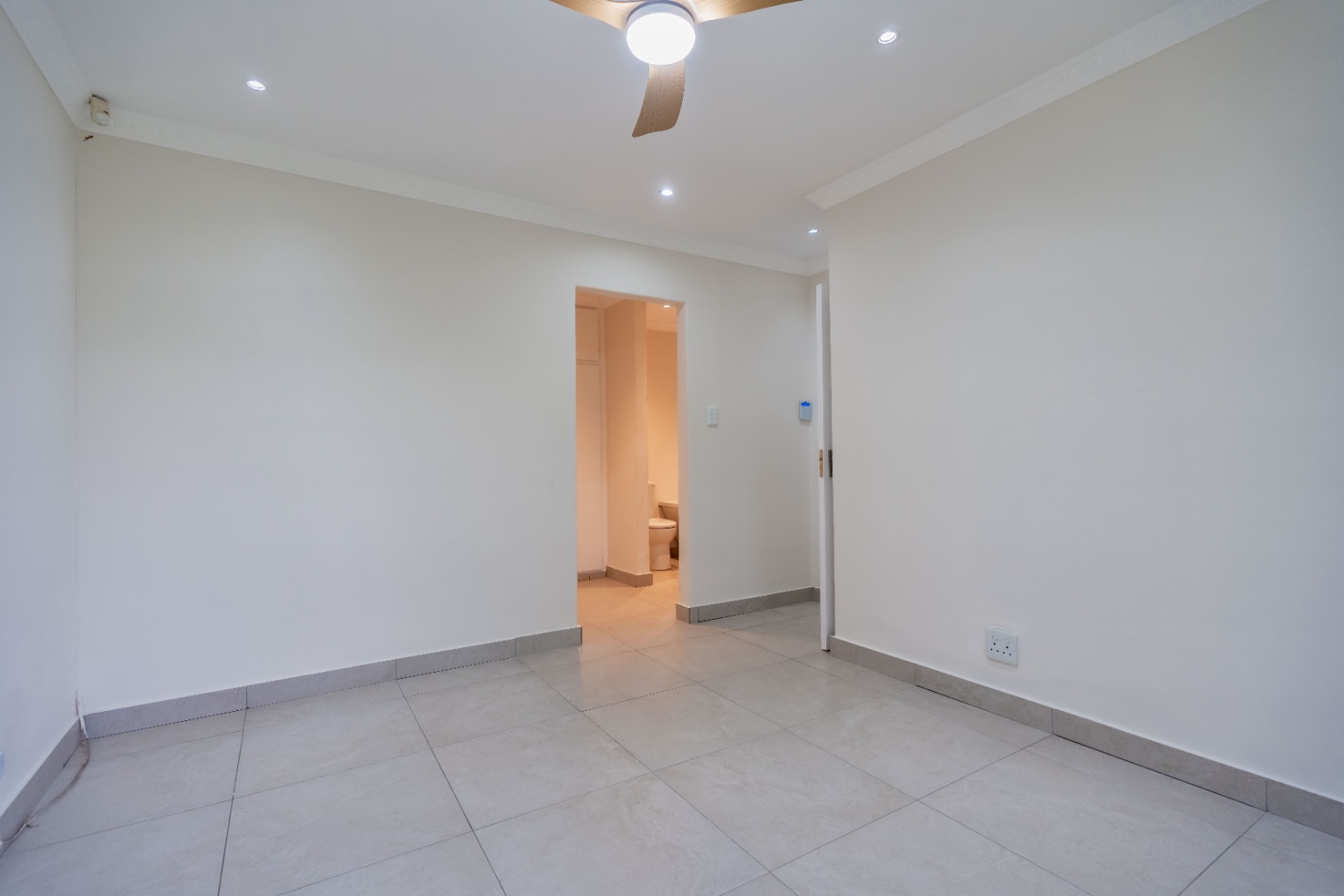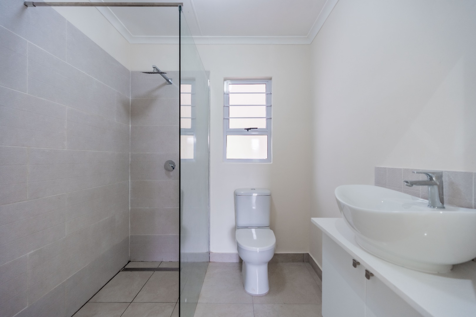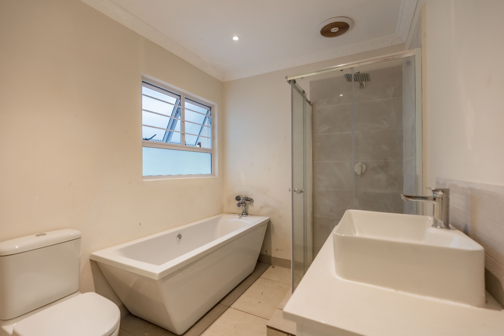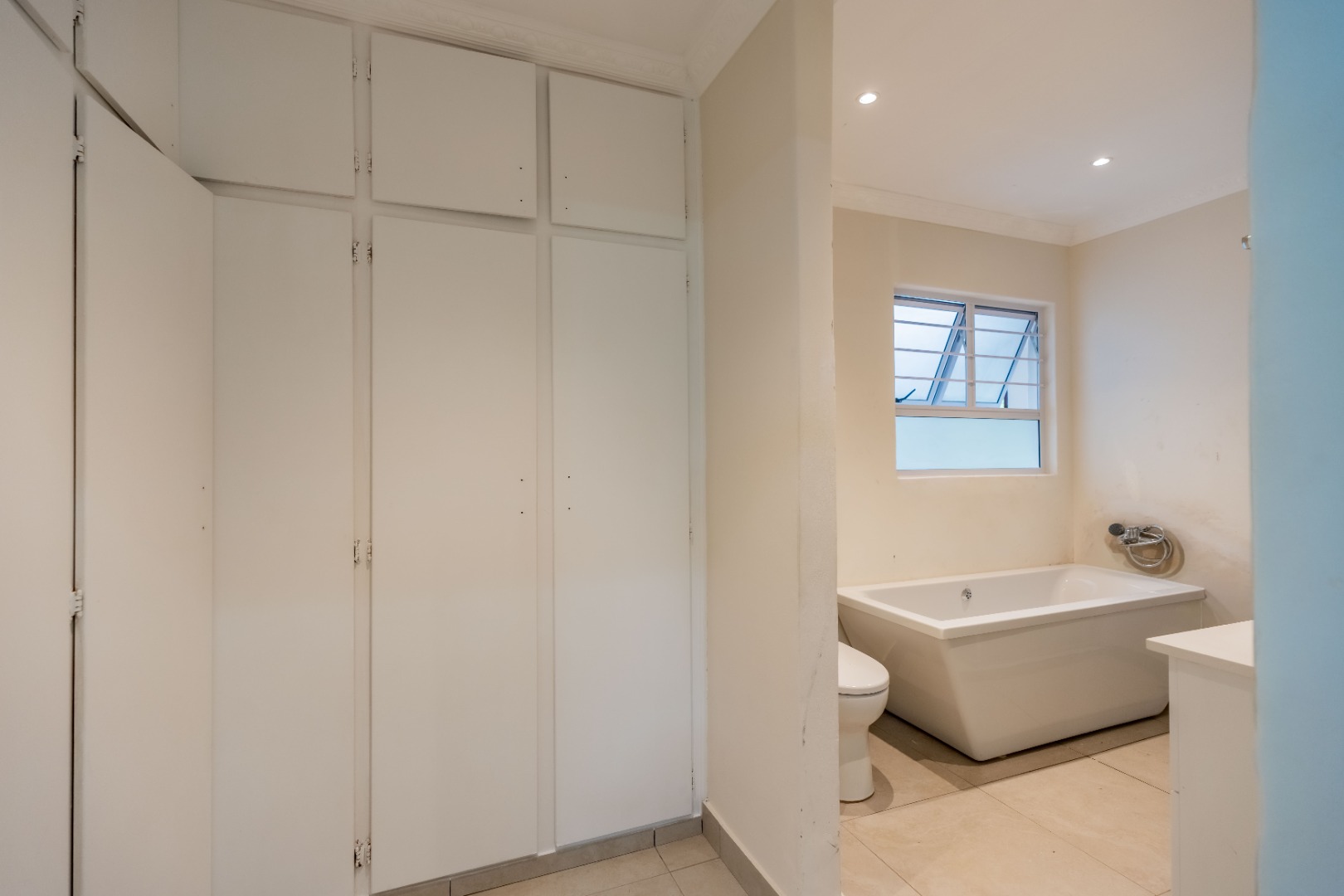 The property features three well-sized bedrooms; all fitted with built-in cupboards. The main bedroom boasts a walk-in closet and a luxurious full en-suite bathroom complete with bath, shower, toilet, and basin. A modern family bathroom with a large shower, toilet, and basin services the remaining bedrooms.