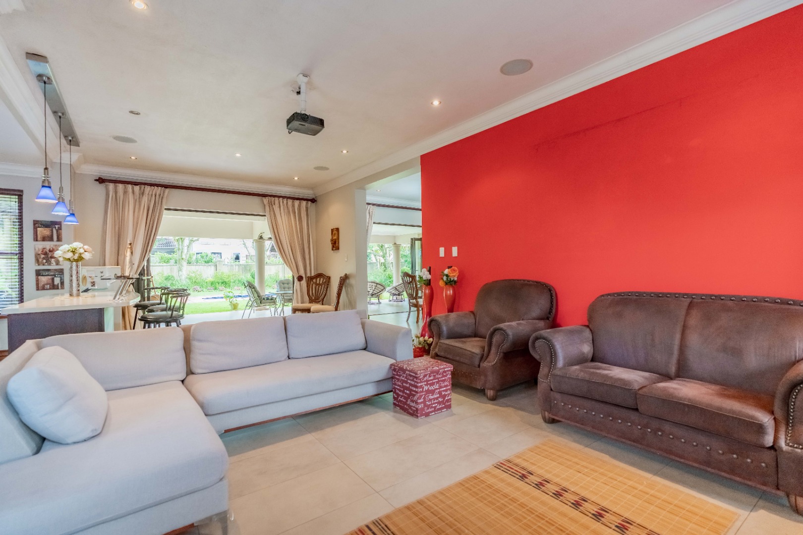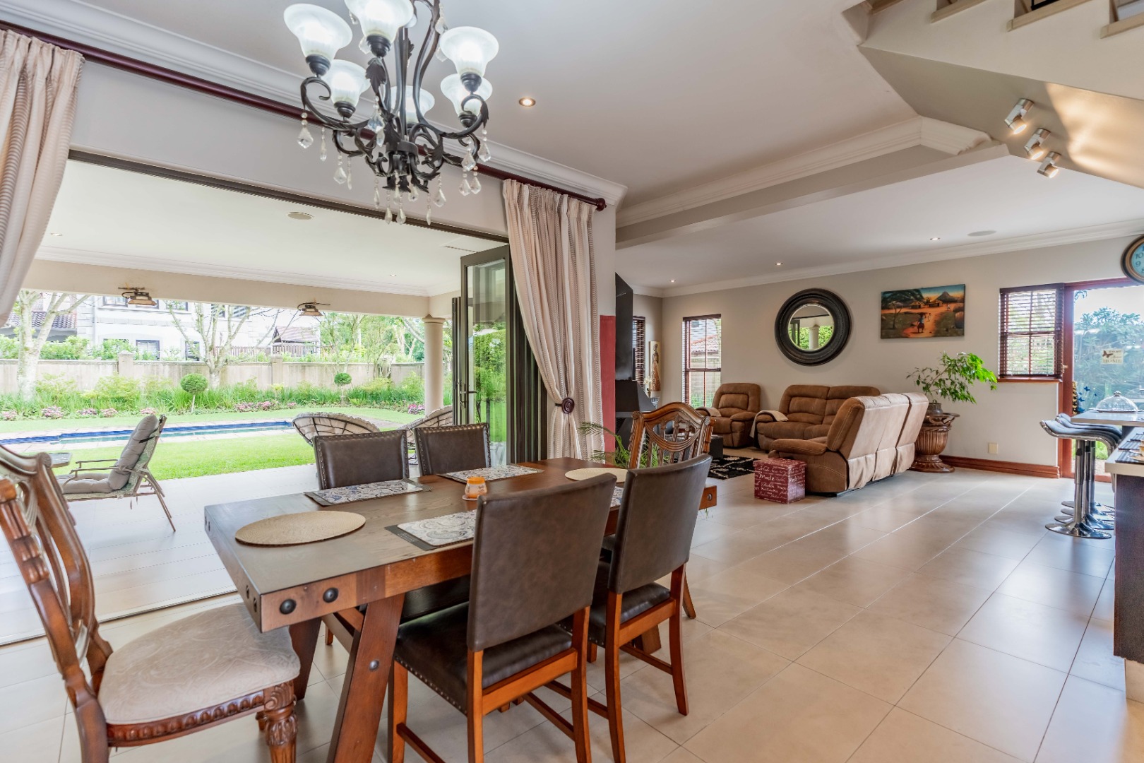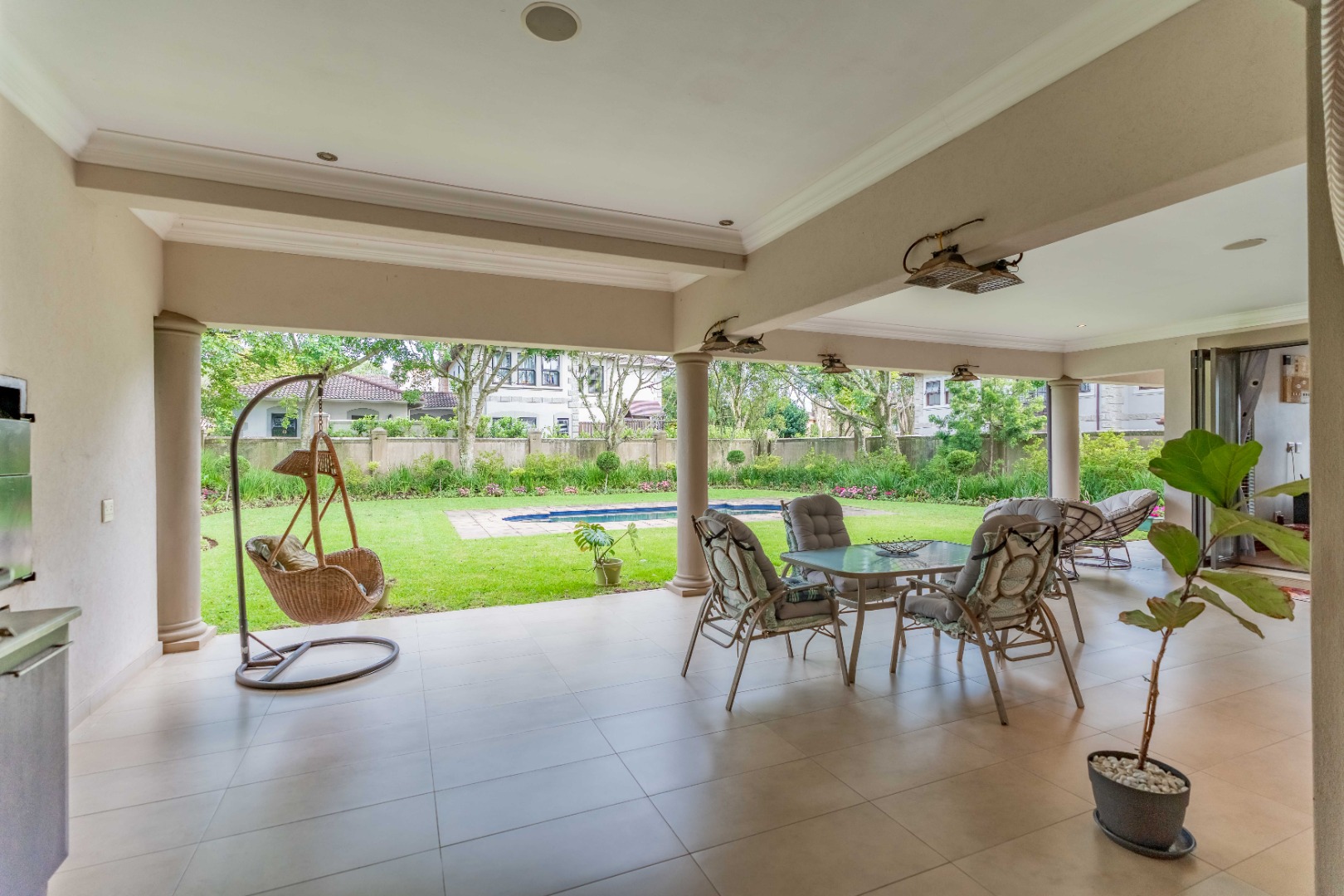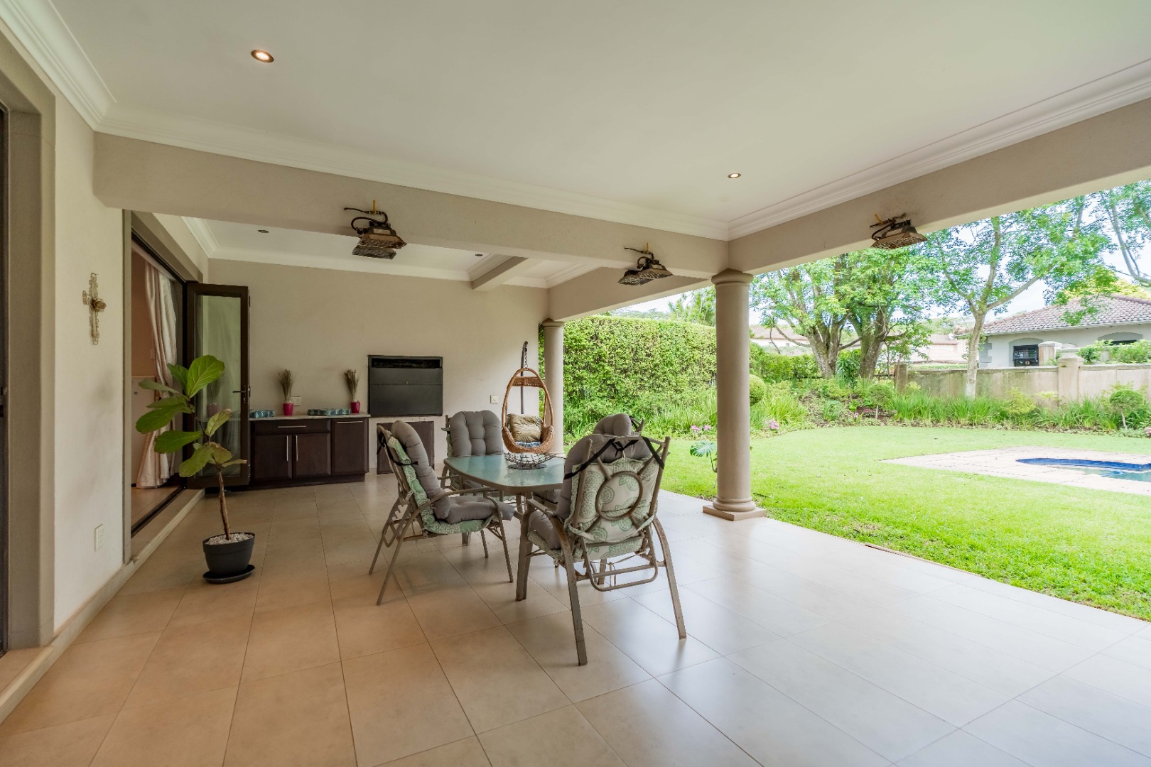 Stack doors open out onto a covered verandah with a built-in braai, overlooking a level garden and pool. It’s a usable outdoor space - easy for kids, easy for entertaining, and low maintenance.